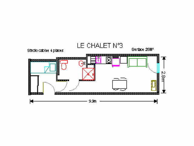 Studio équipé et meublé pour 4 pers, 1°étage, vue station, 25m² , expo nord-est, placard à ski, chauffage central. Entrée coin montagne 2 lits superposés, salle d'eau douche, lavabo, WC, sèche cheveux. Séjour canapé lit 2 pl, TV. Cuisine: plaque vitro 2 feux, frigo,four, MO, LV, cafetière élec, grille pain, robot. NON FUMEUR. DRAPS FOURNIS.