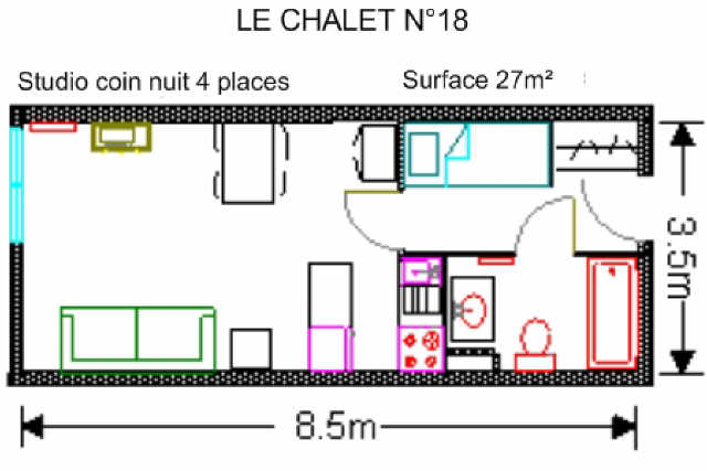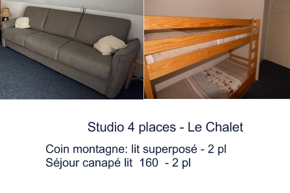 Entrée coin montagne 2 lits superposés, sdb lavabo, baignoire, sèche cheveux et WC. Séjour canapé lit 2 pl, TV. Cuisine: plaque vitro 4 feux, four, frigo, LV, MO, cafetière élec, grille pain, robot. NON FUMEUR. DRAPS FOURNIS.