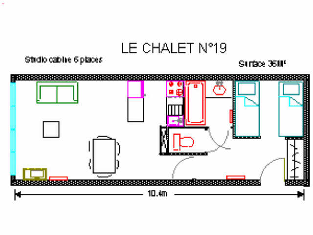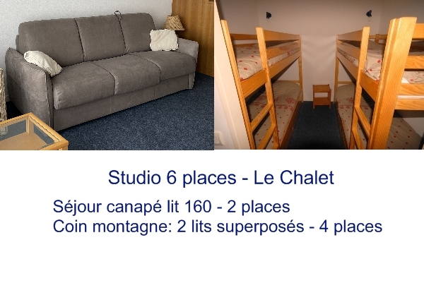 Studio équipé et meublé pour 6 pers, 3°étage, vue pistes, 36m² , expo Sud-Ouest, placard à ski, chauffage élec. Entrée coin montange 2x2 lits superposés, sdb lavabo, baignoire, sèche cheveux et WC indépendants. Séjour canapé lit 2 pl, TV. Cuisine: plaque vitro 4 feux, four, frigo ,LV, MO, cafetière élec, grille pain, robot. NON FUMEUR. DRAPS FOURNIS.