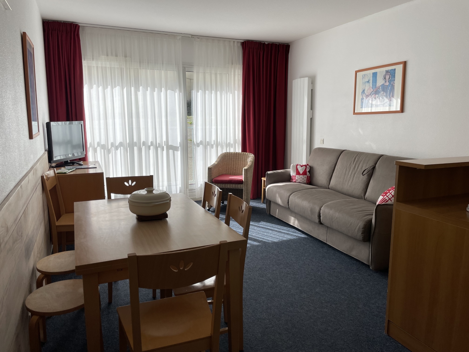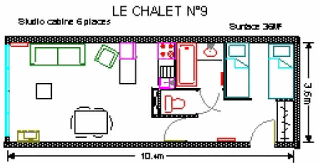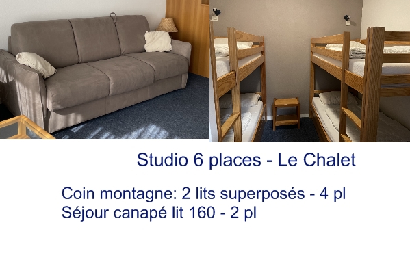 Studio équipé et meublé pour 6 pers, 1°étage, vue pistes, 36m² , expo Sud-Ouest, placard à ski, chauffage élec. Entrée coin montange 2x 2 lits superposés, sdb lavabo, baignoire, sèche cheveux et WC indépendants. Séjour canapé lit 2 pl, TV. Cuisine: plaque vitro 4 feux, four, frigo, LV, MO, cafetière élec, grille pain, robot. NON FUMEUR. DRAPS FOURNIS.