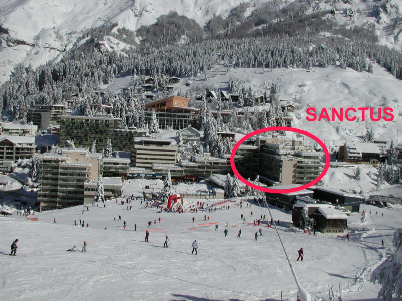 Résidence Sanctus n°23 sur le plan de la station, accessible à pied par un cheminement délimité sur 100 m. Les pistes de ski sont situées à 250 mètres (en raison de travaux) et les commerces à 150 mètres.