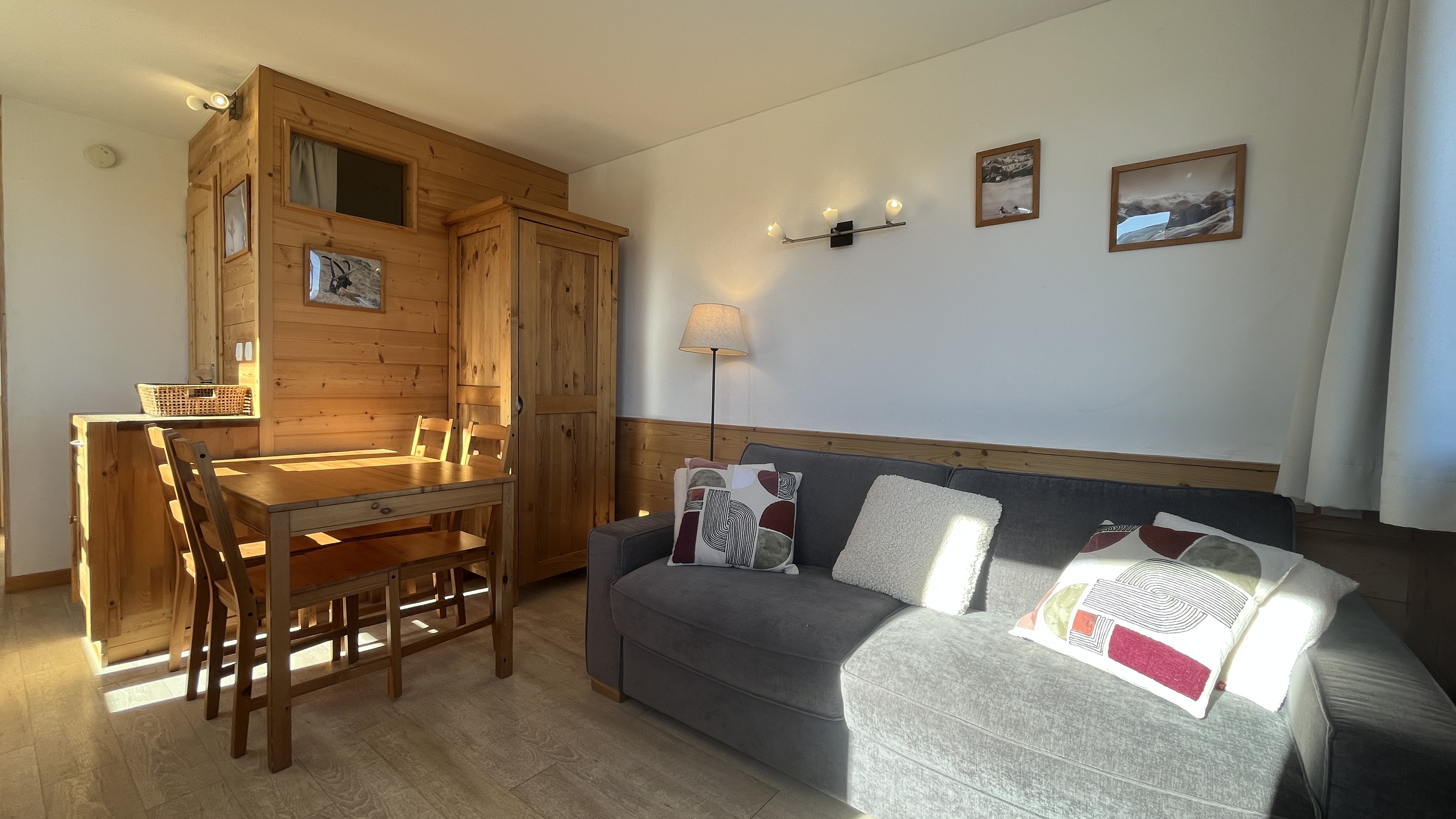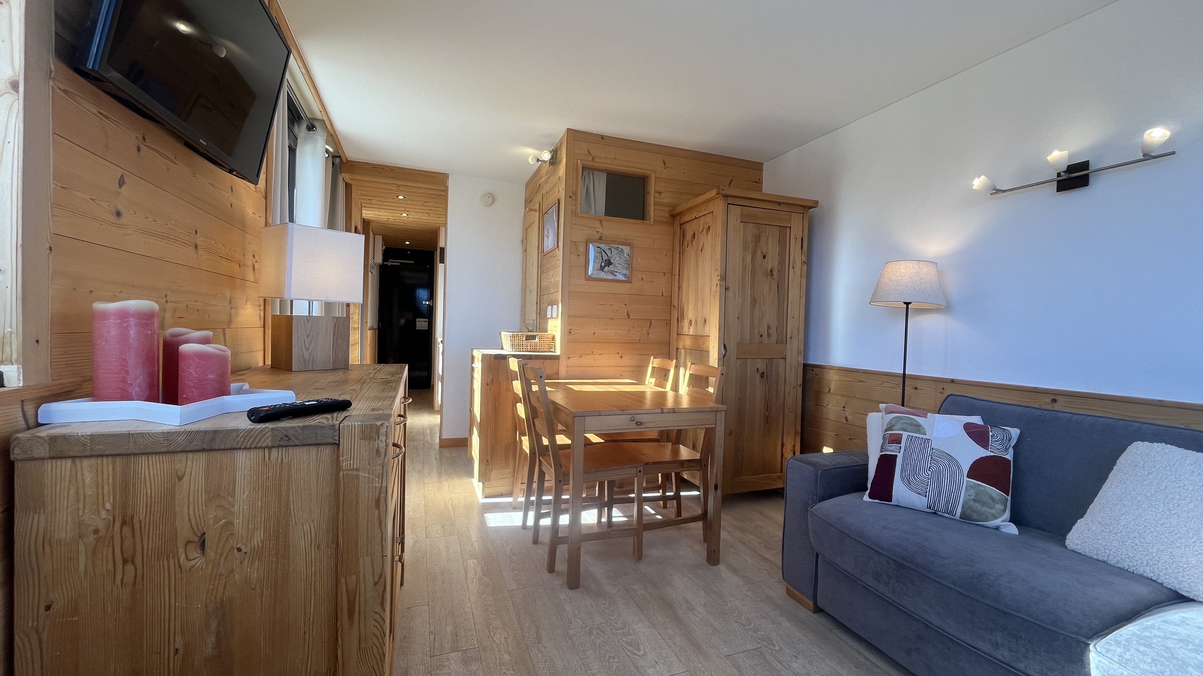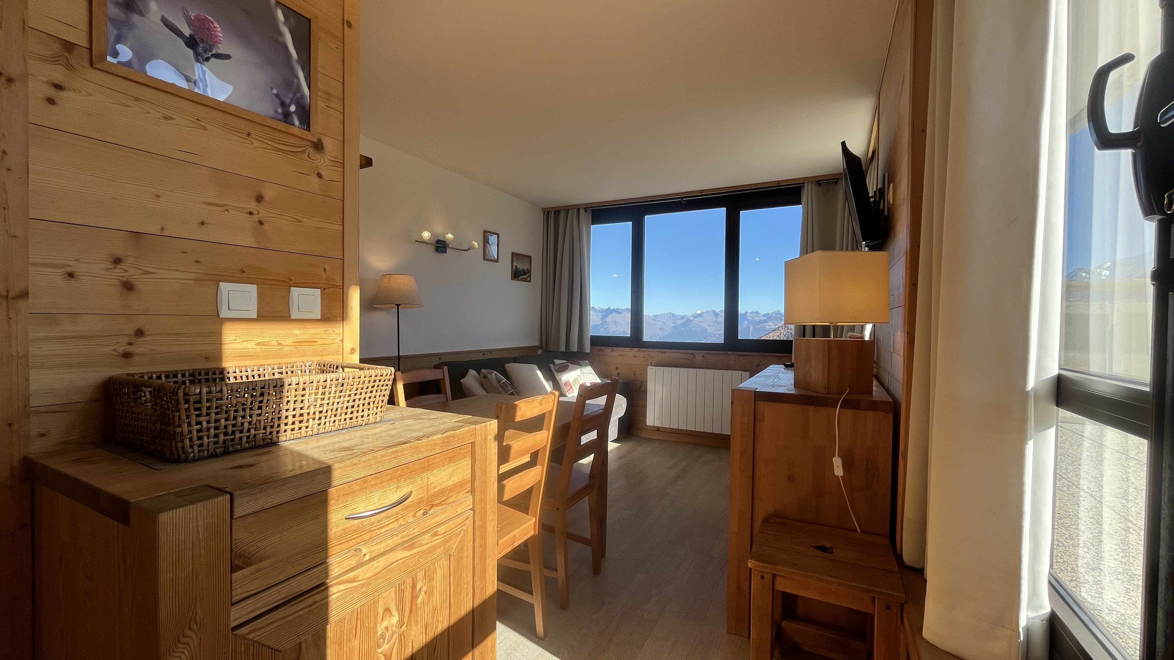 Ce très joli studio d'environ 26 m² entièrement rénové bénéficie d'une petite chambre fermée, d'un WC séparé, d'une grande terrasse d'angle avec vue sur les pistes et le Mont-Blanc