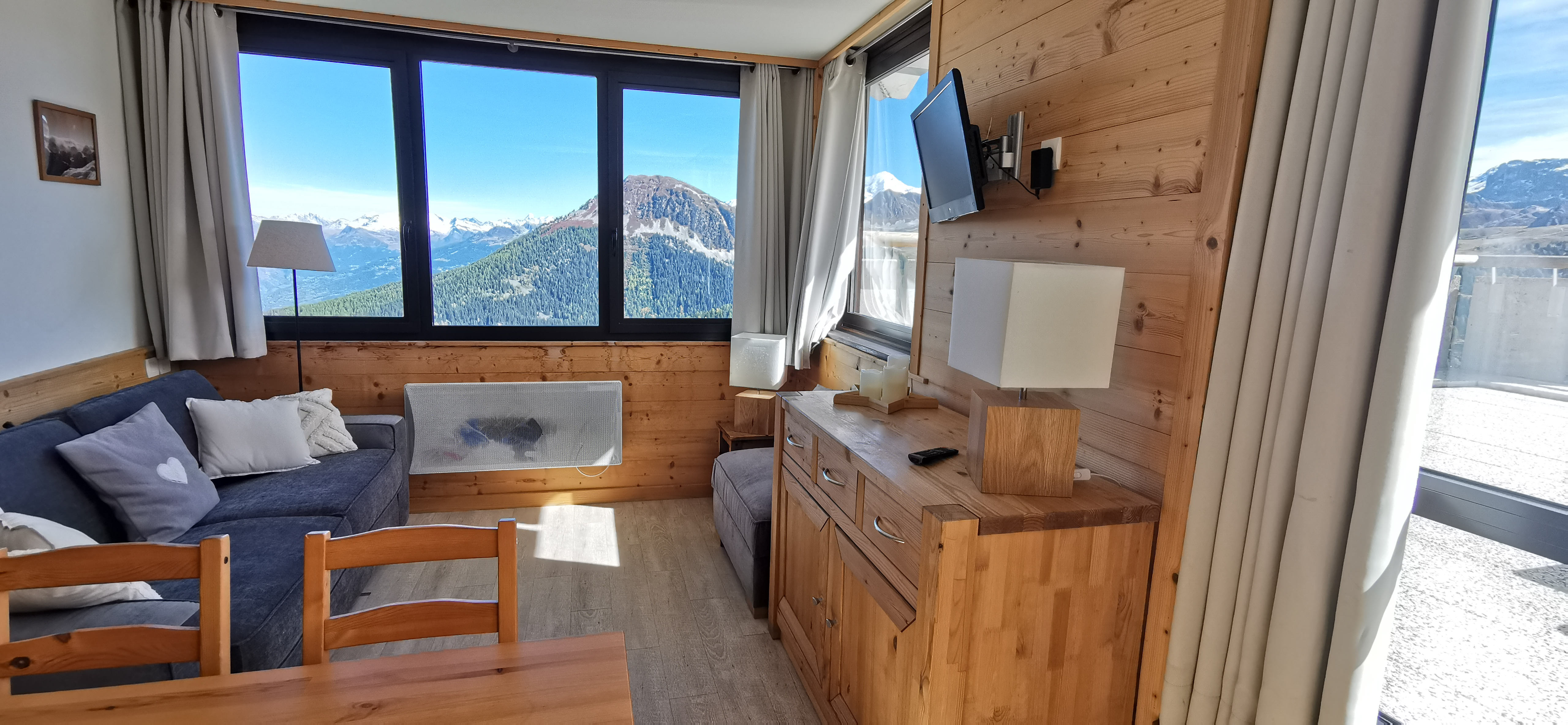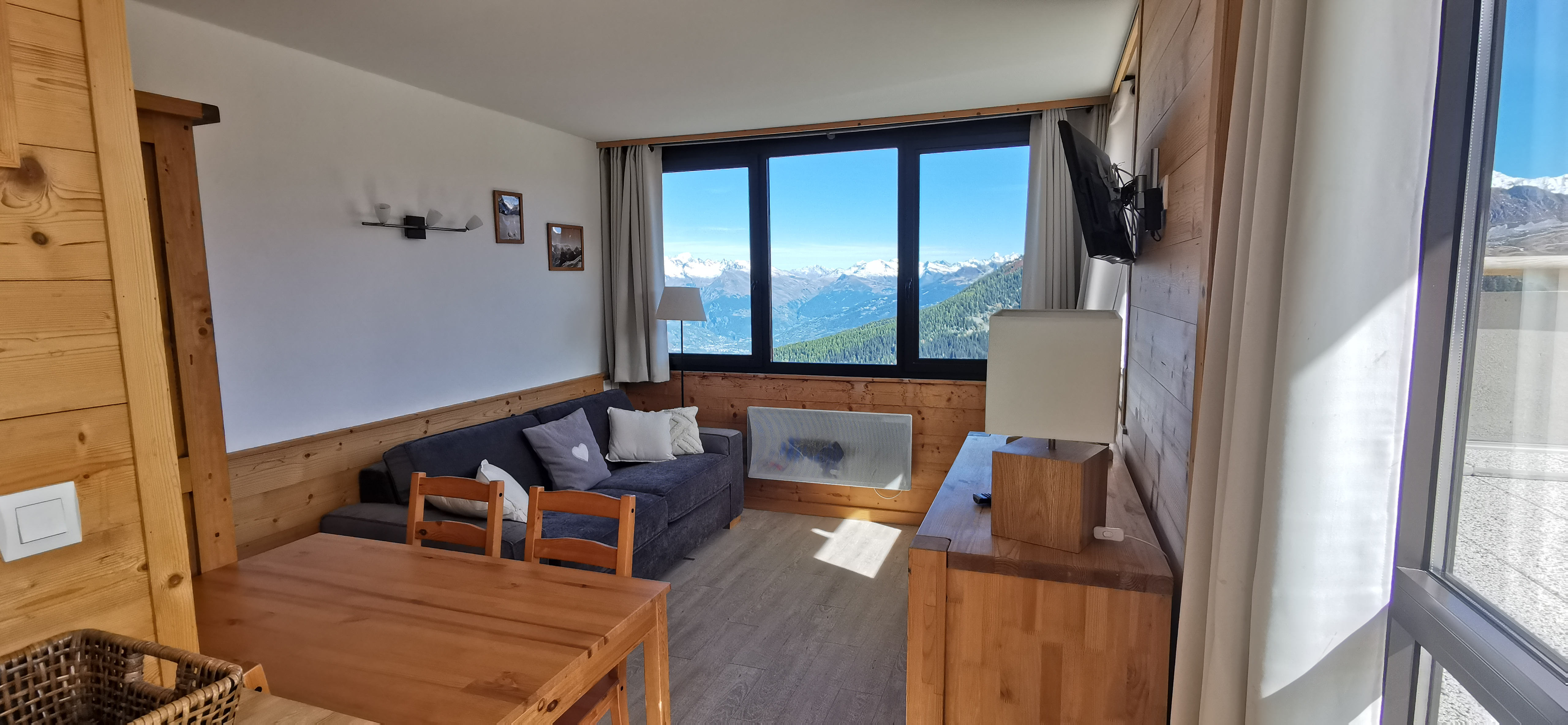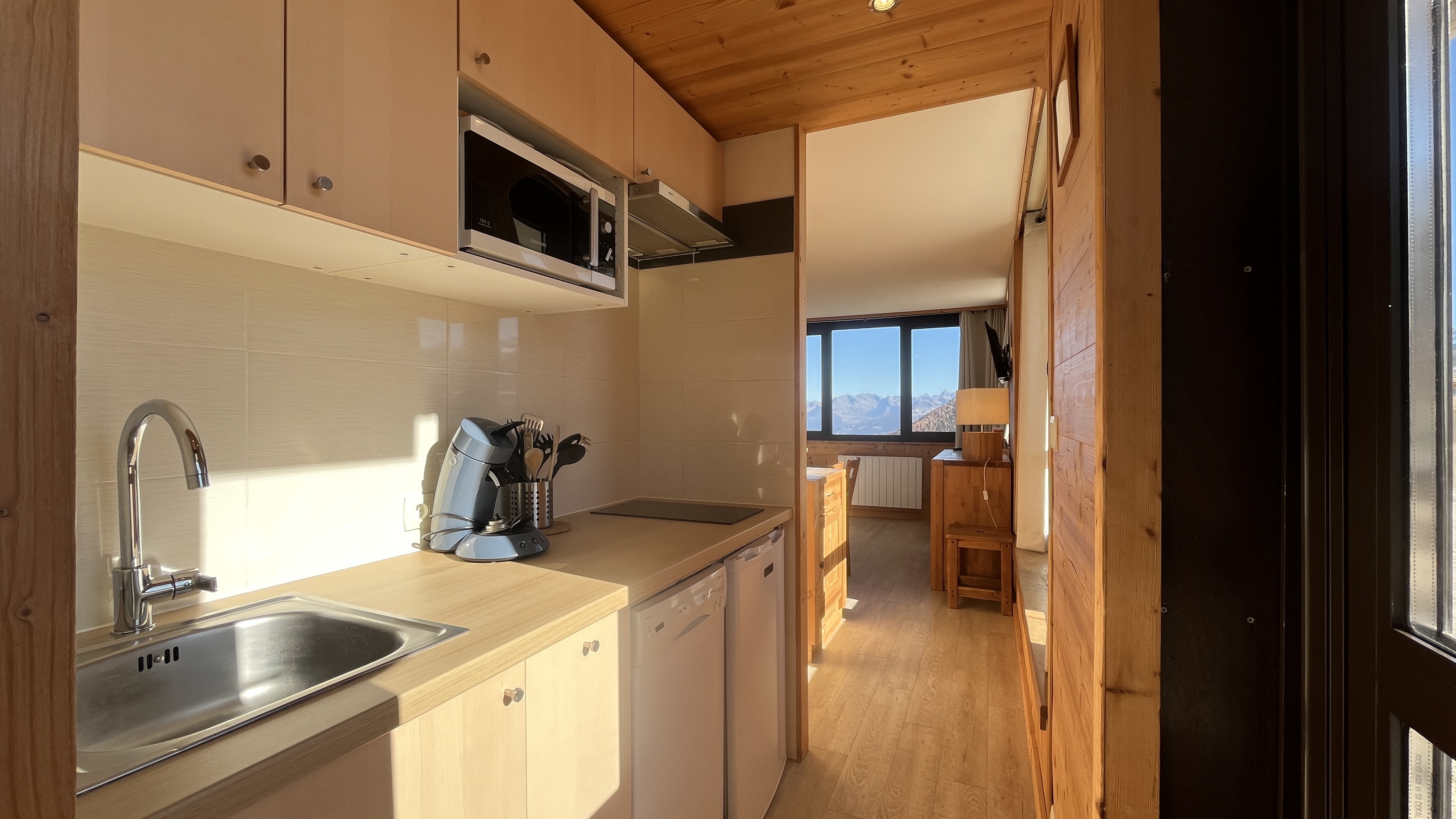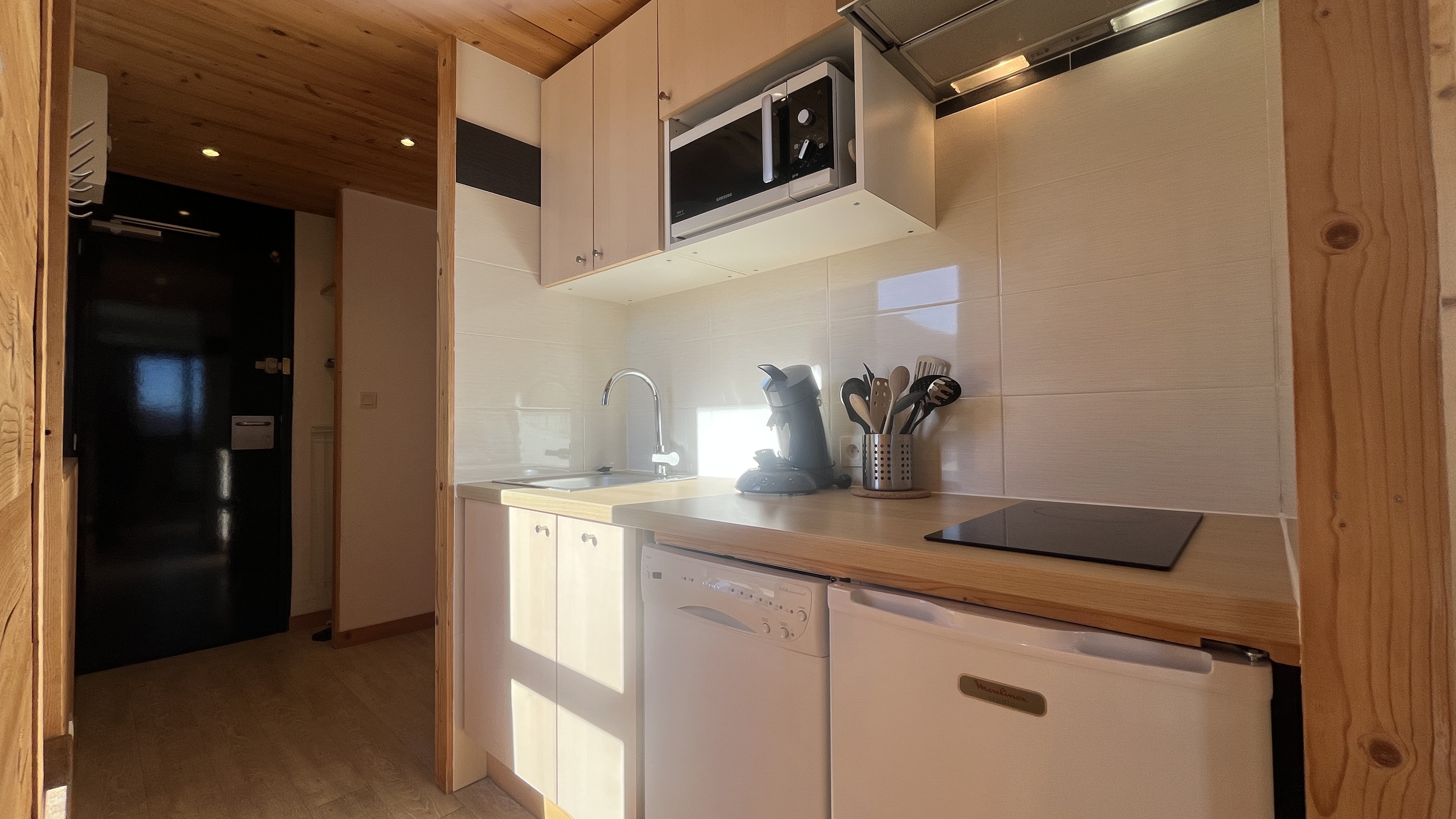 Ce très joli studio d'environ 26 m² entièrement rénové bénéficie d'une petite chambre fermée, d'un WC séparé, d'une grande terrasse d'angle avec vue sur les pistes et le Mont-Blanc