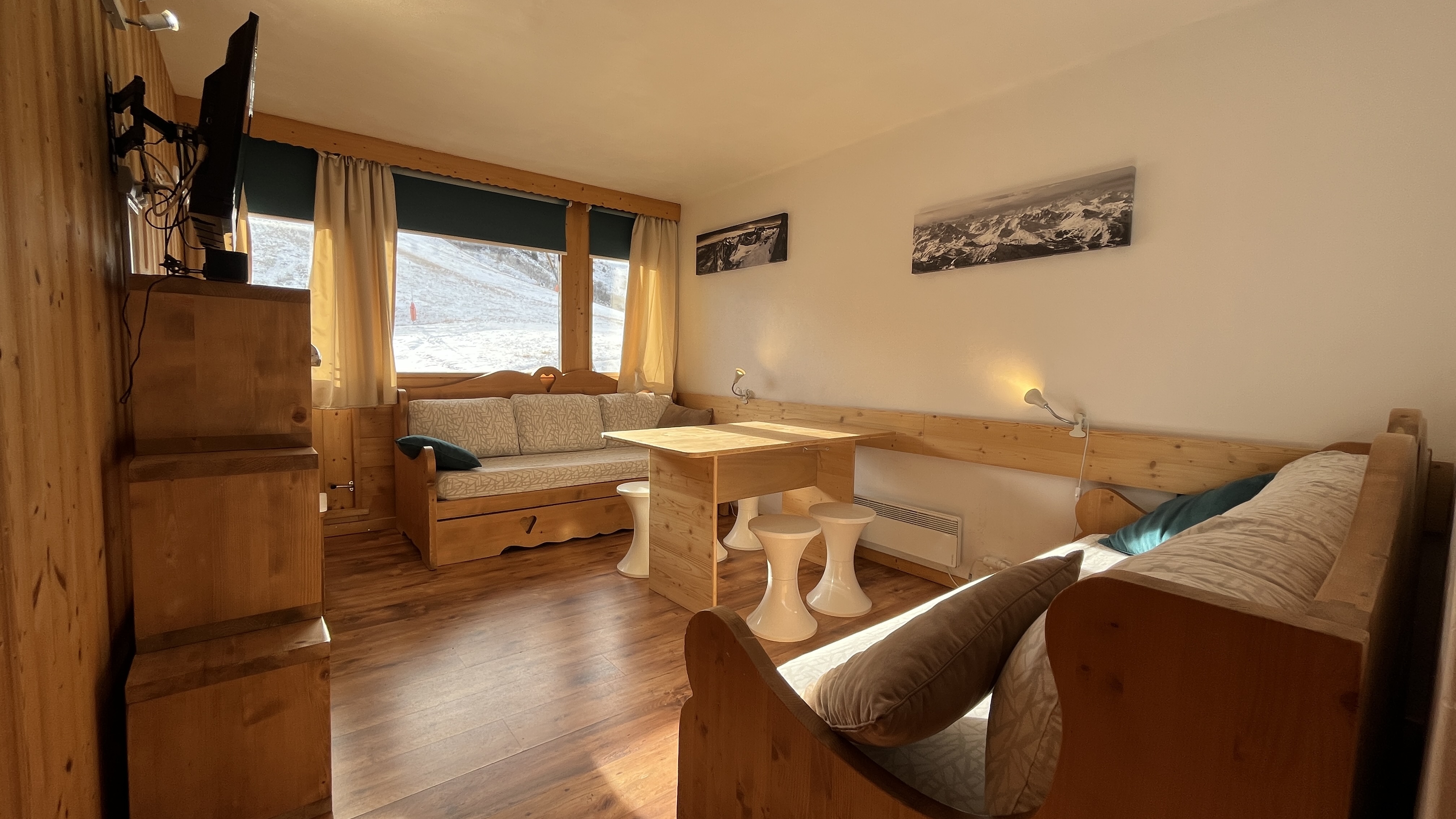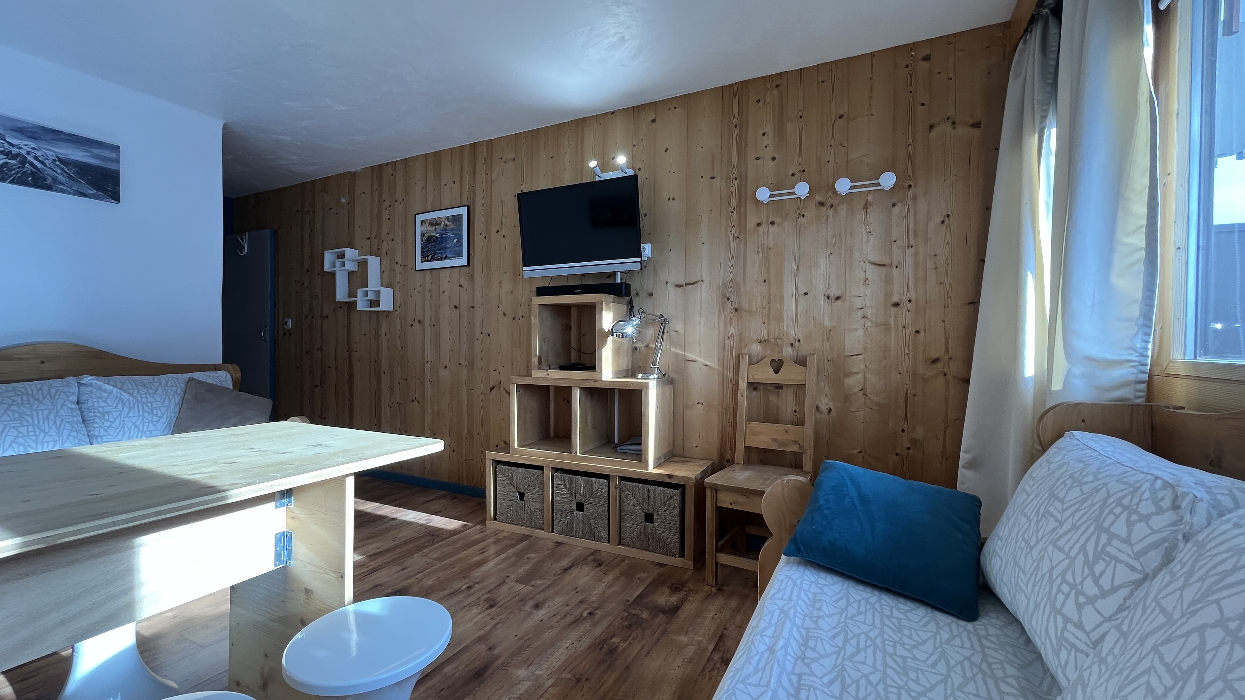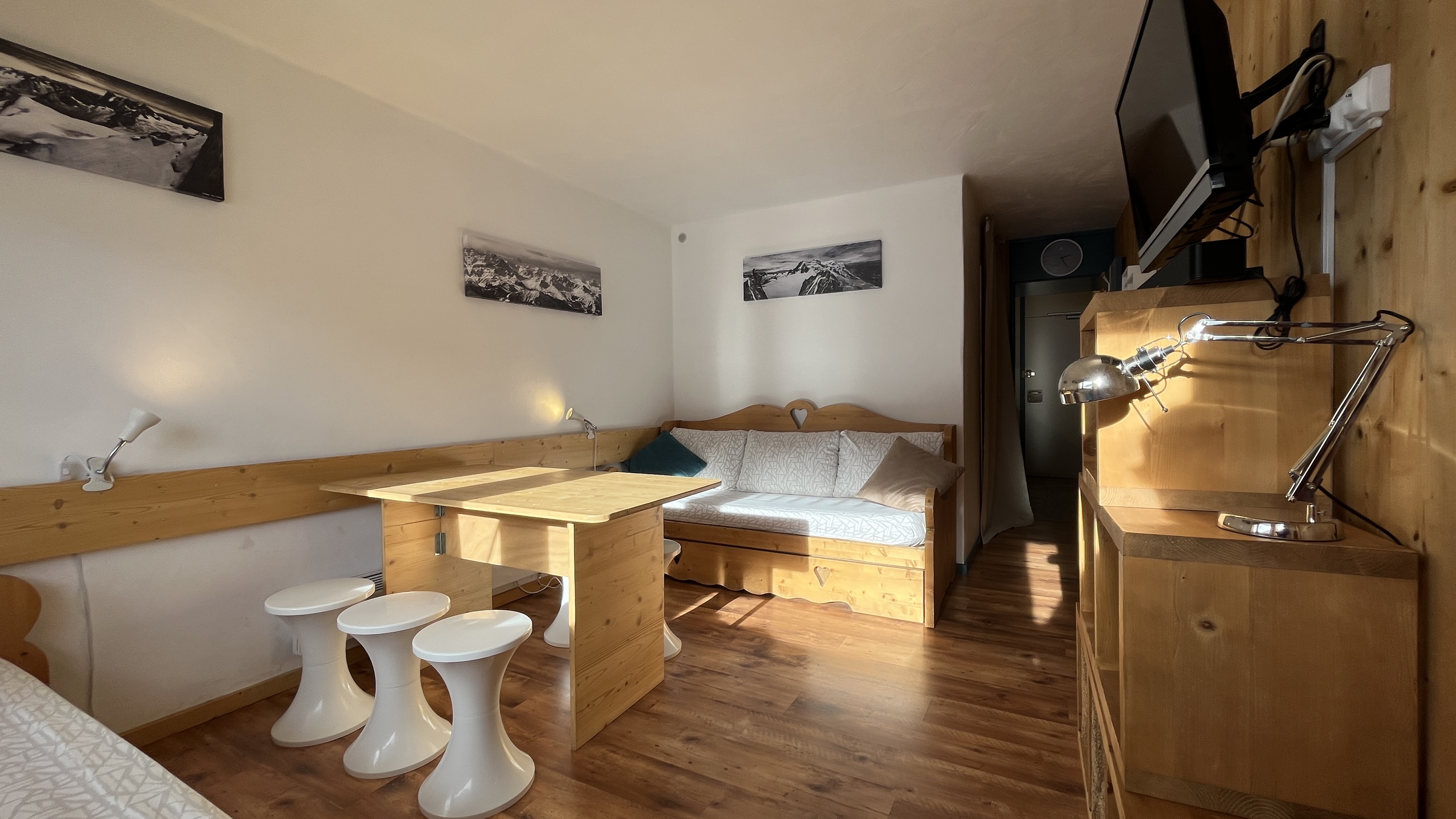 Ce très beau studio d'environ 26 m² entièrement rénové bénéficie d'un coin nuit et d'un balcon exposé Sud/Ouest avec vue sur les pistes.