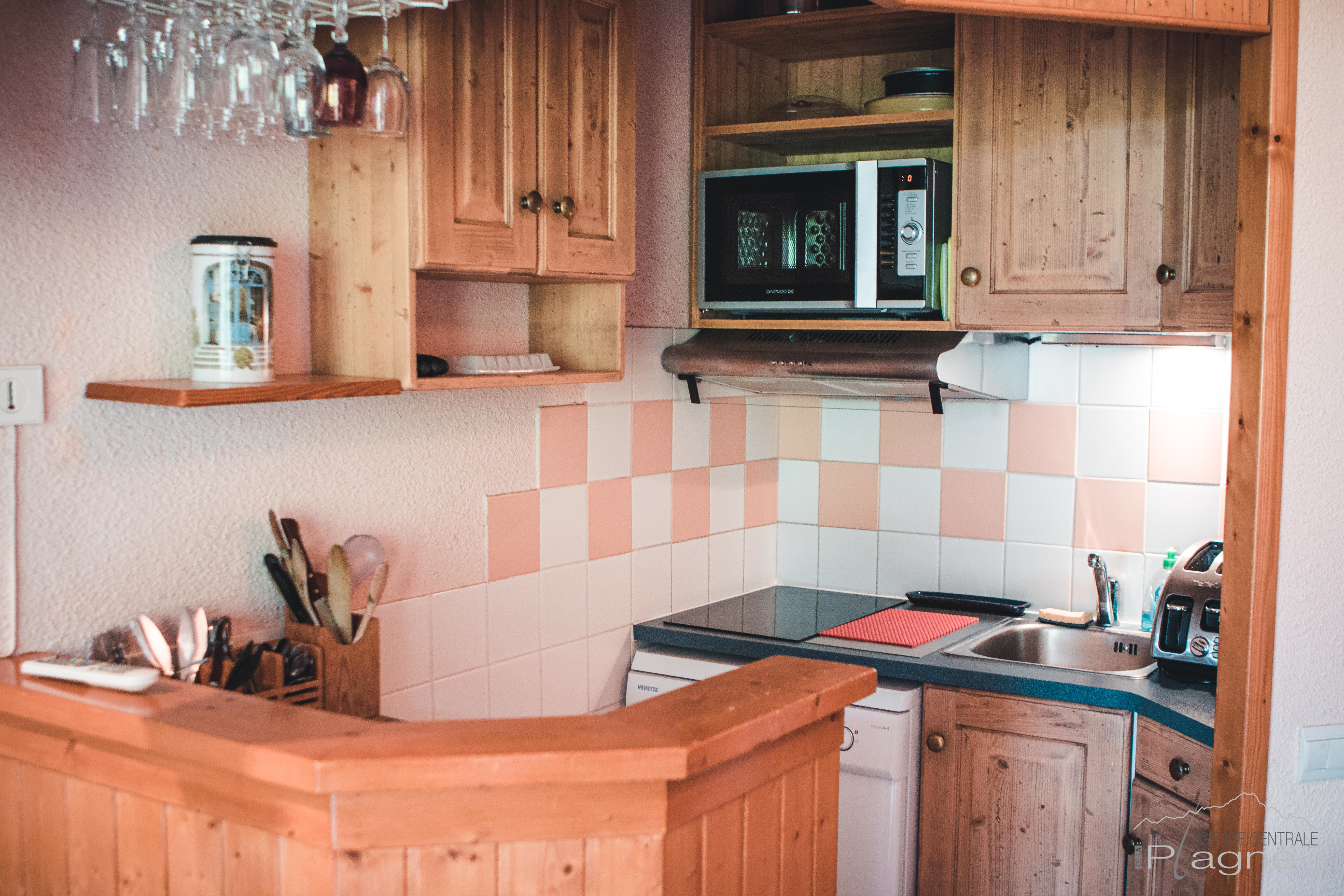 Cuisine : 2 Plaques vitro, 1 micro ondes (mixte), 1 LV, 1 hotte, cafetière électrique