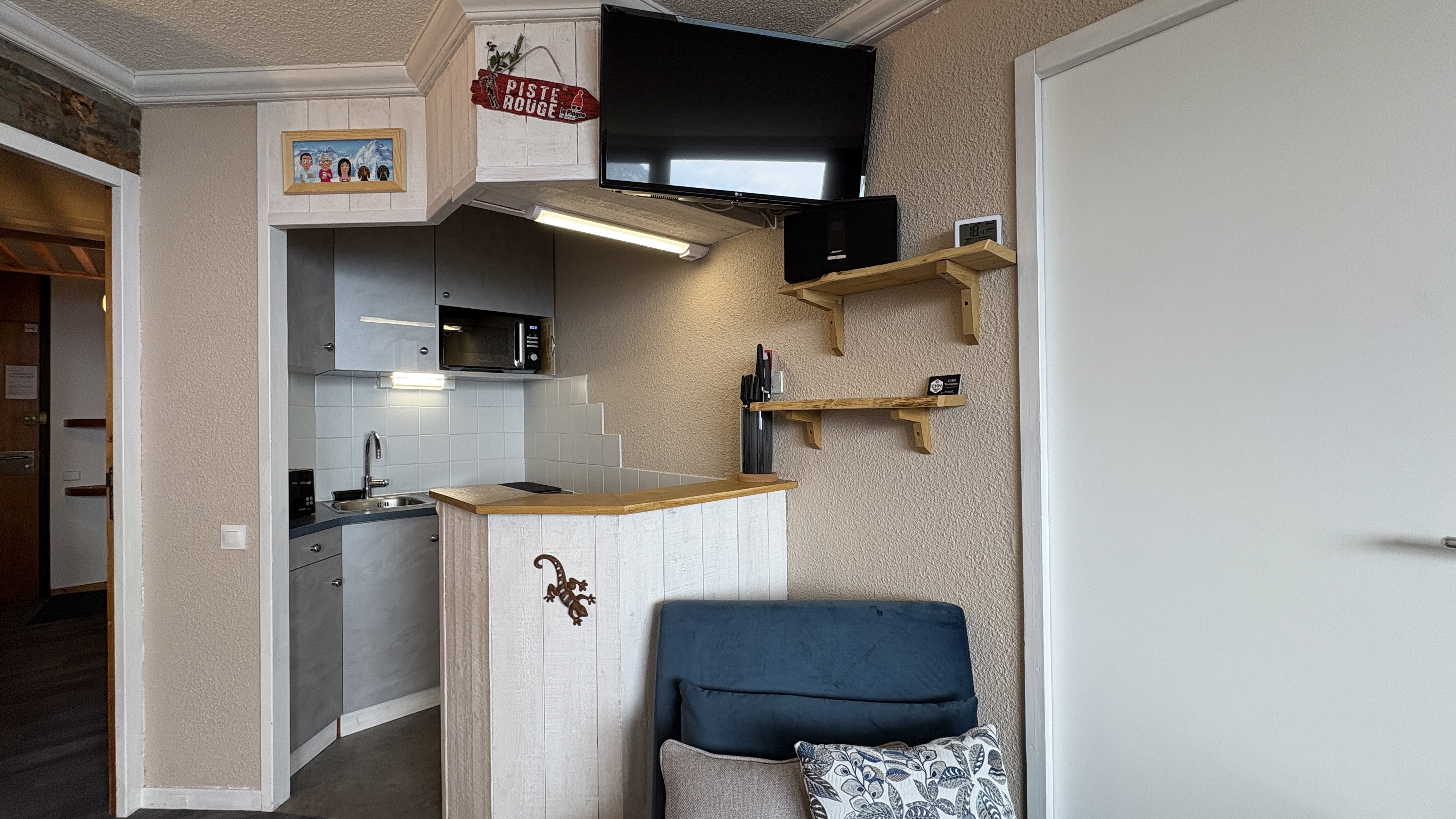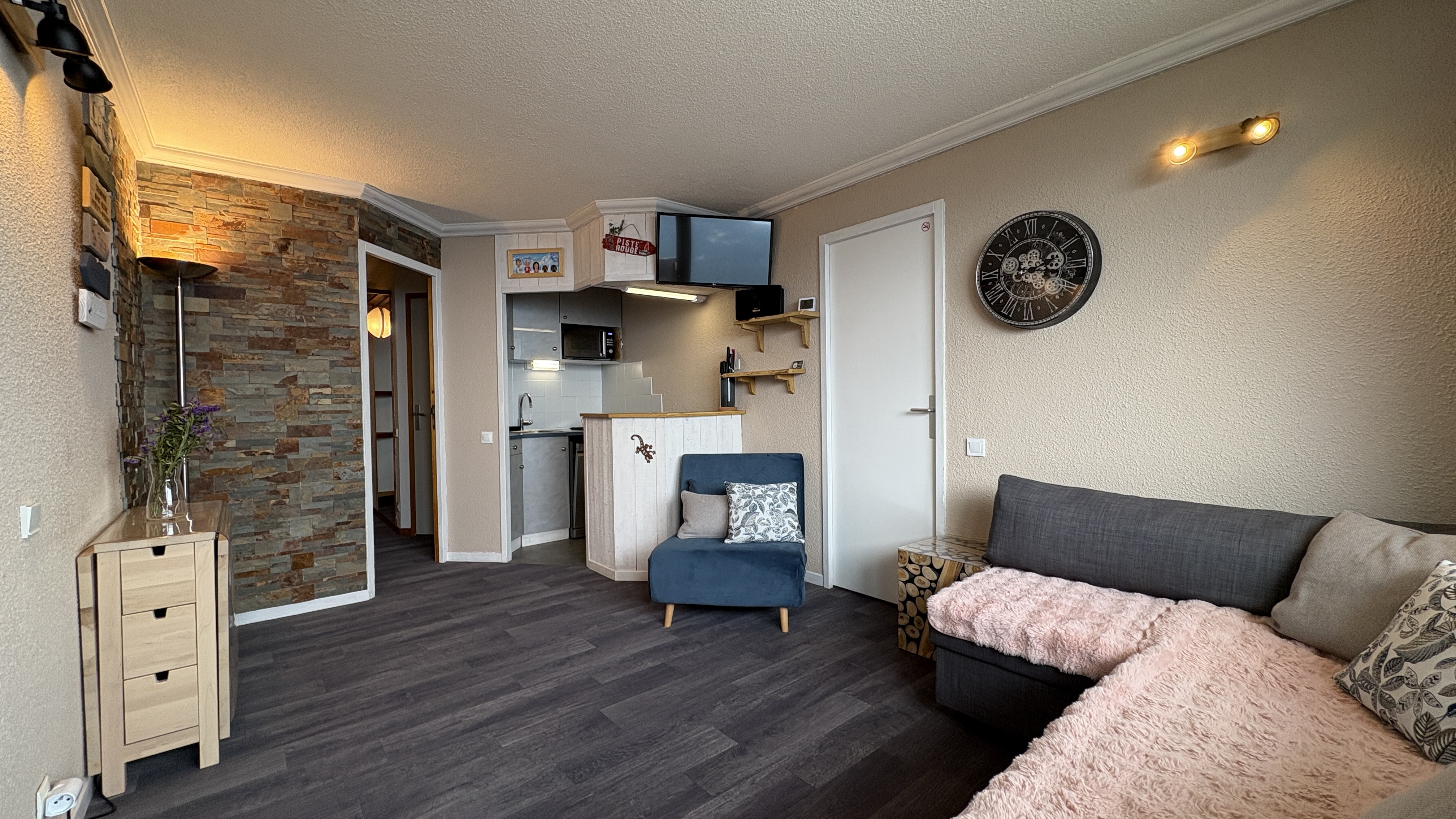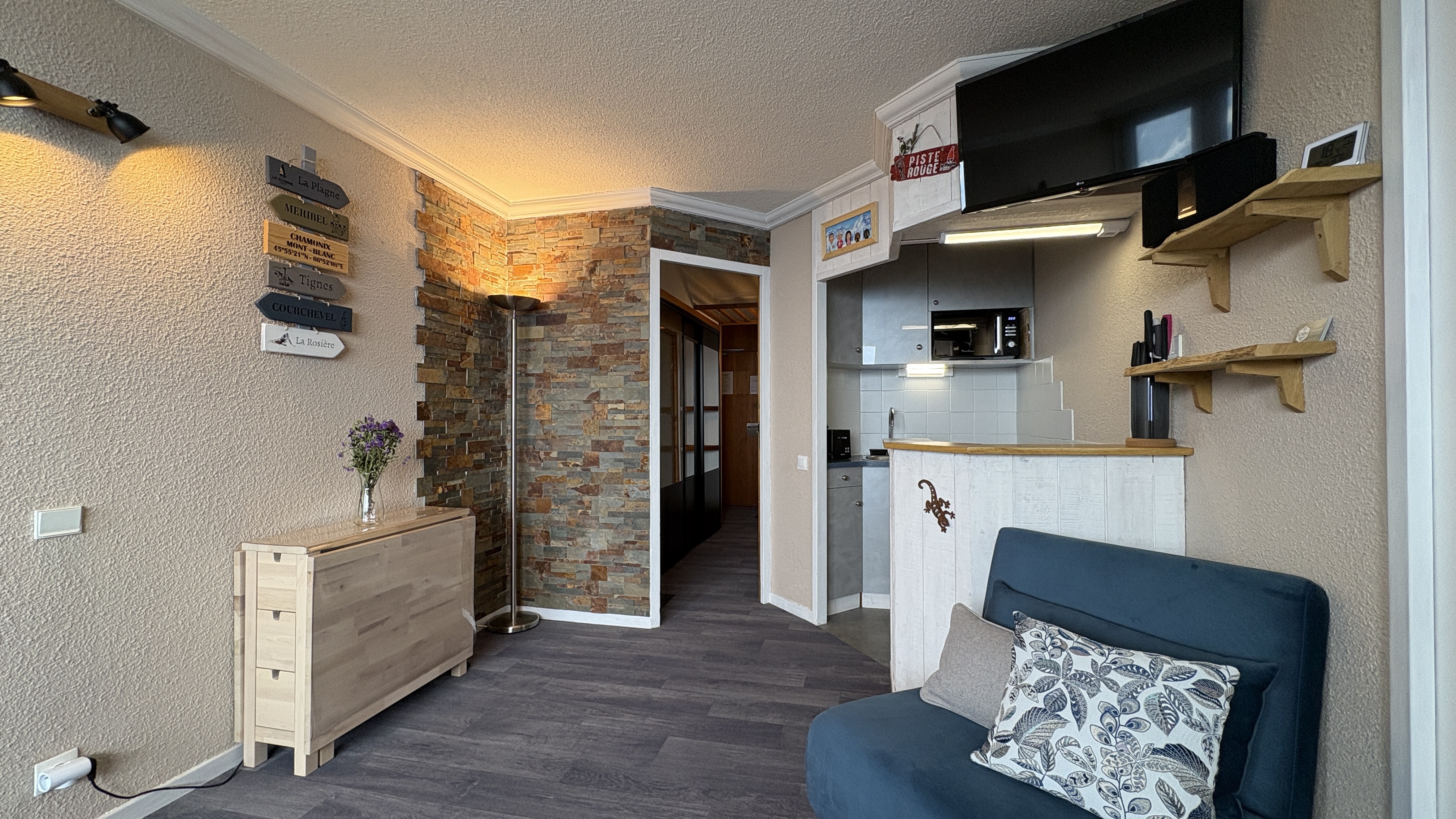 Joli 2 pièces rénové d'environ 36m² qui bénéficie d'une chambre double, un WC séparé, un balcon exposé Nord/Est avec une très belle vue sur le Mont-Blanc et la Vallée.