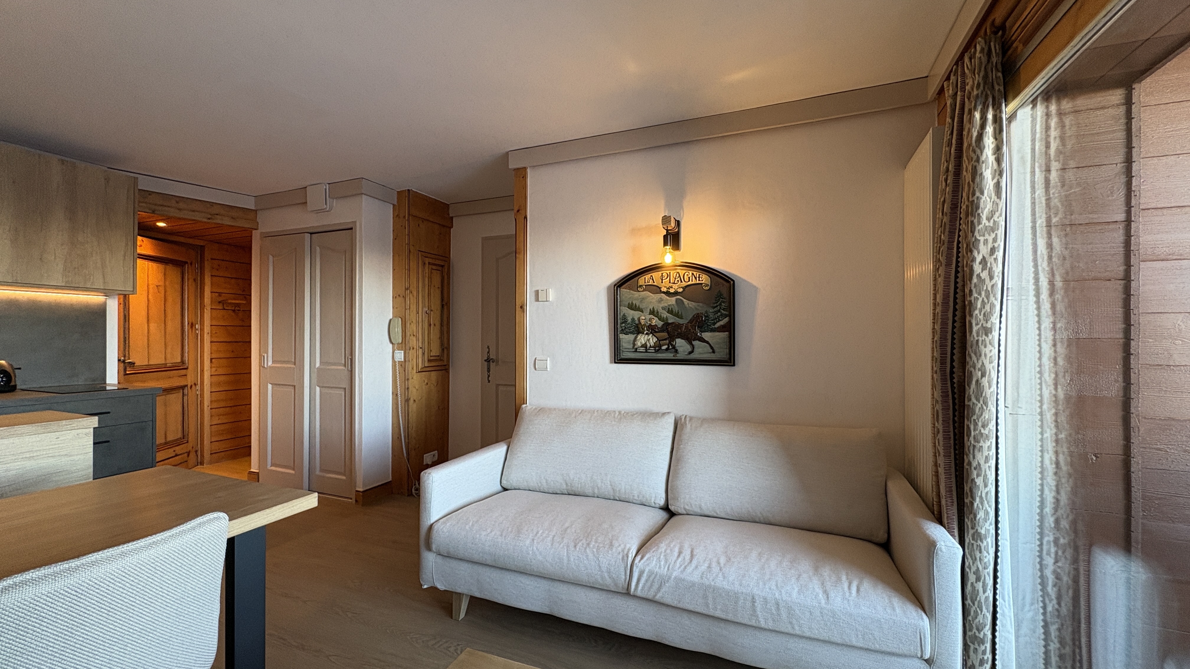 Il dispose d'une terrasse vue sur les pistes et le Mont-Blanc.