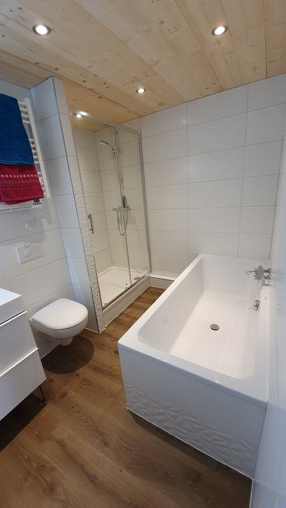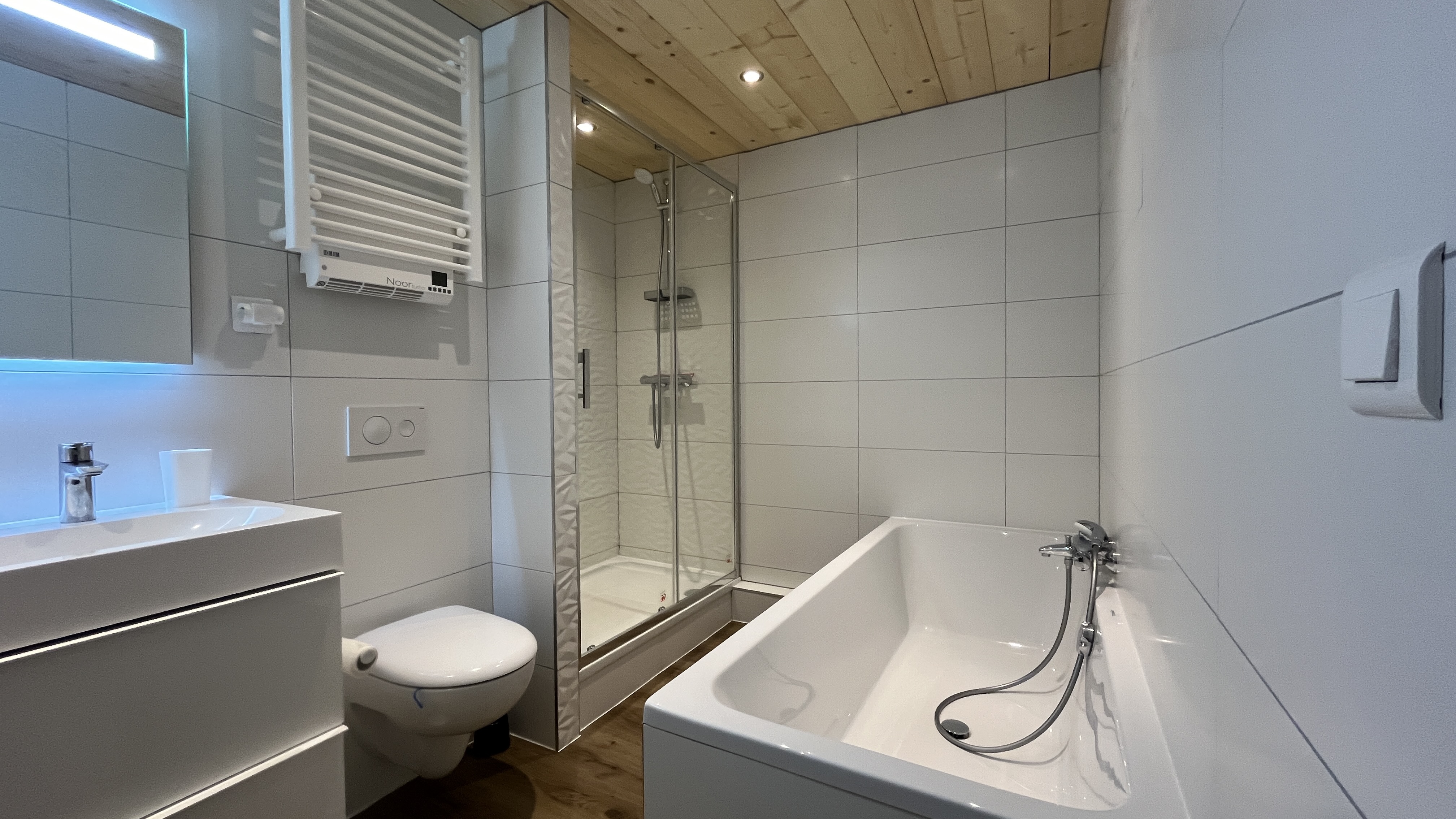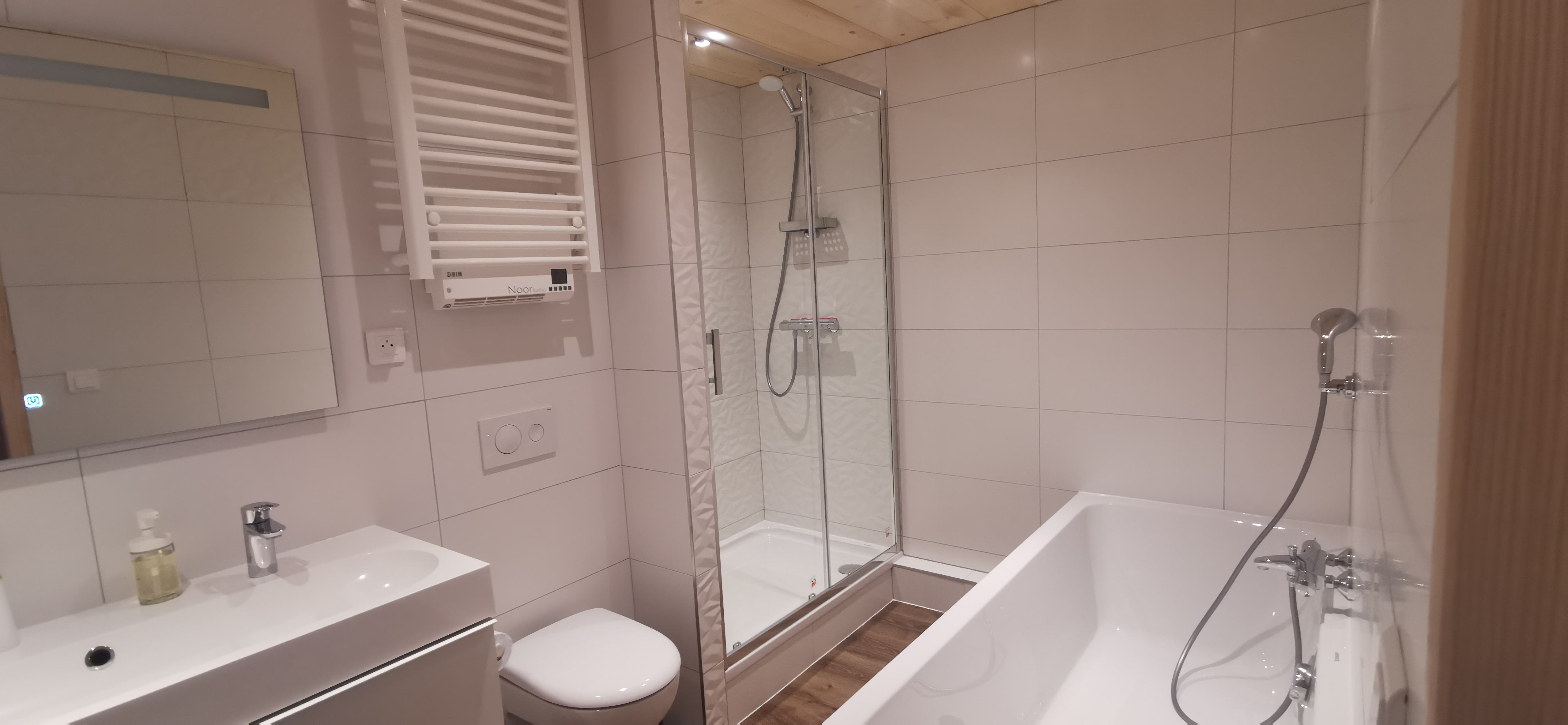 Salle de bain avec baignoire, douche et WC, sèche cheveux
