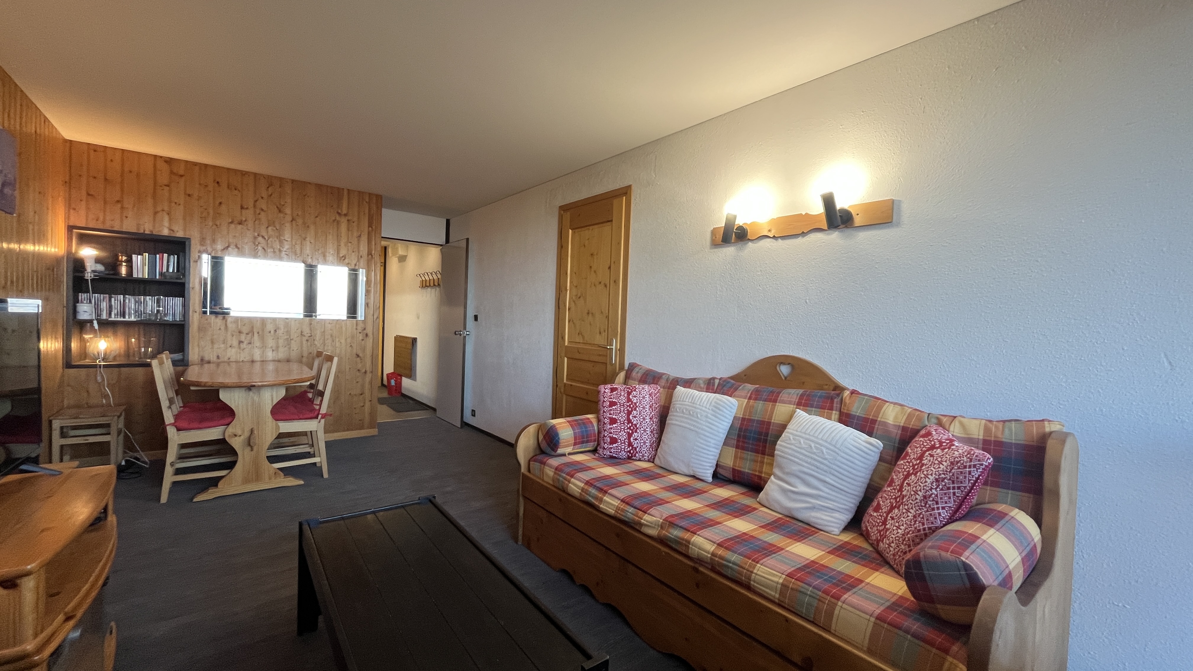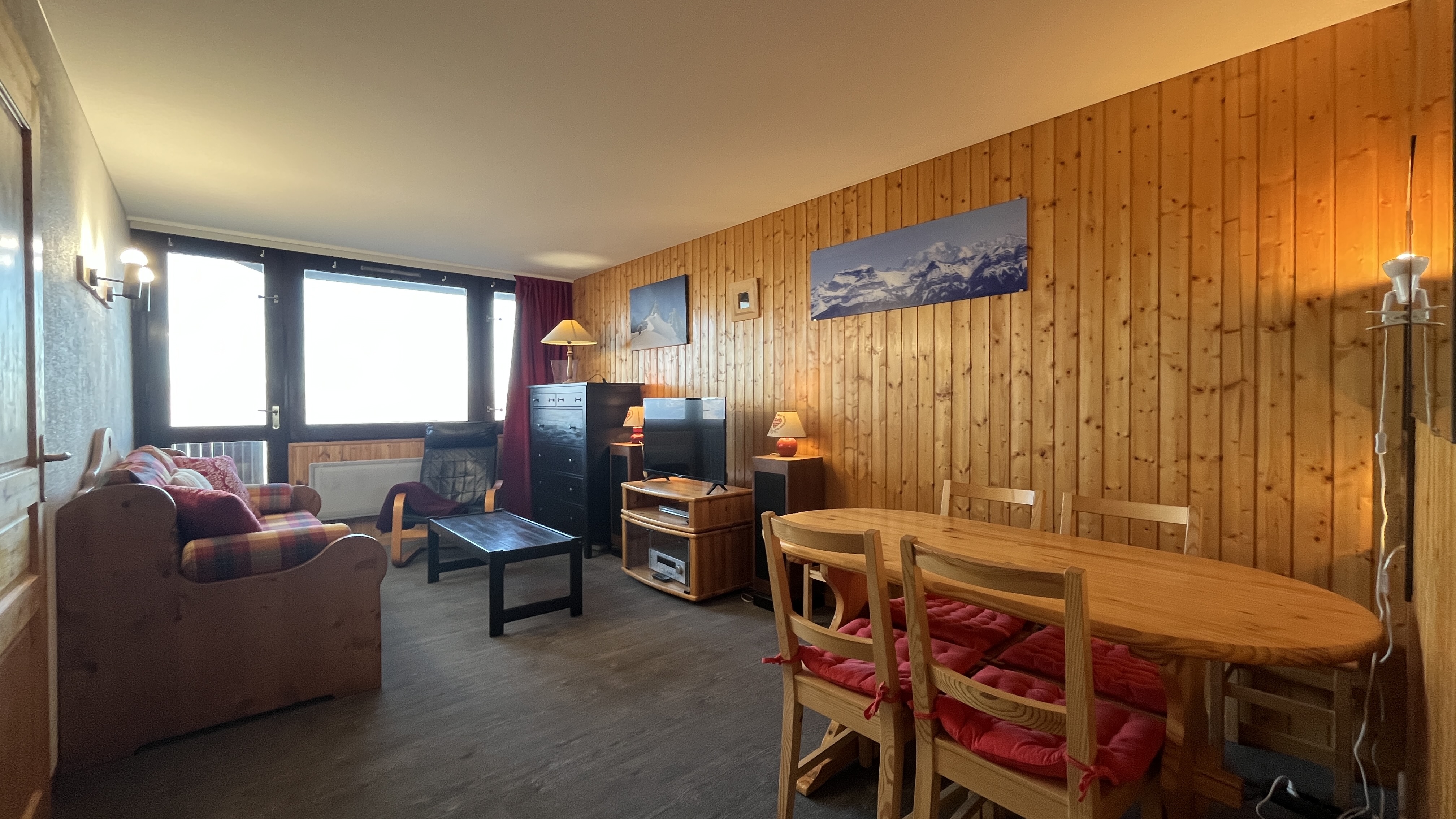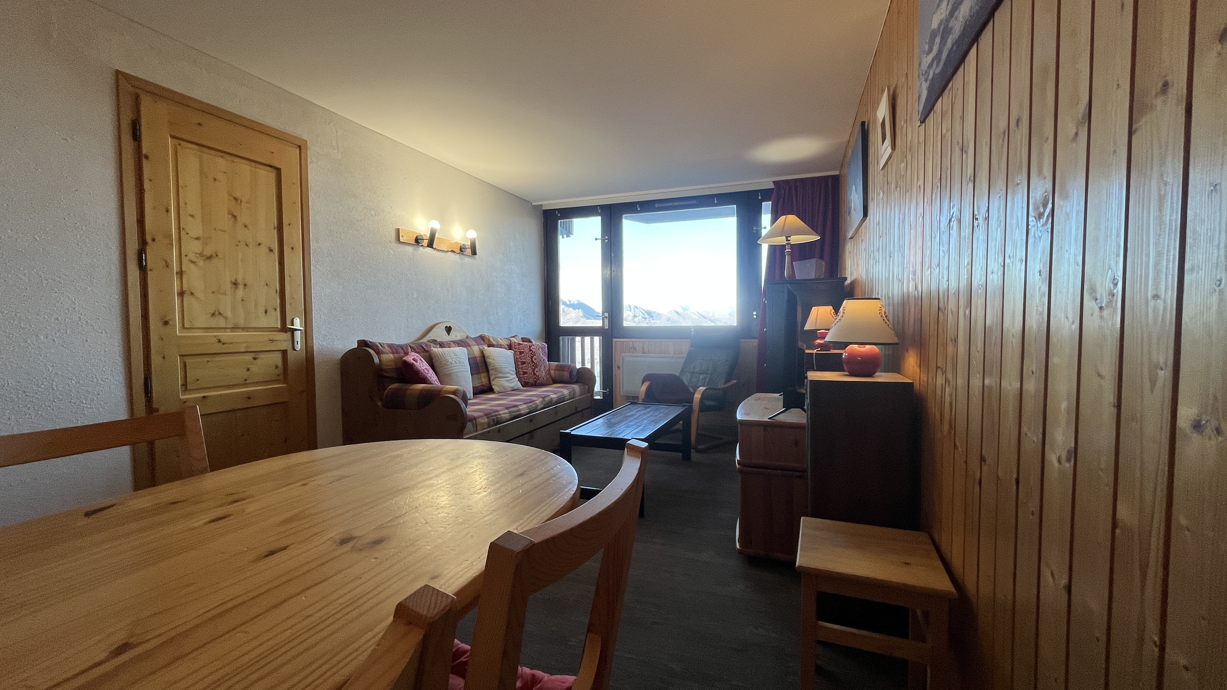 Ce studio d'environ 28 m² bénéficie d'un surface agréable avec un coin nuit fermé équipé d'un lit double. Un balcon avec une très belle vue sur le Mont-Blanc