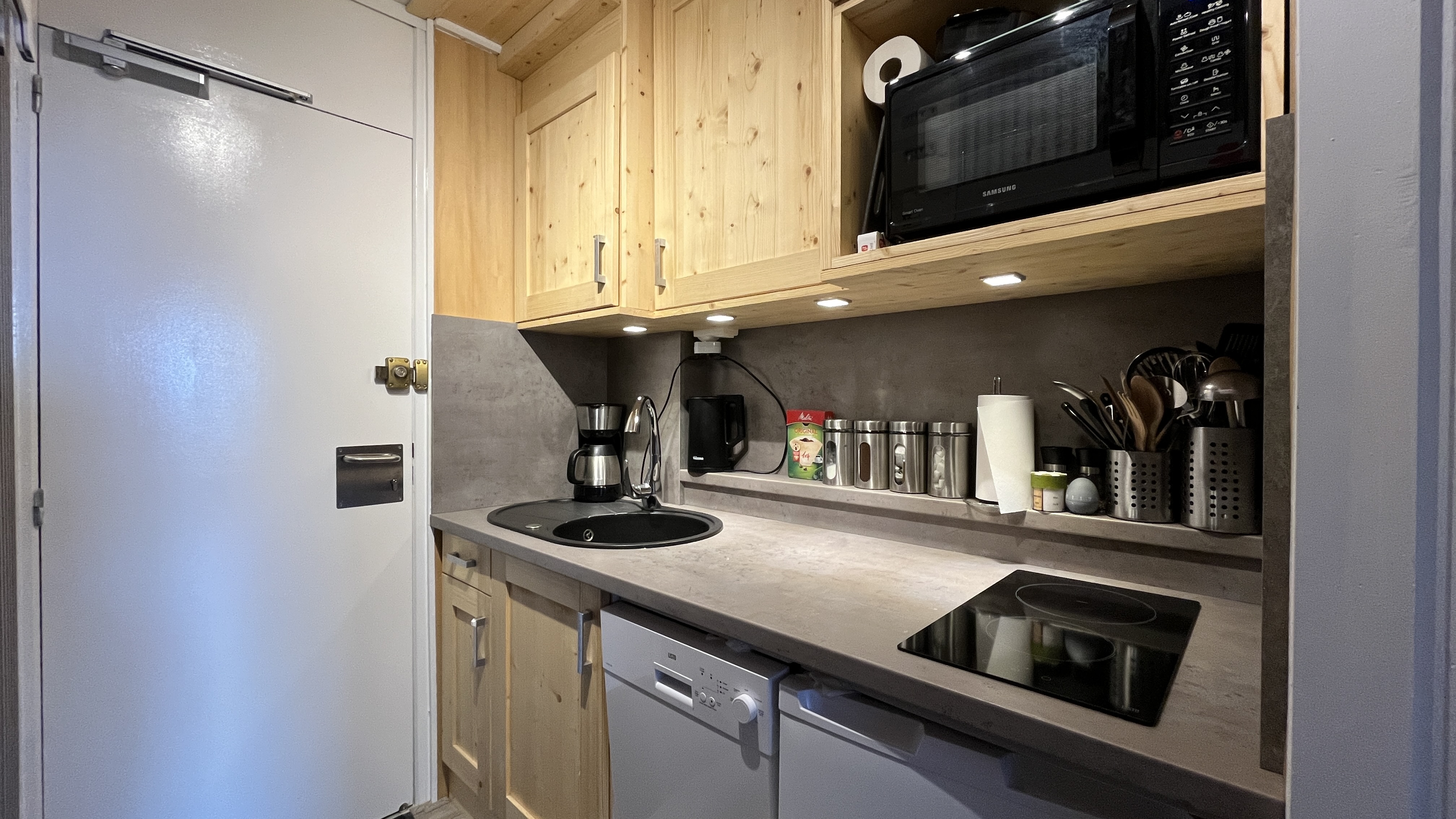 Cuisine : 2 Plaques vitro, 1 micro ondes mixte, 1LV, 1 cafetière électrique, 1 bouilloire, 1 grille pain