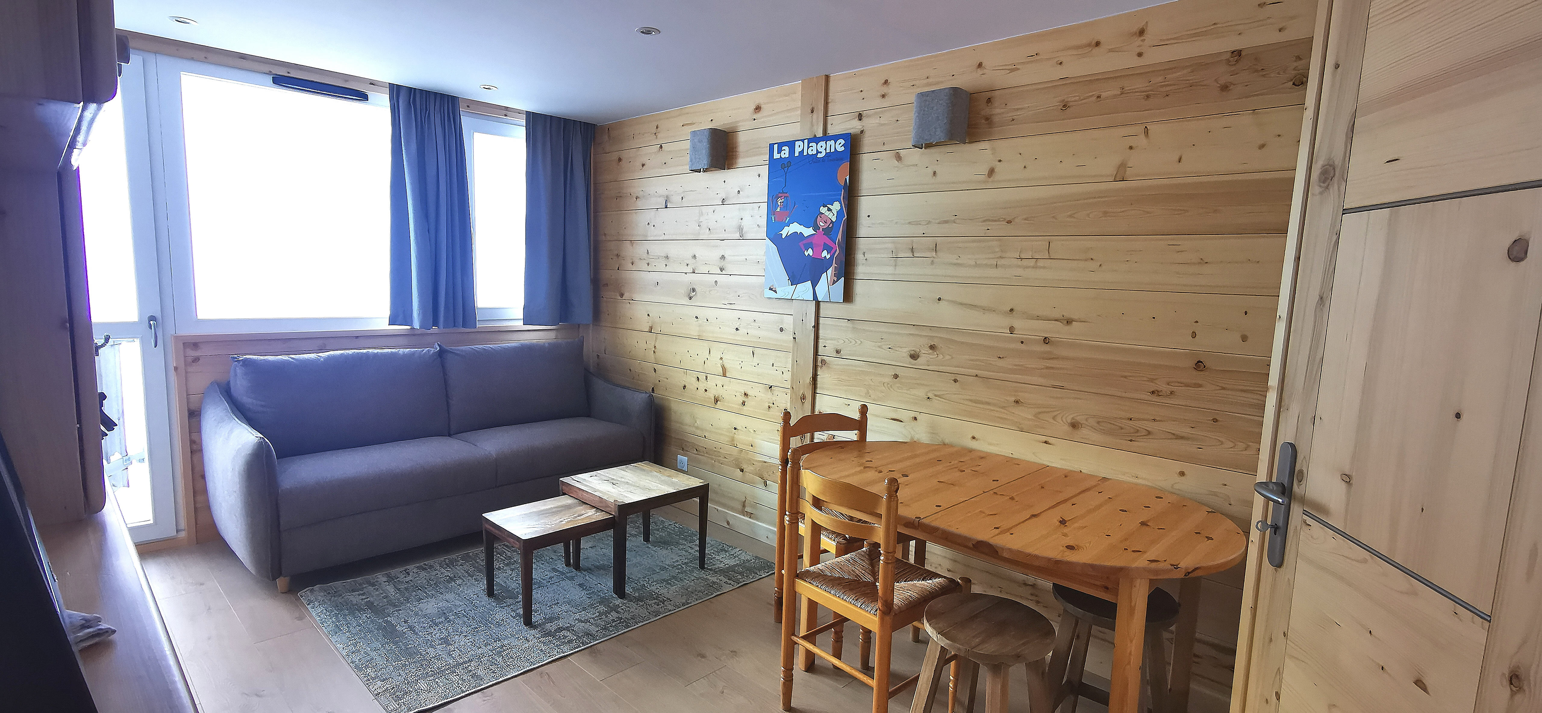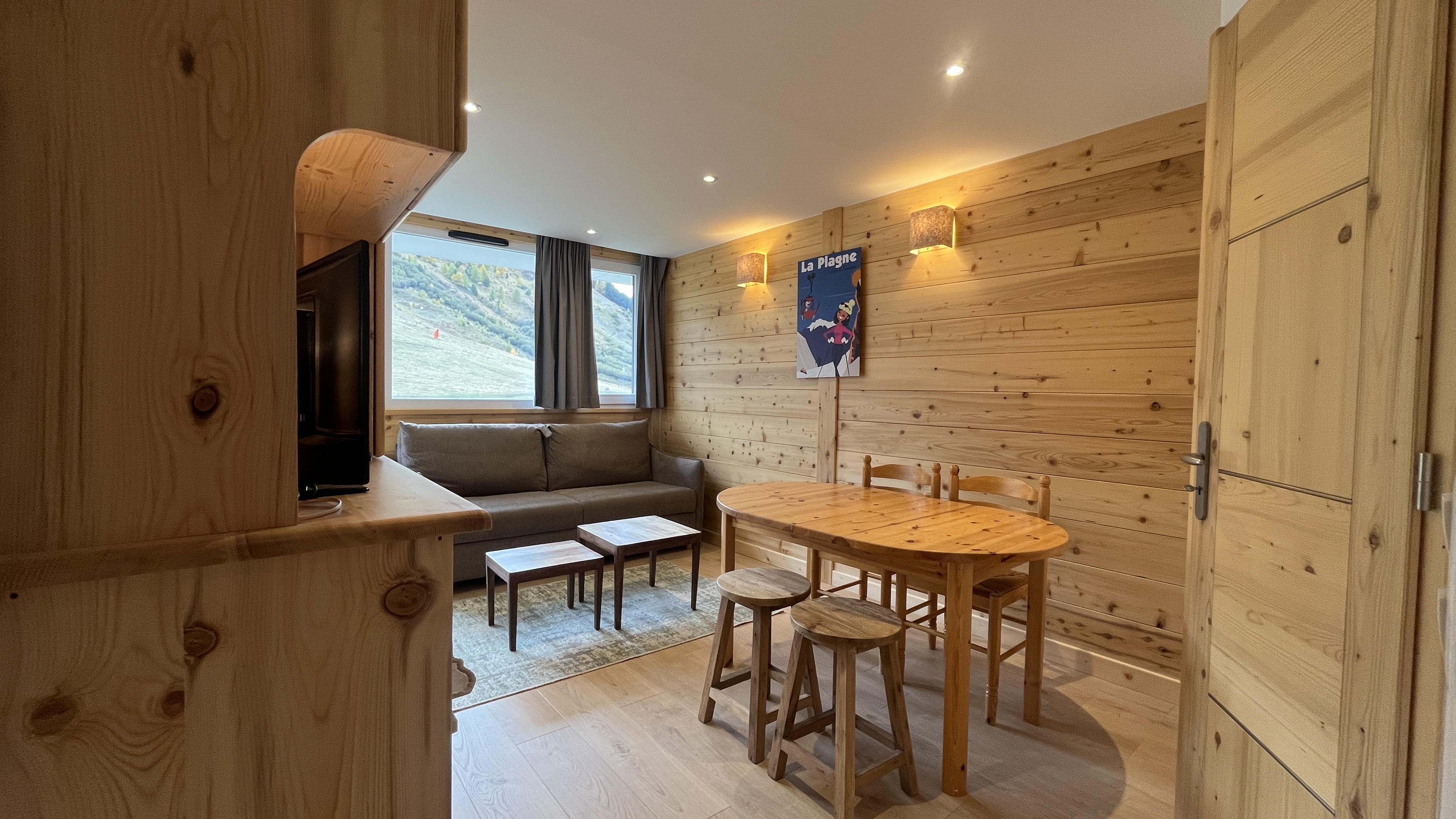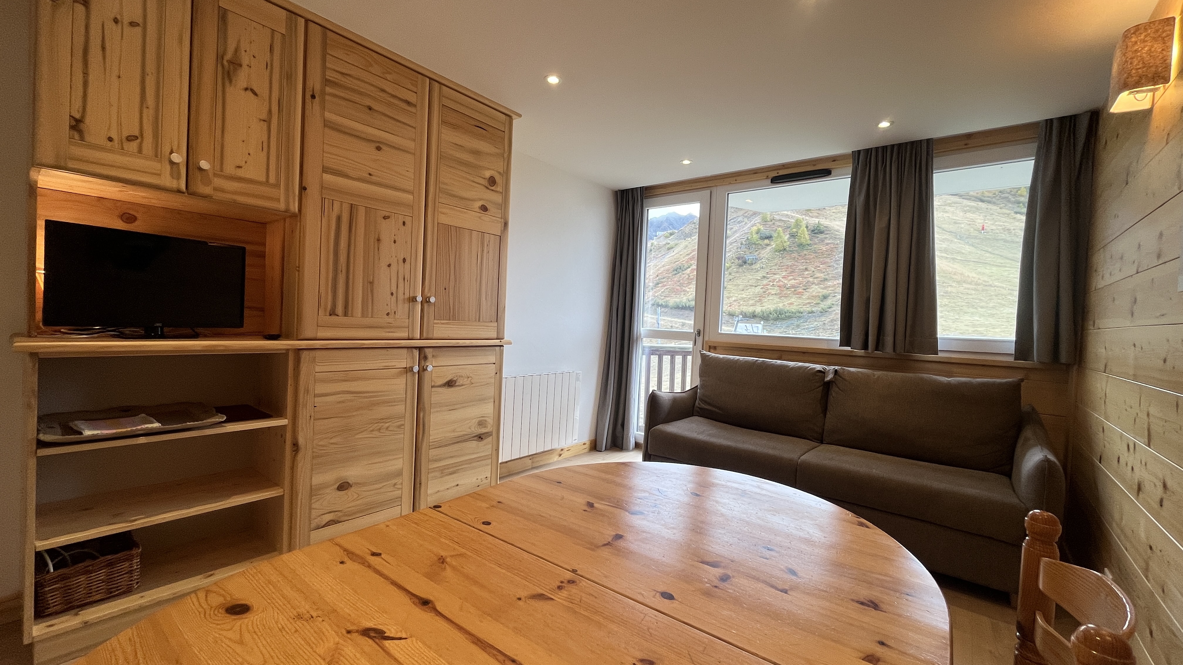 Ce très beau studio d'environ 26 m² entièrement rénové bénéficie d'un coin nuit fermé et d'un balcon exposé Sud/Ouest avec vue sur les pistes.