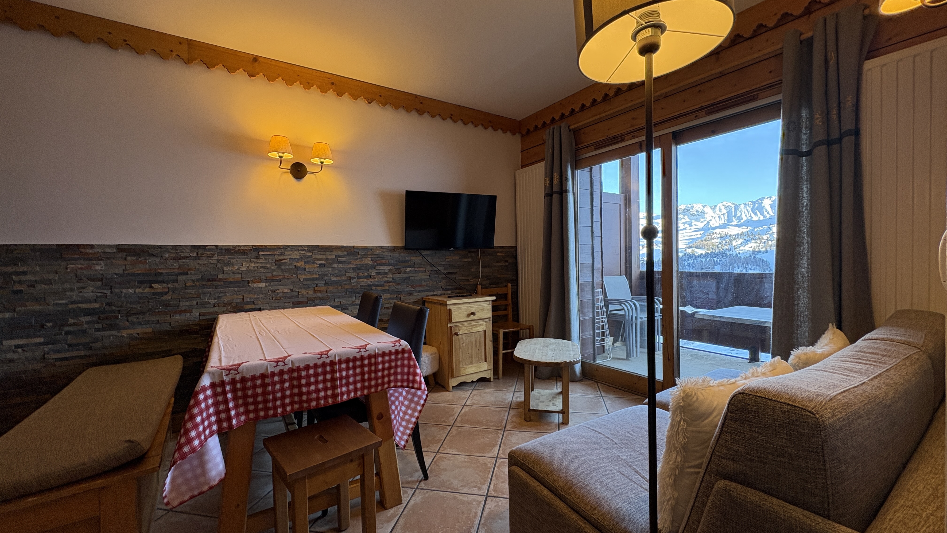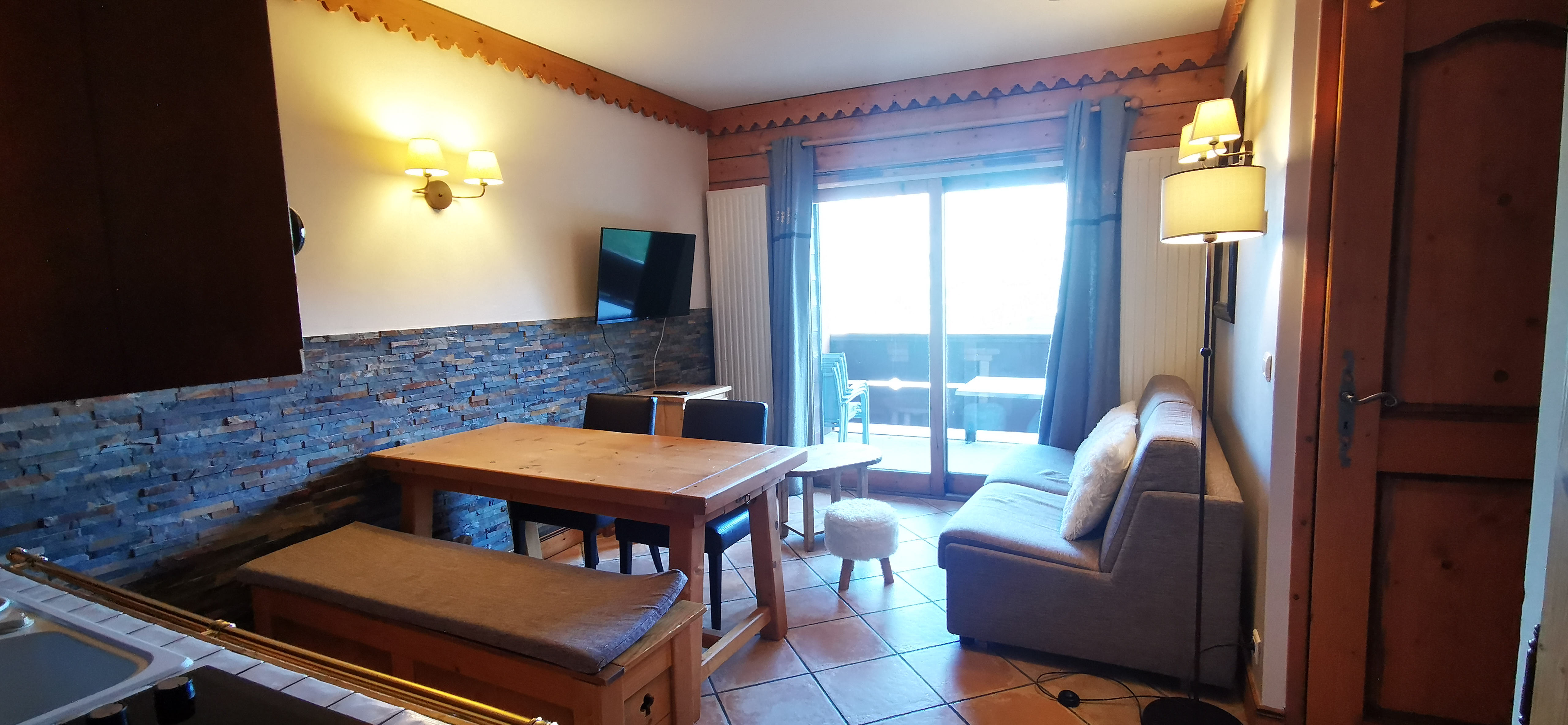 Il dispose d'une terrasse vue sur les pistes et le Mont-Blanc.