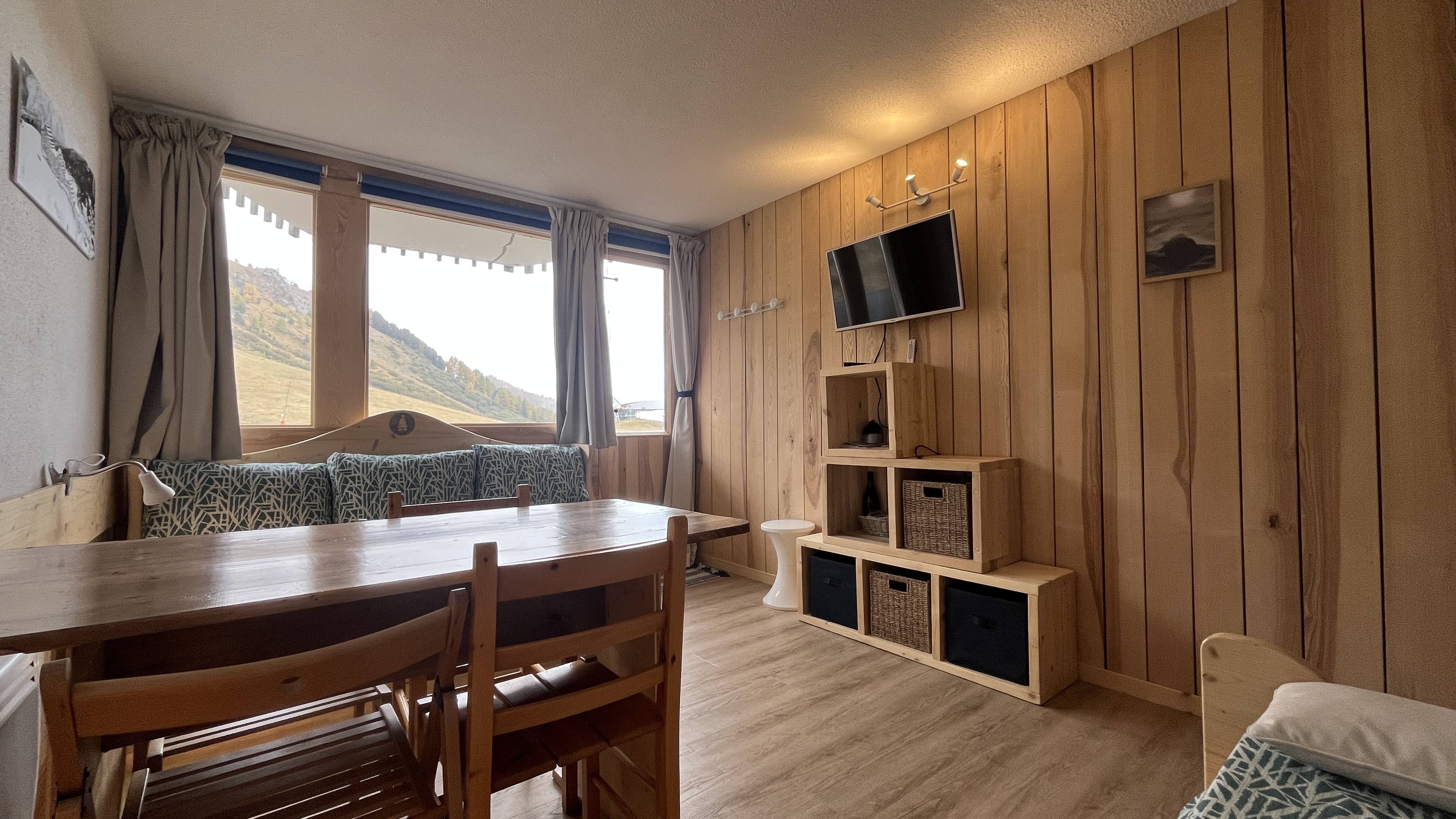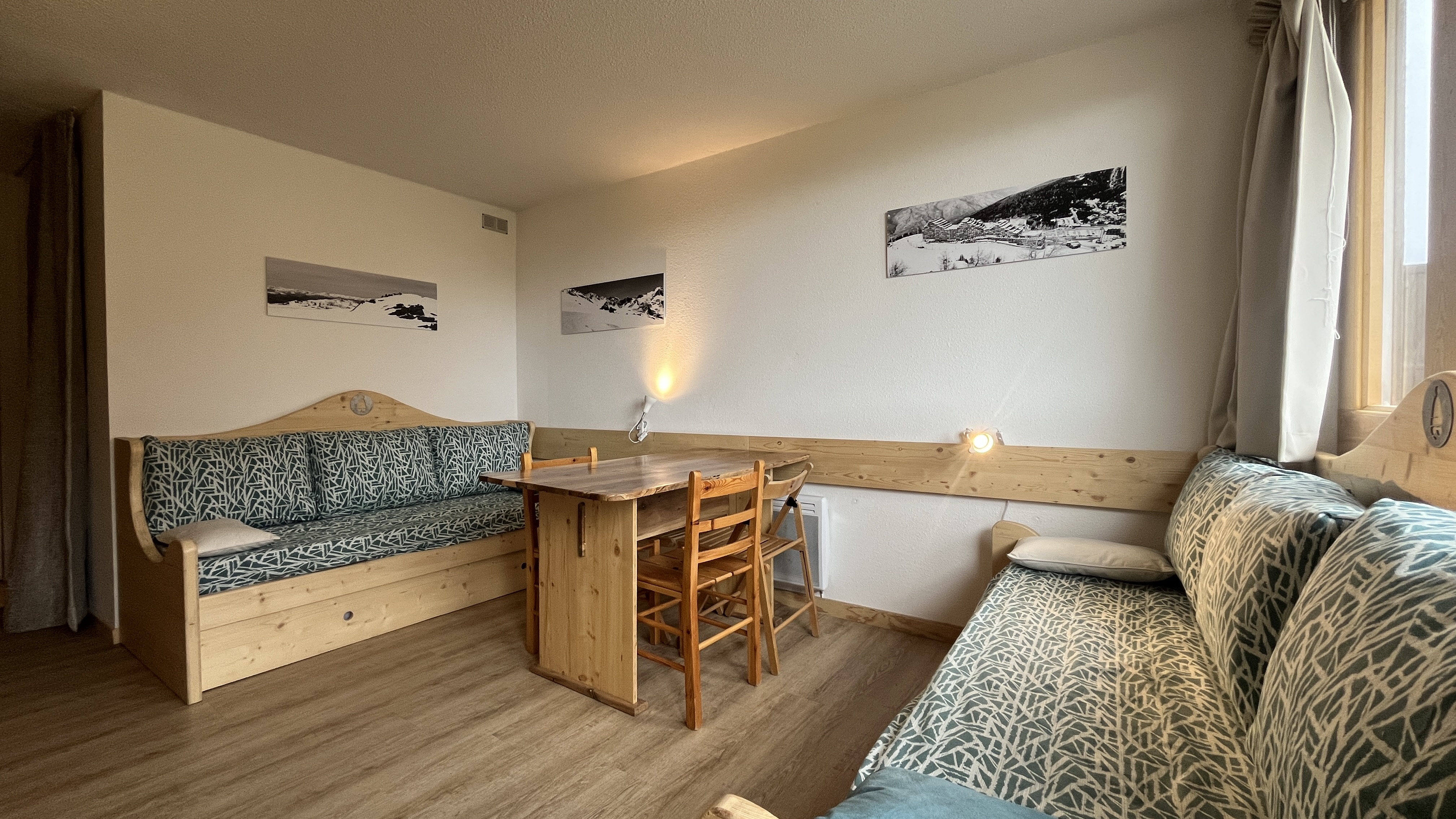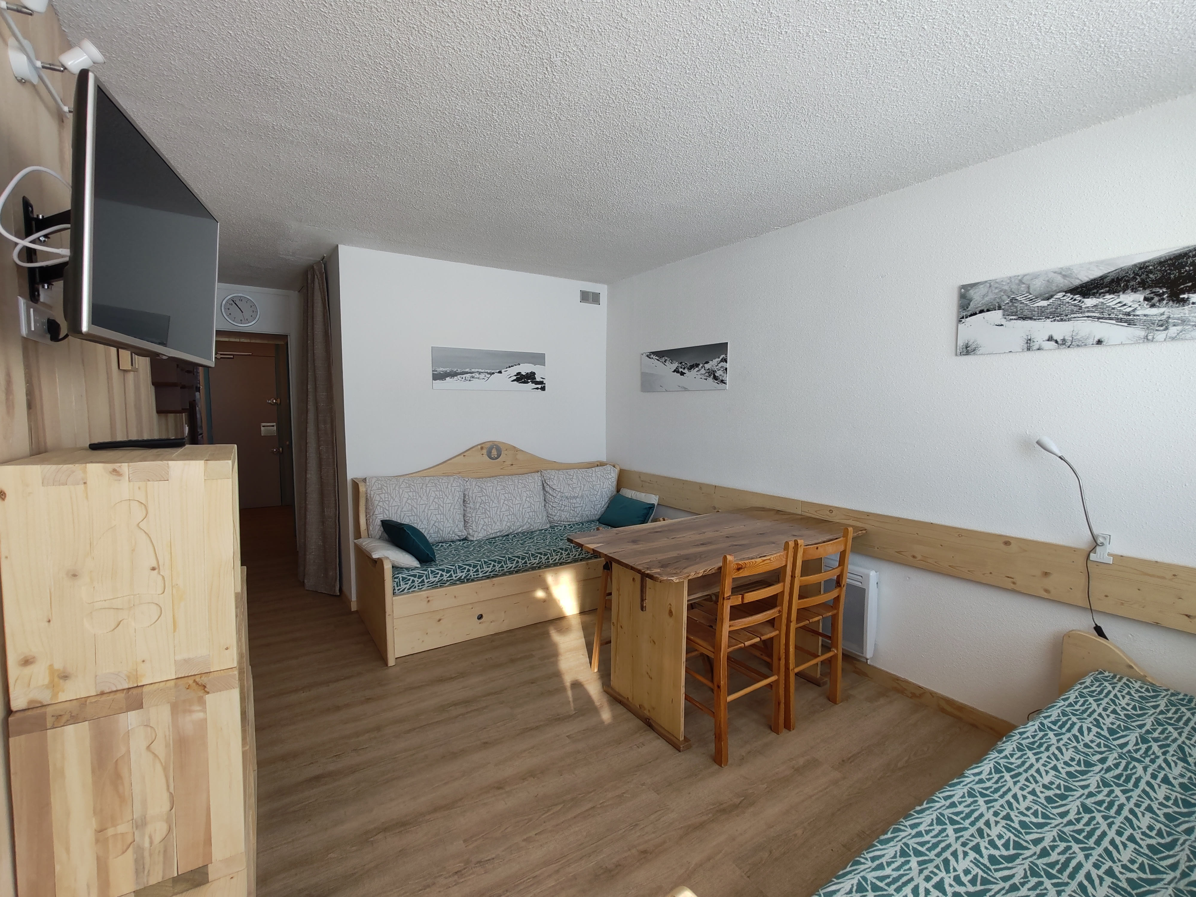 Joli studio d'environ 26 m² qui bénéficie d'un coin nuit et d'un balcon exposé Sud/Ouest avec vue sur les pistes et est disposé ainsi