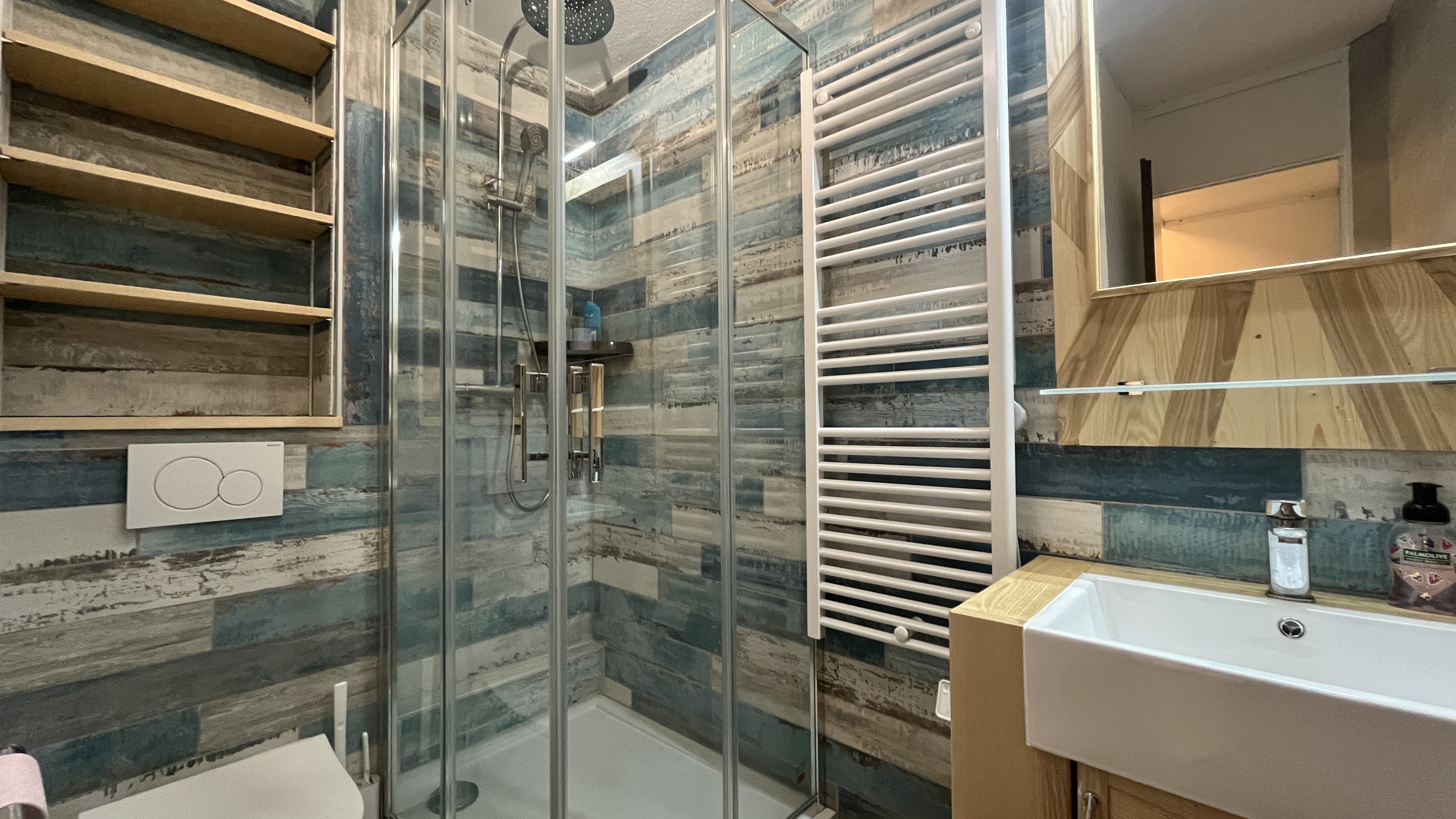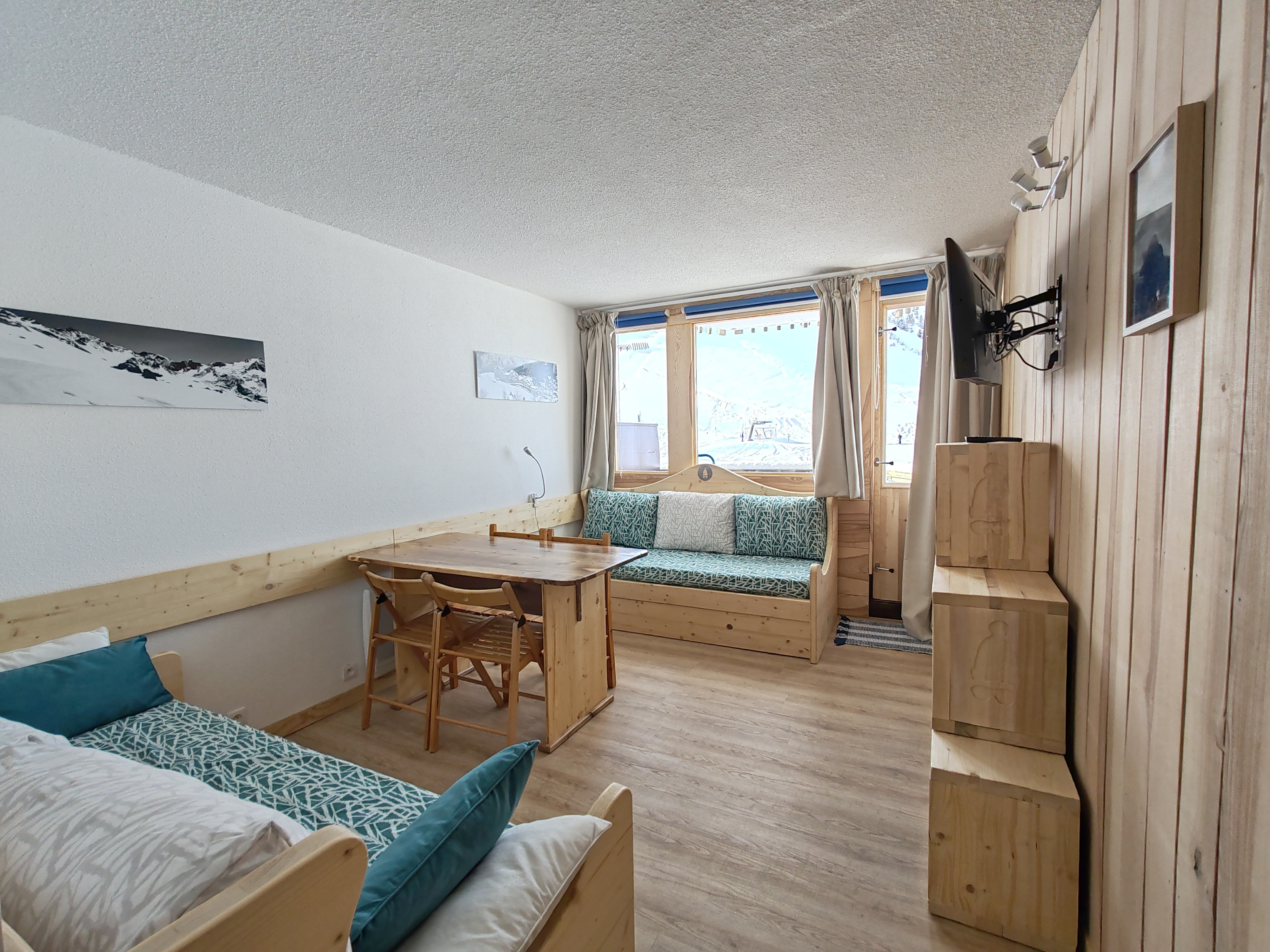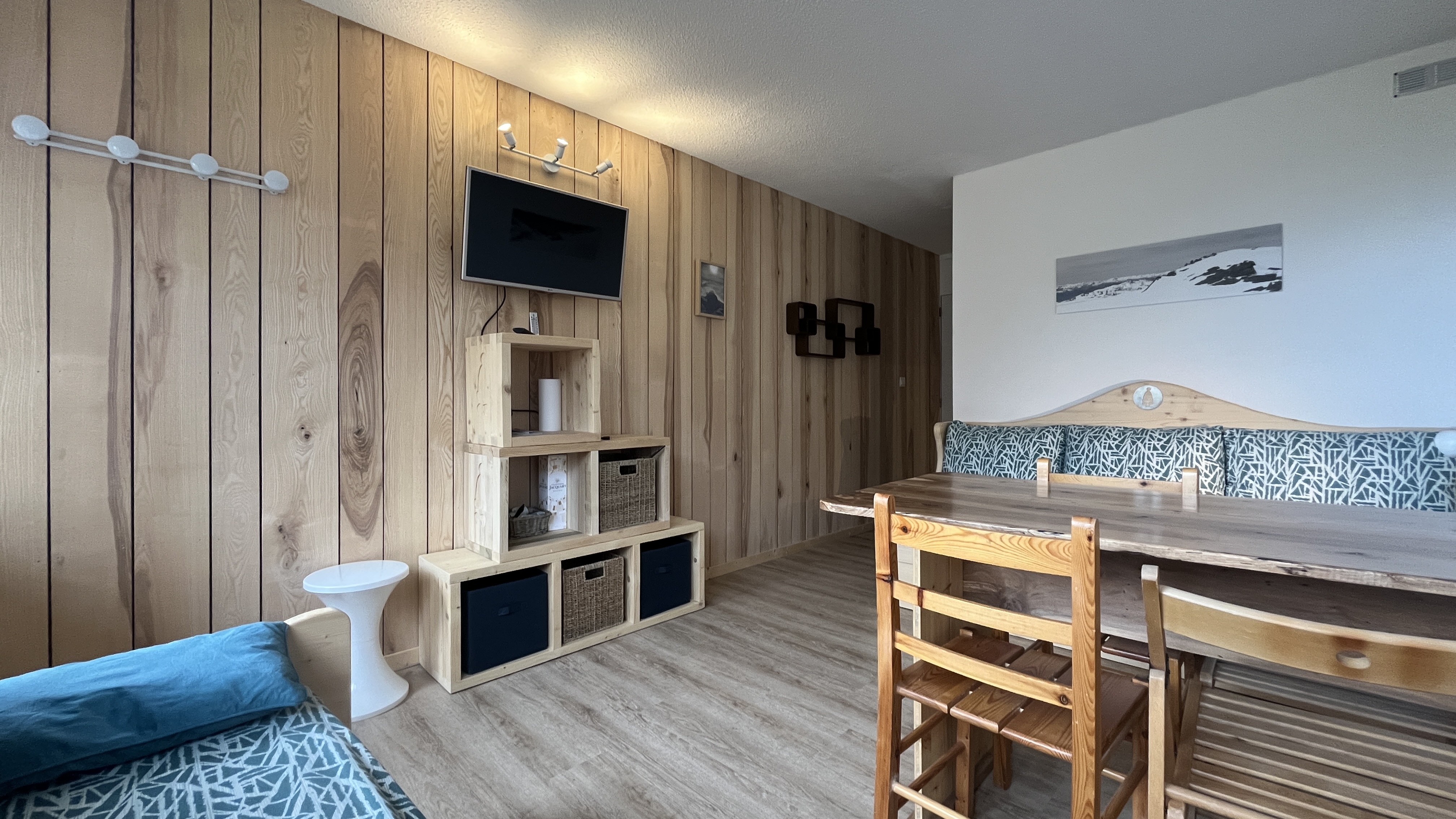 Joli studio d'environ 26 m² qui bénéficie d'un coin nuit et d'un balcon exposé Sud/Ouest avec vue sur les pistes et est disposé ainsi