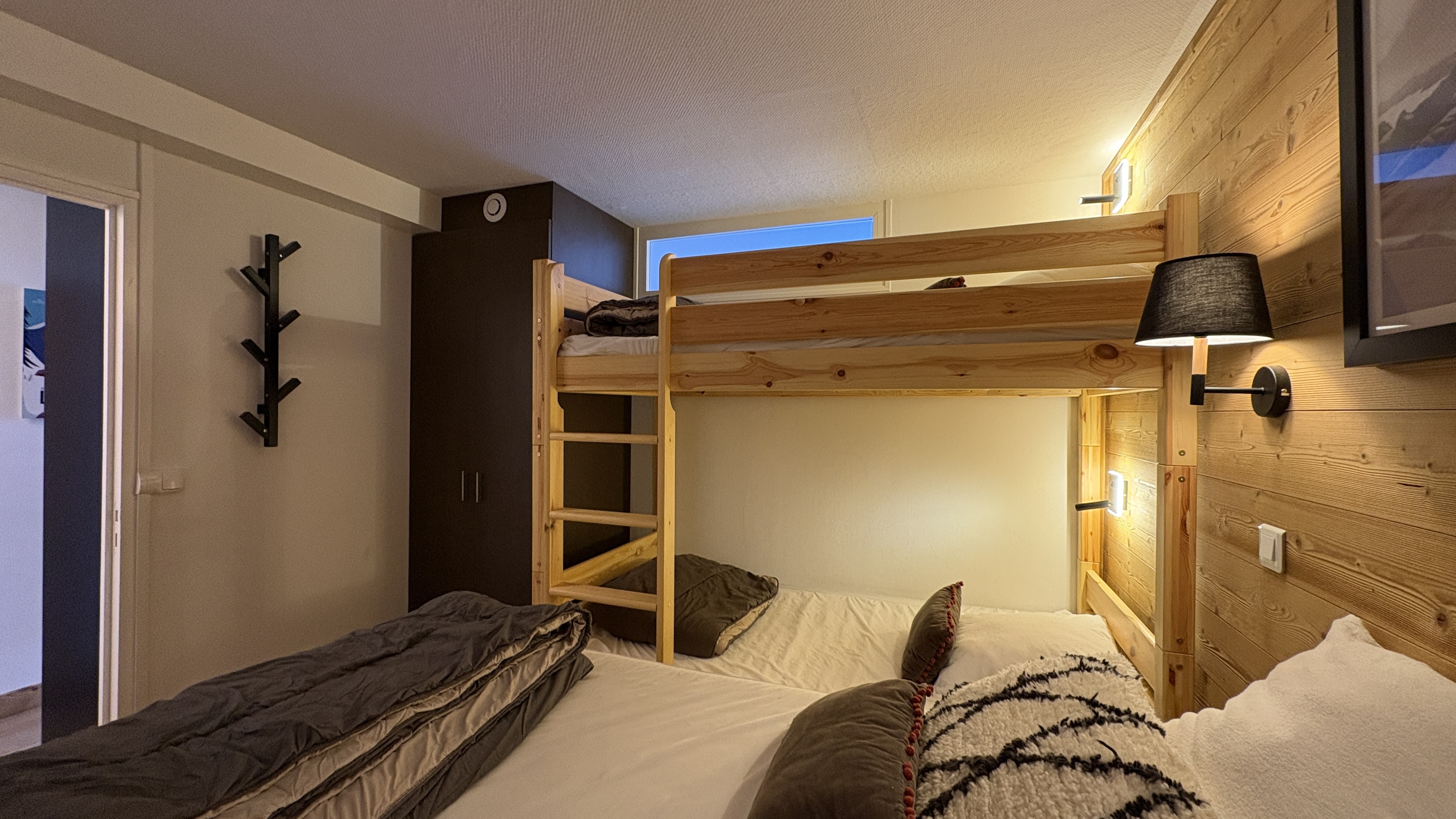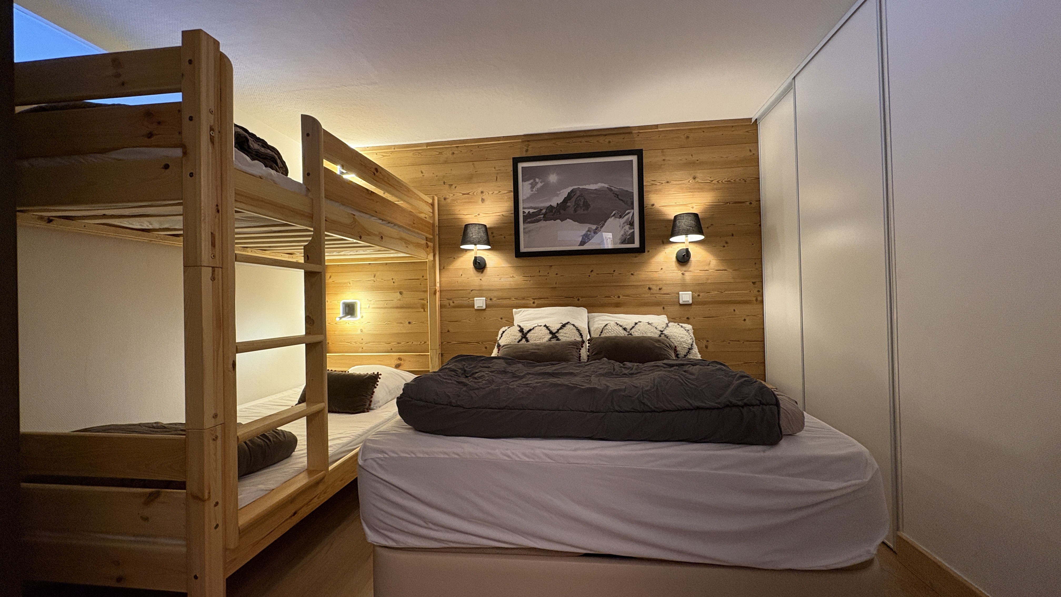 Chambre 1 : 1 lit double en 140 + 2 lits 1 place superposés (couettes)