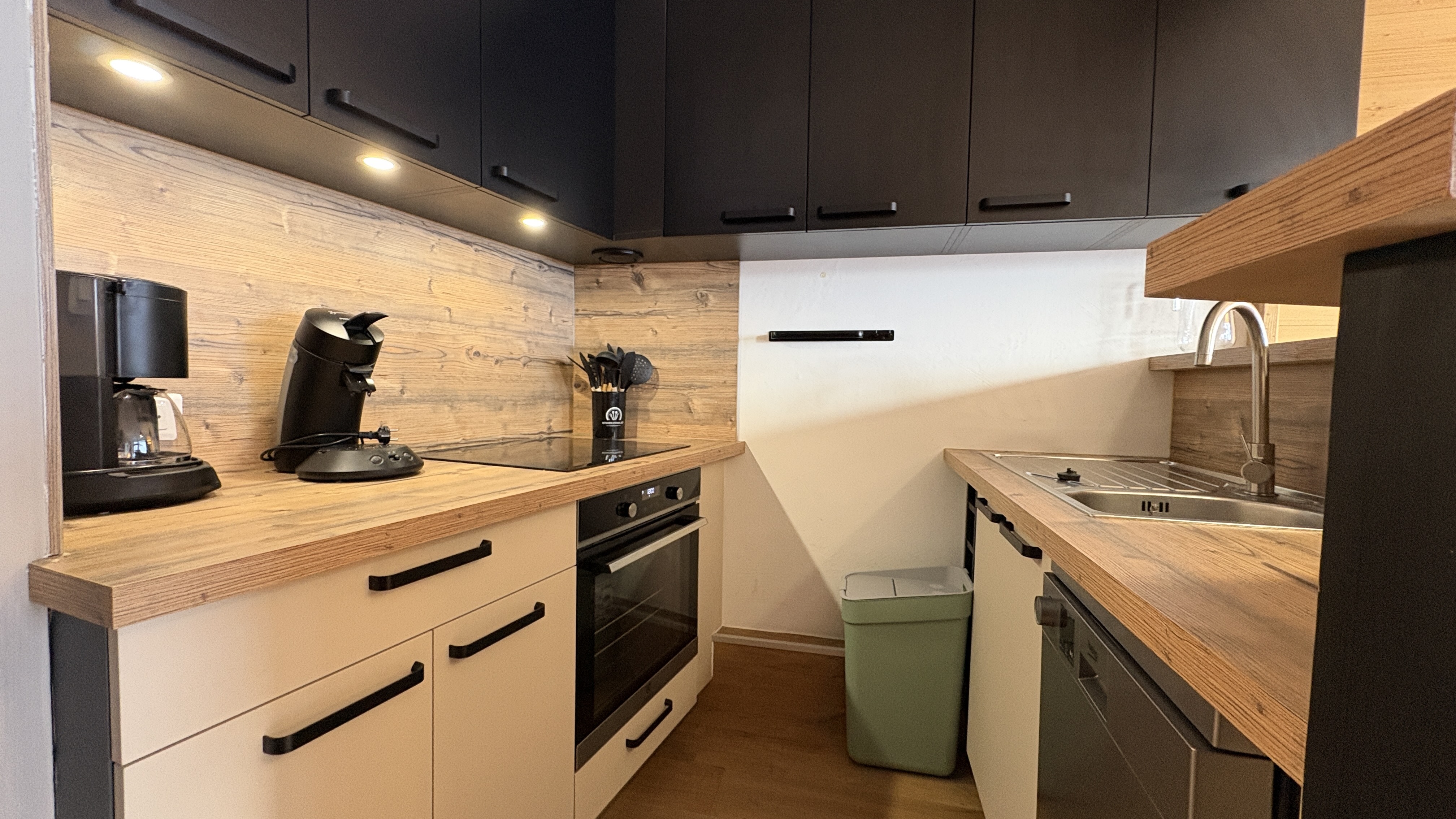 Cuisine équipée : 3 plaques induction, four, four MO, lave vaisselle, frigo+ congélateur, cafetière électrique + SENSEO