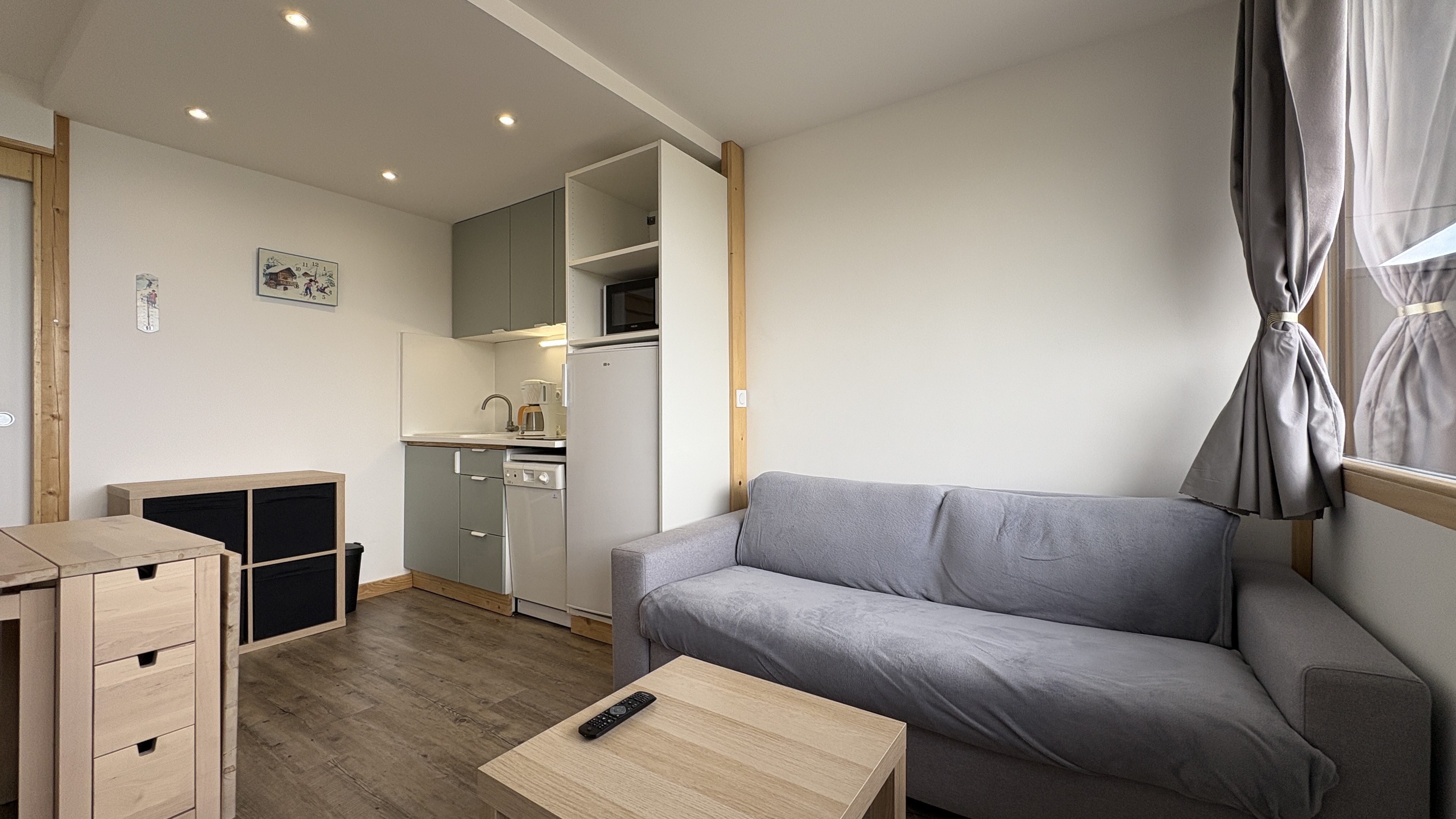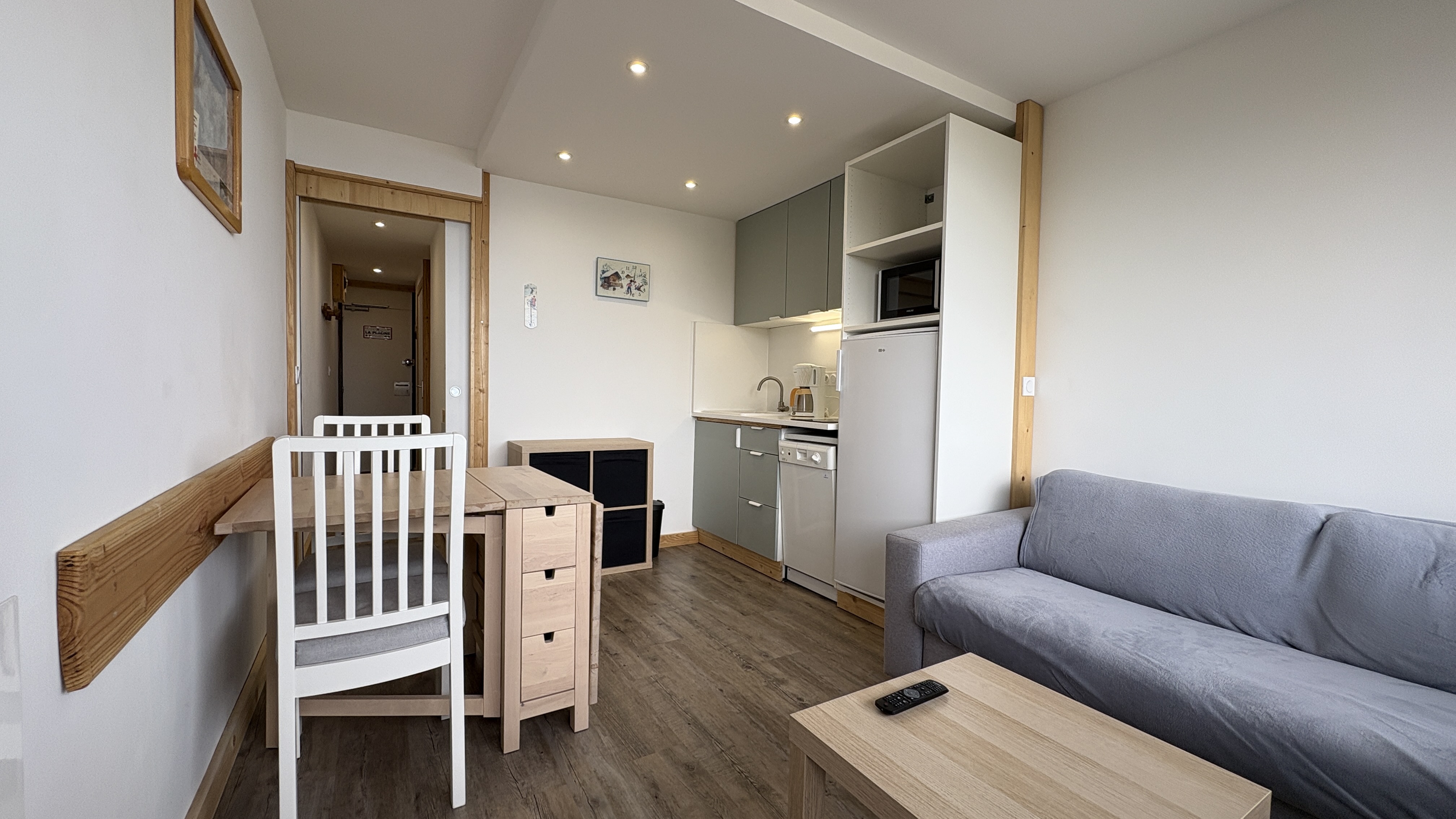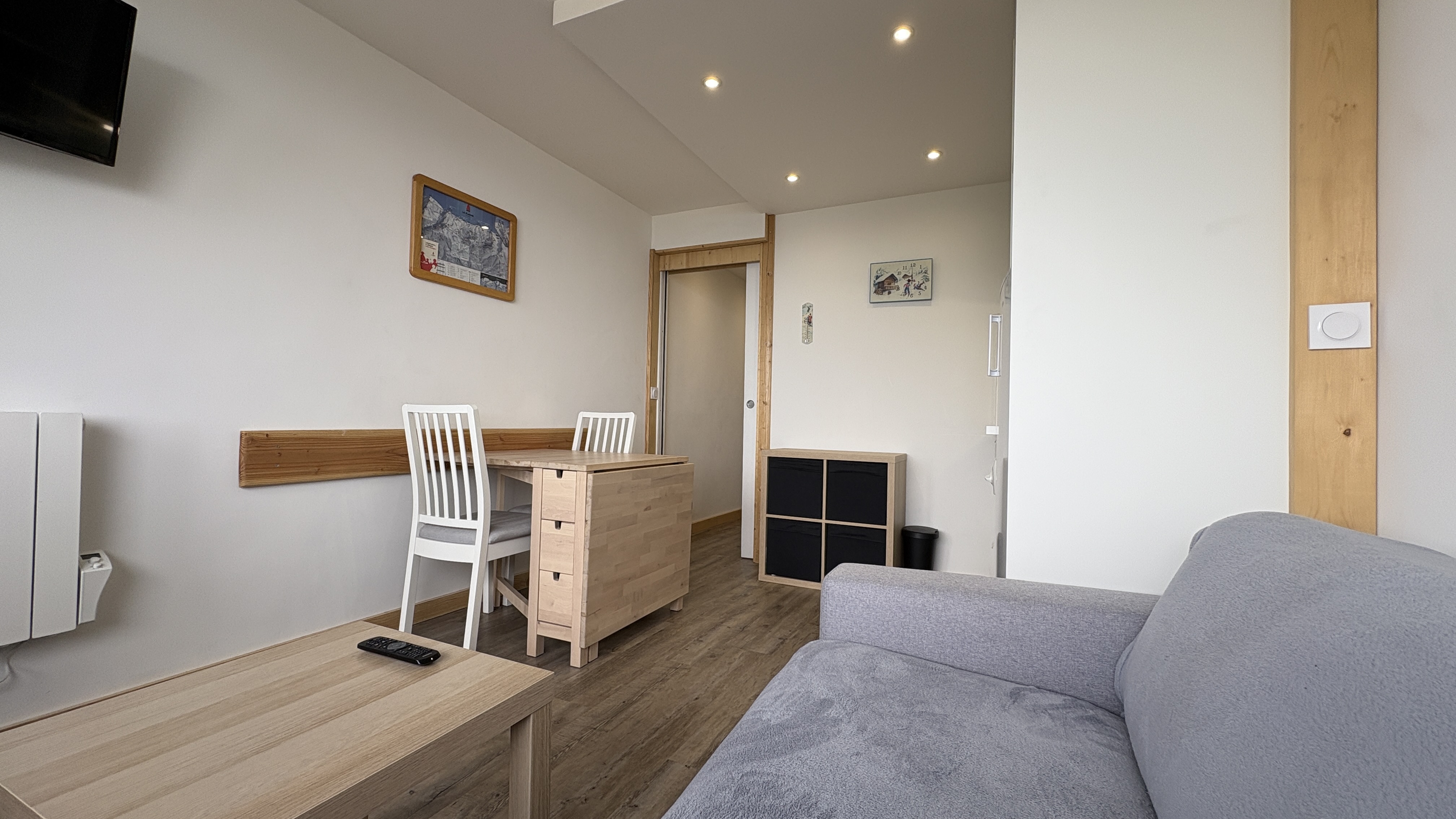 Ce très joli studio d'environ 26 m² entièrement rénové bénéficie d'un WC séparé, une salle de bains, un coin nuit, une cuisine équipée ouverte sur séjour et d'un balcon exposé Nord/Est avec une très belle vue sur le Mont Blanc.