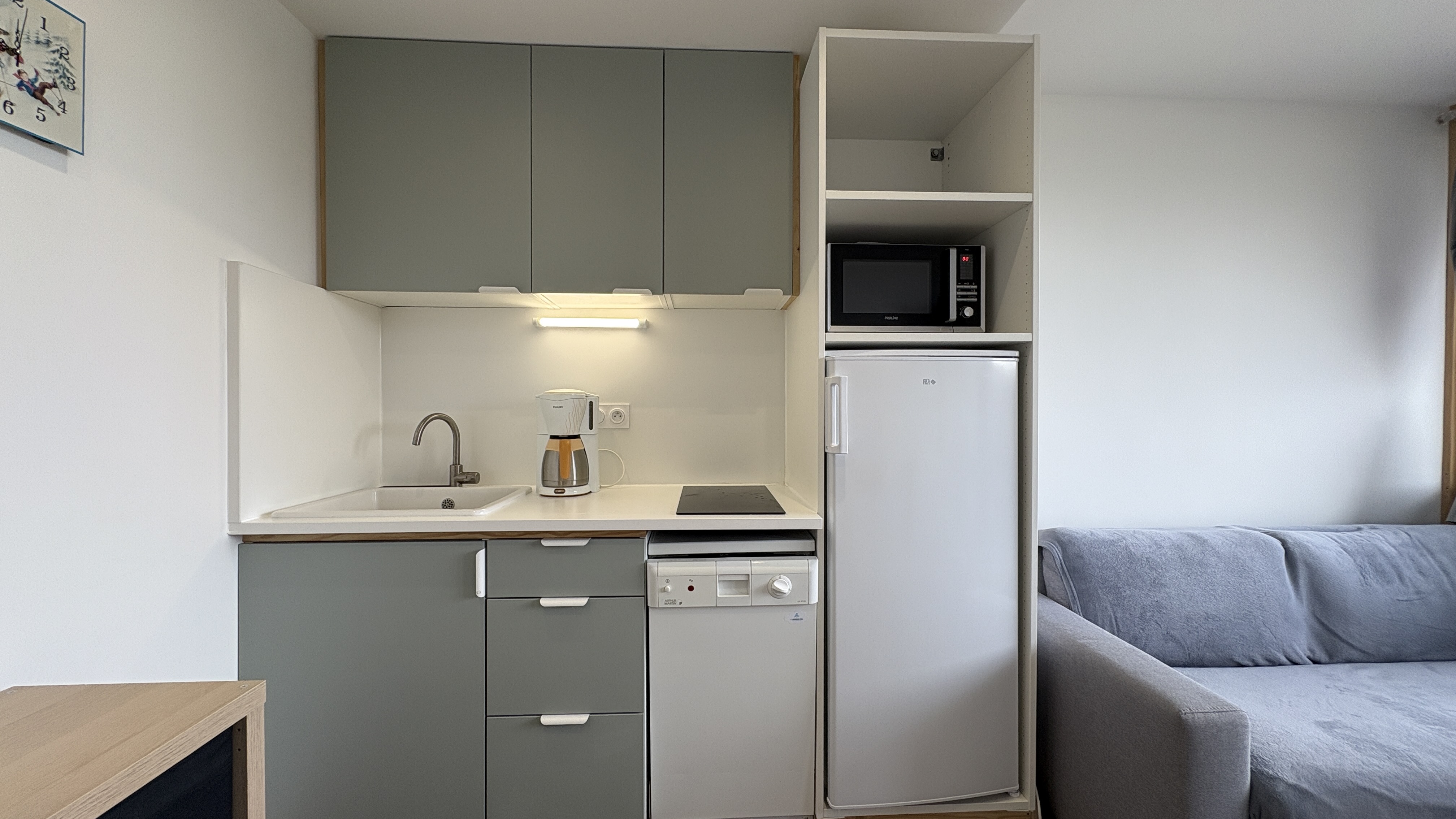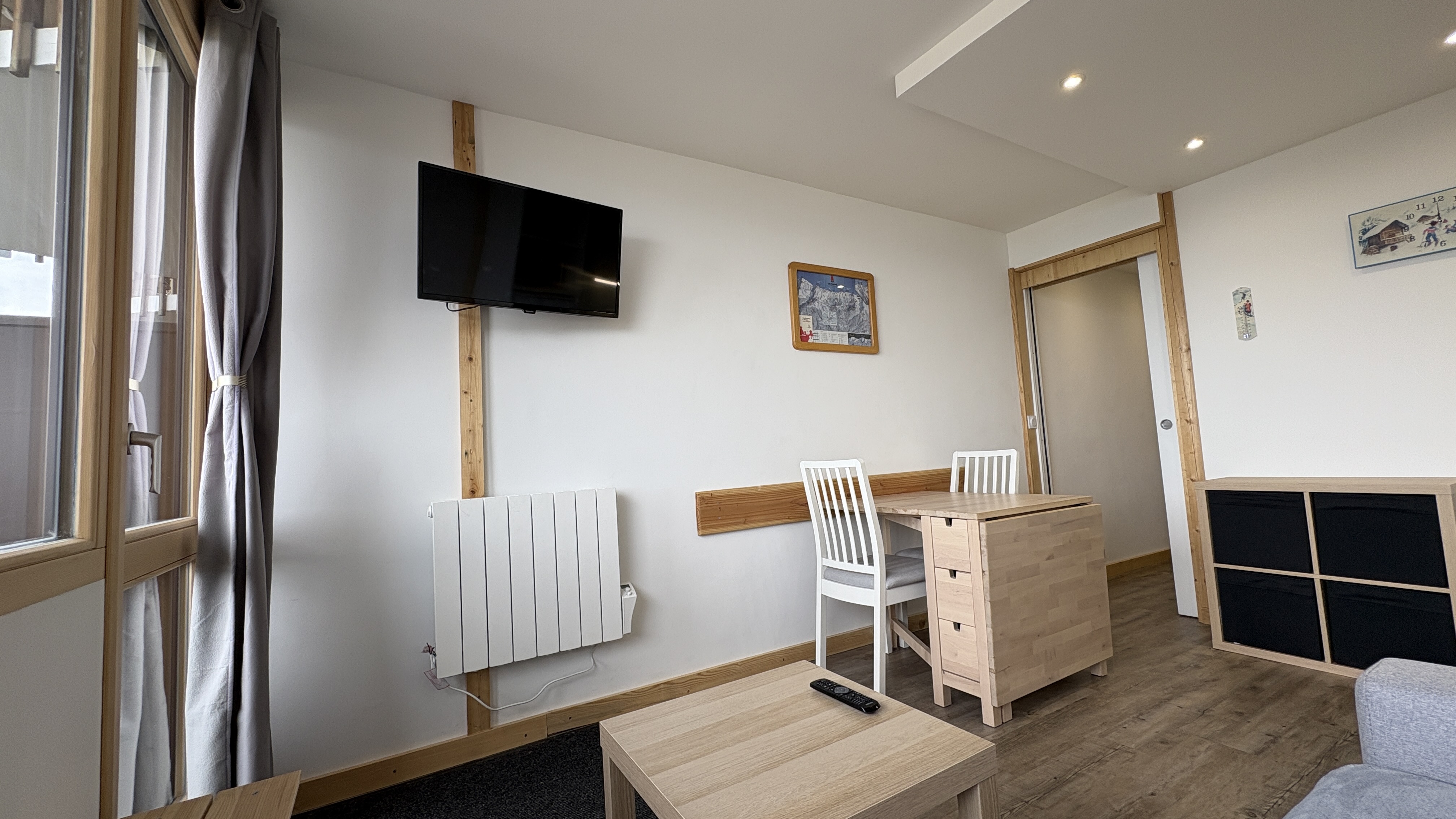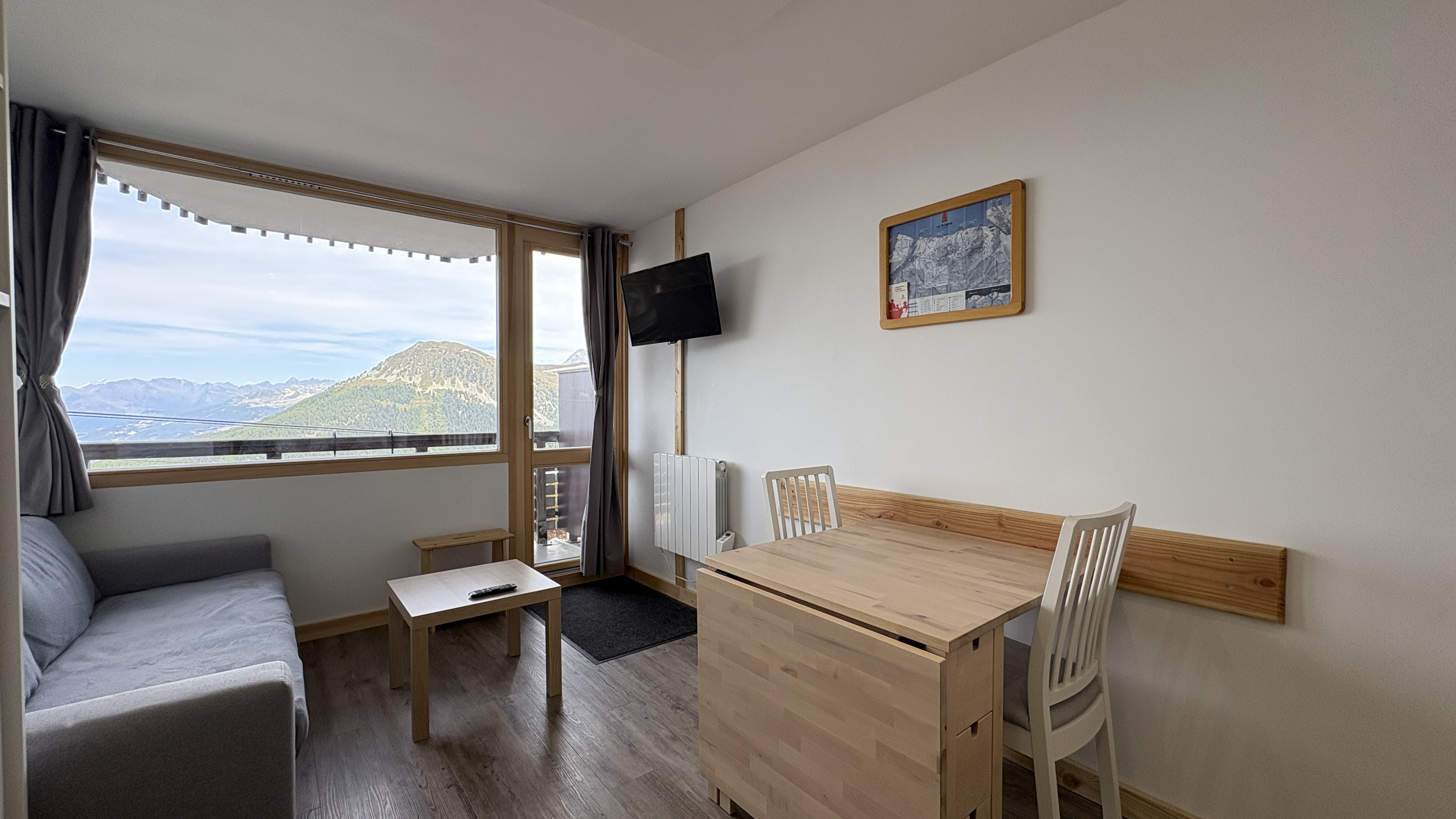 Ce très joli studio d'environ 26 m² entièrement rénové bénéficie d'un WC séparé, une salle de bains, un coin nuit, une cuisine équipée ouverte sur séjour et d'un balcon exposé Nord/Est avec une très belle vue sur le Mont Blanc.