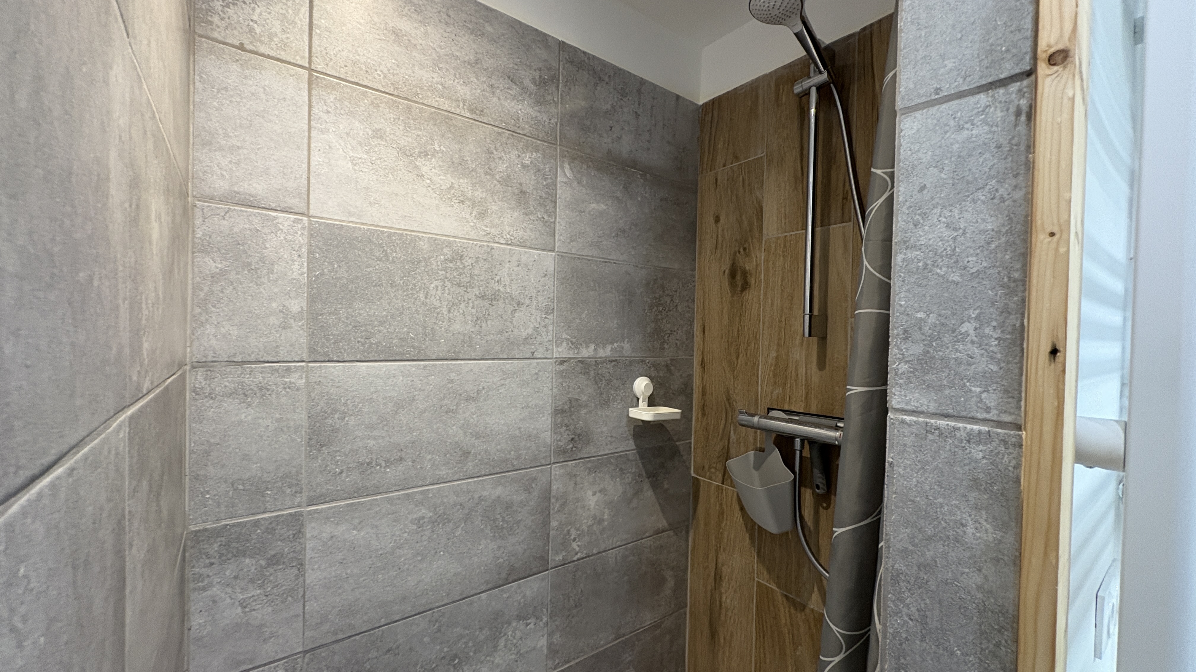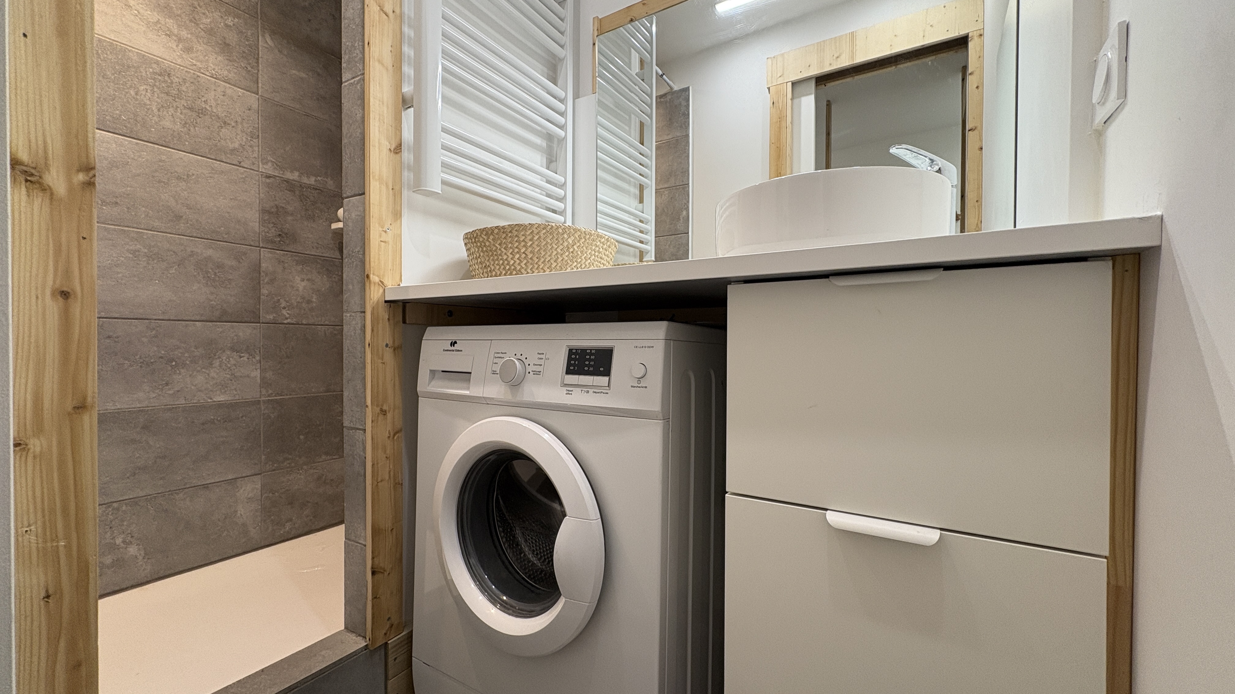 Cuisine :1 grand frigo + petit congélateur, 2 plaques induction, 1 micro ondes mixte, 1 LV, 1 cafetière électrique, 1 bouilloire