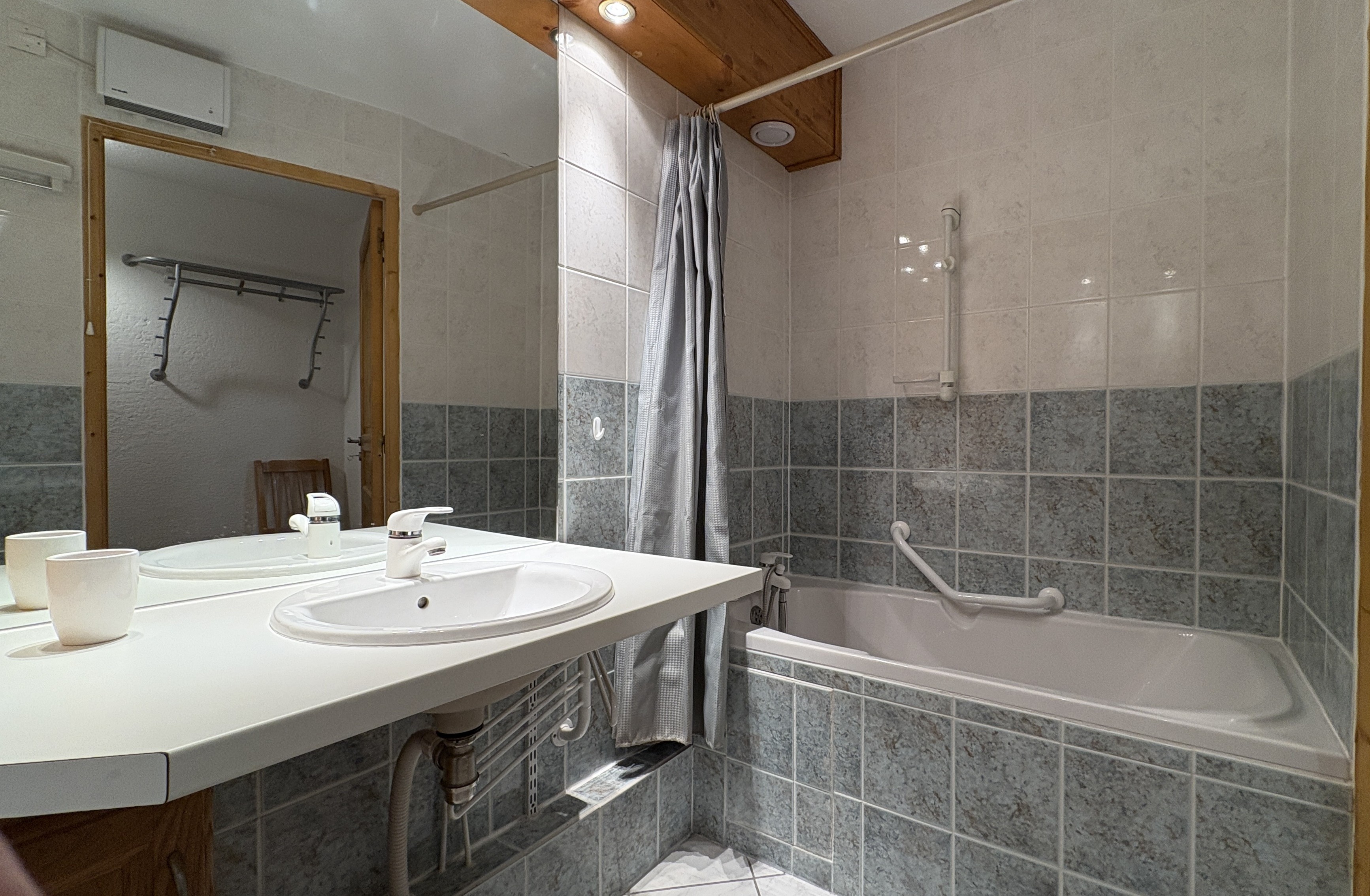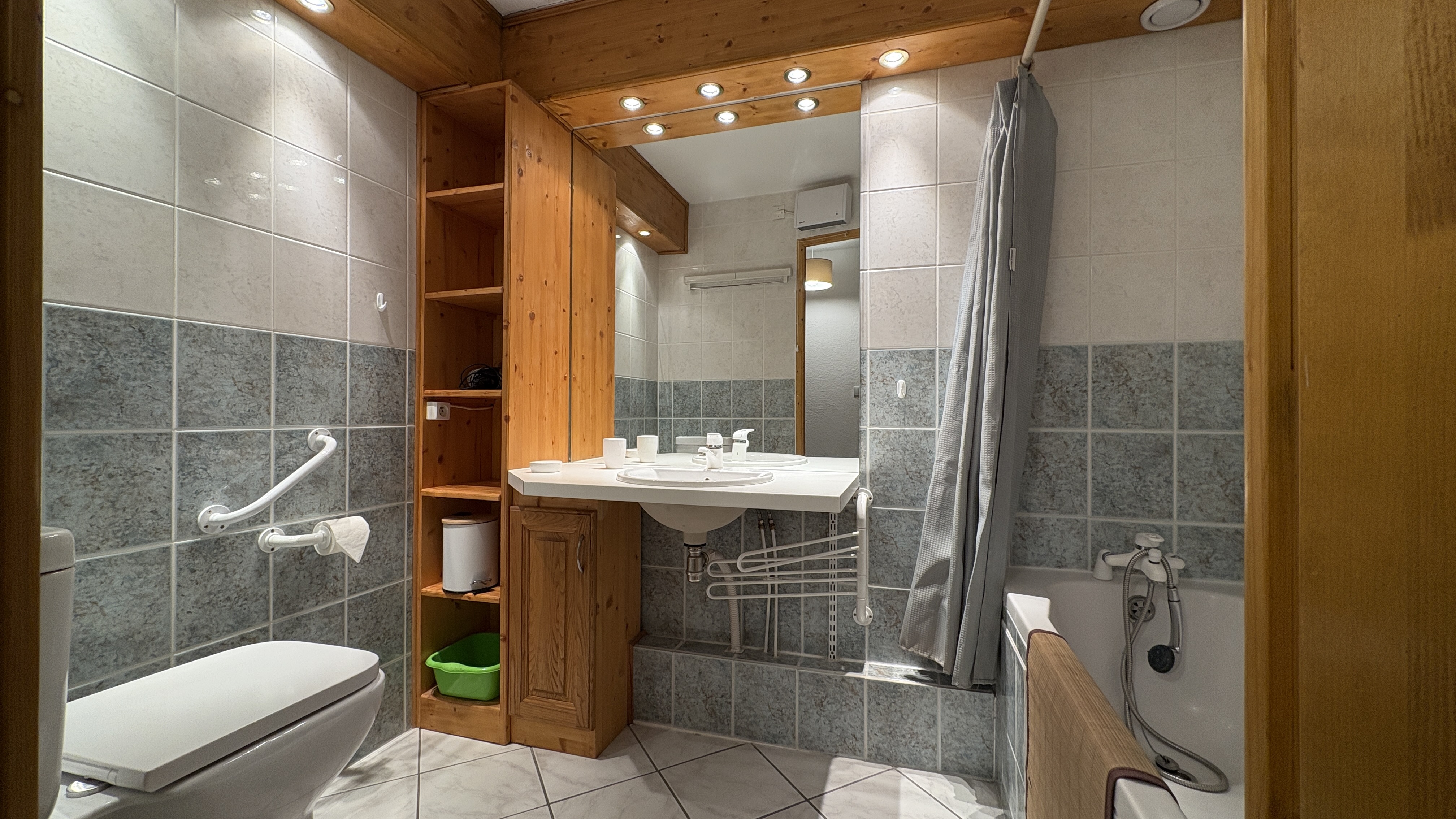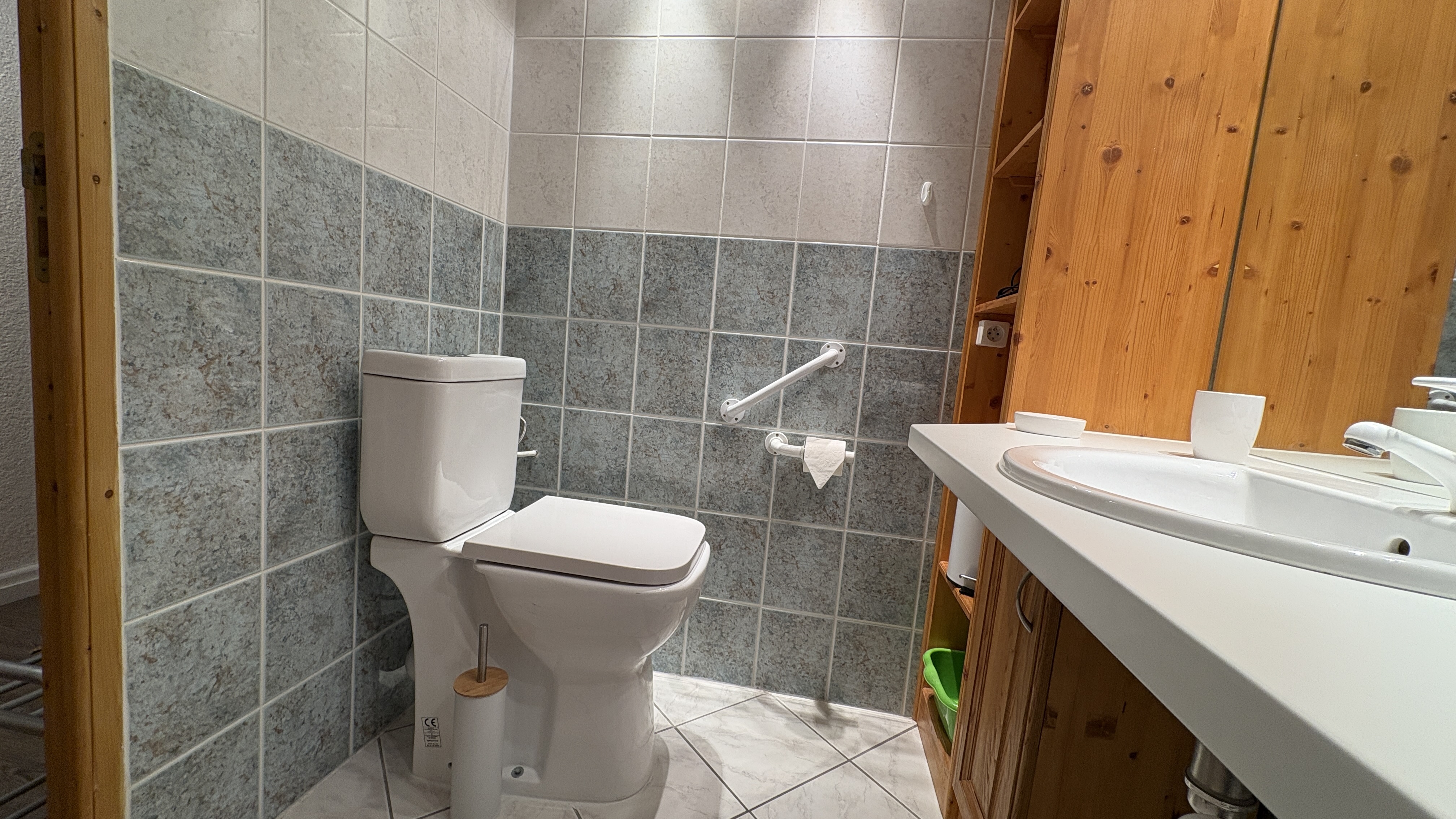 Une grande entrée, une grande SDB avec poignée WC, Baignoire avec poignée, cuisine ouverte sur séjour.