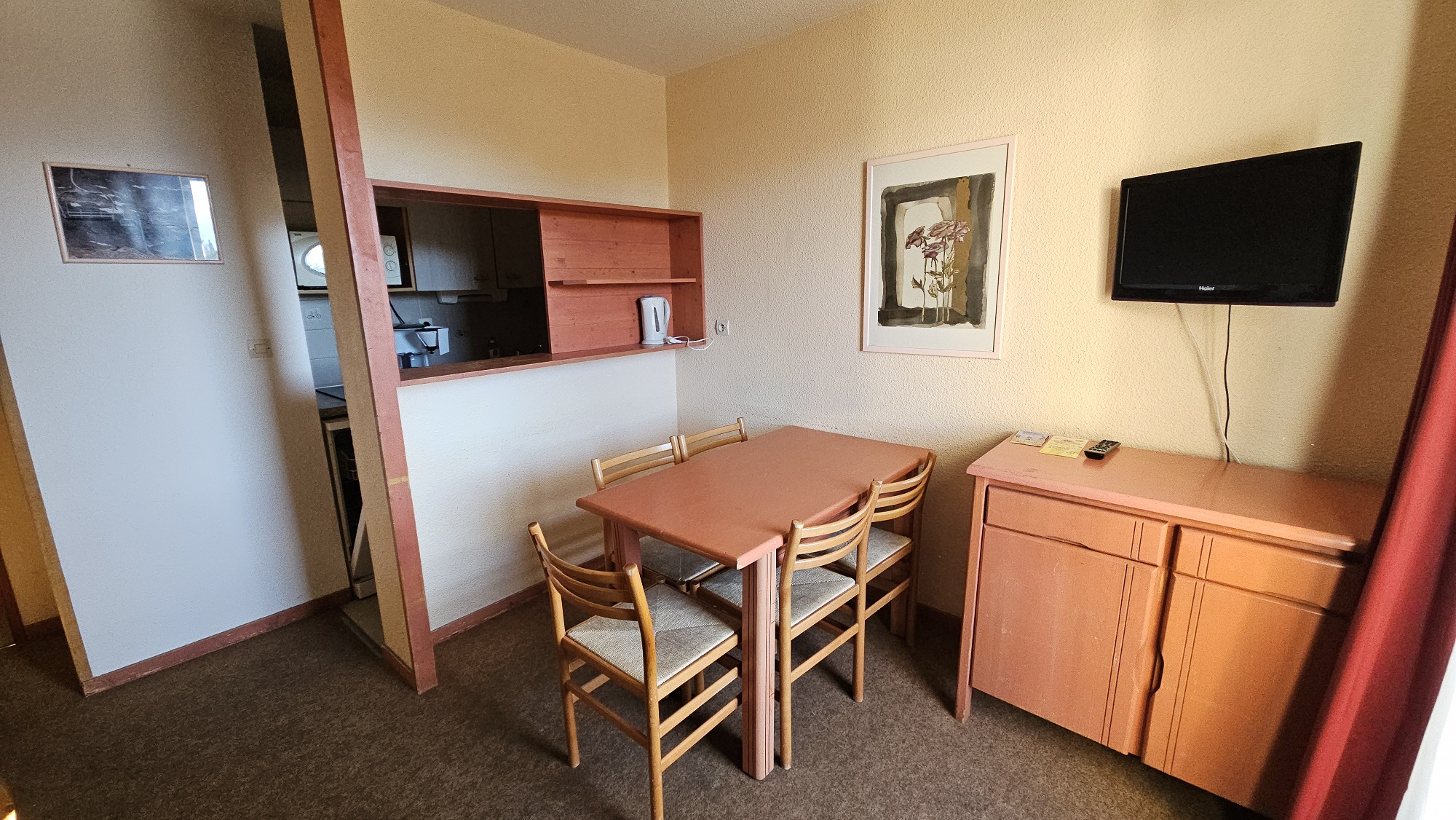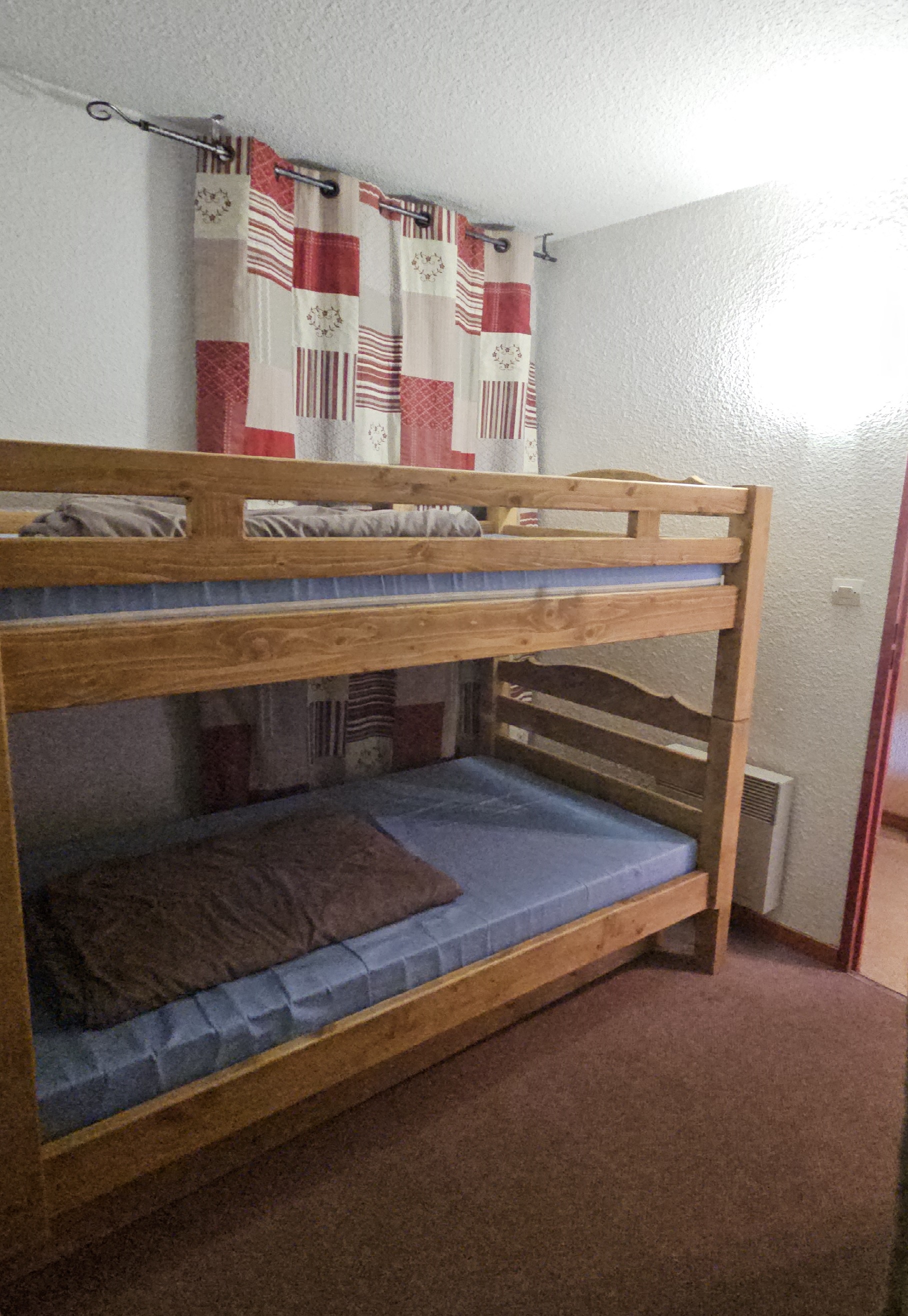 Appartement de 28 m2, 4/5 couchages, situé secteur des Bergers, proche des pistes et du centre commercial , 2 pièces avec 1 chambre équipée de lits superposés + 1 lit d'appoint, 1 salle de bain, 1 wc, 1 séjour avec lit banquette, table à manger, tv, coin cuisine avec cafetière, micro-onde, petit réfrigérateur, une plaque 2 feux, 1 balcon vue montagne et casier à ski.