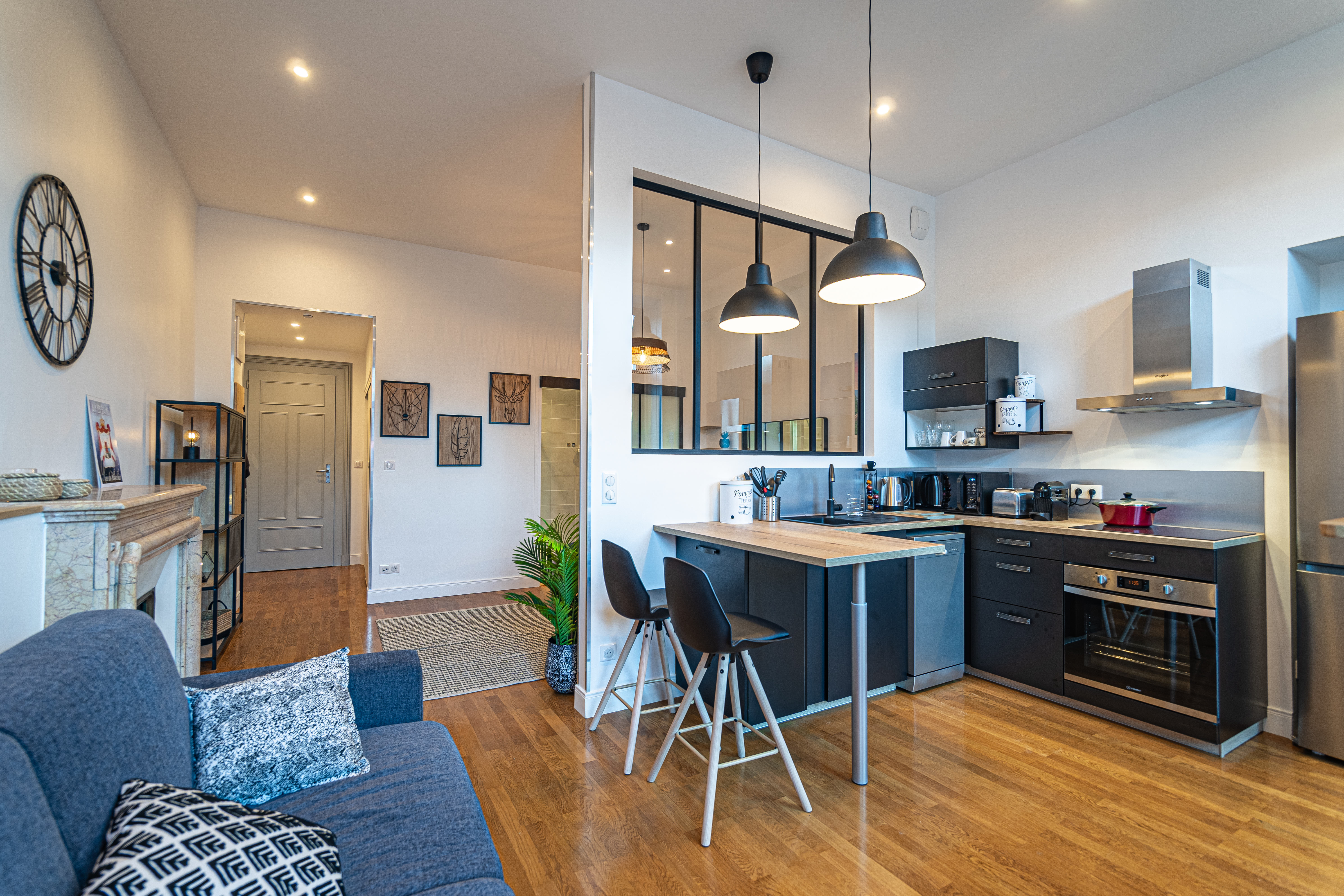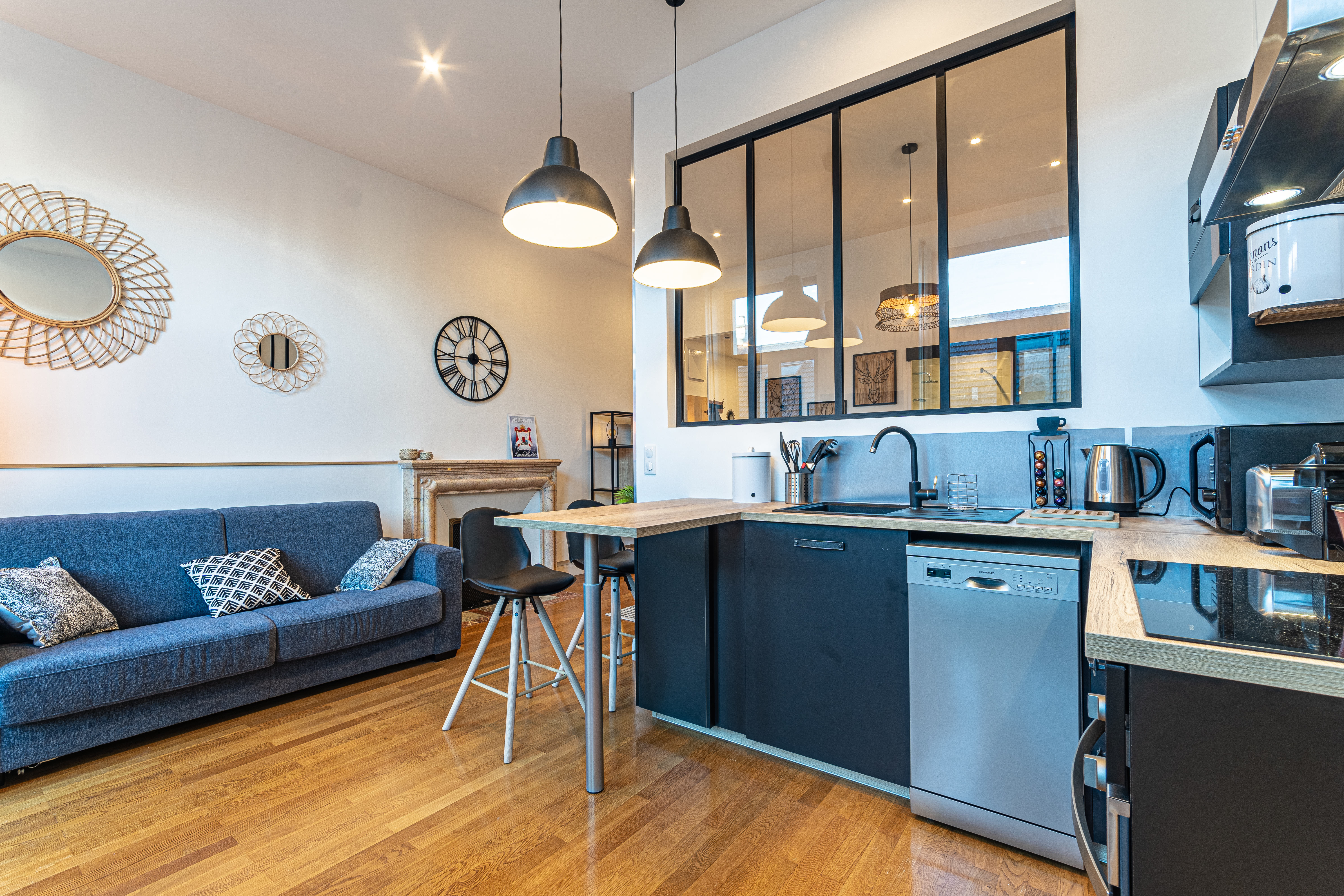 *Espace cuisine/séjour : mange debout avec 2 chaises de bar, éléments de cuisine haut et bas, lave-vaisselle, évier, micro-ondes, plaque de cuisson induction, hotte aspirante, four traditionnel encastré, réfrigérateur combiné congélateur, bouilloire, cafetière Nespresso classique, grille pain, vaisselles et ustensiles de cuisine et de cuisson, canapé convertible neuf à la manipulation aisée permettant un couchage en 140 cm x 190 cm, TV écran plat fixée au mur.
