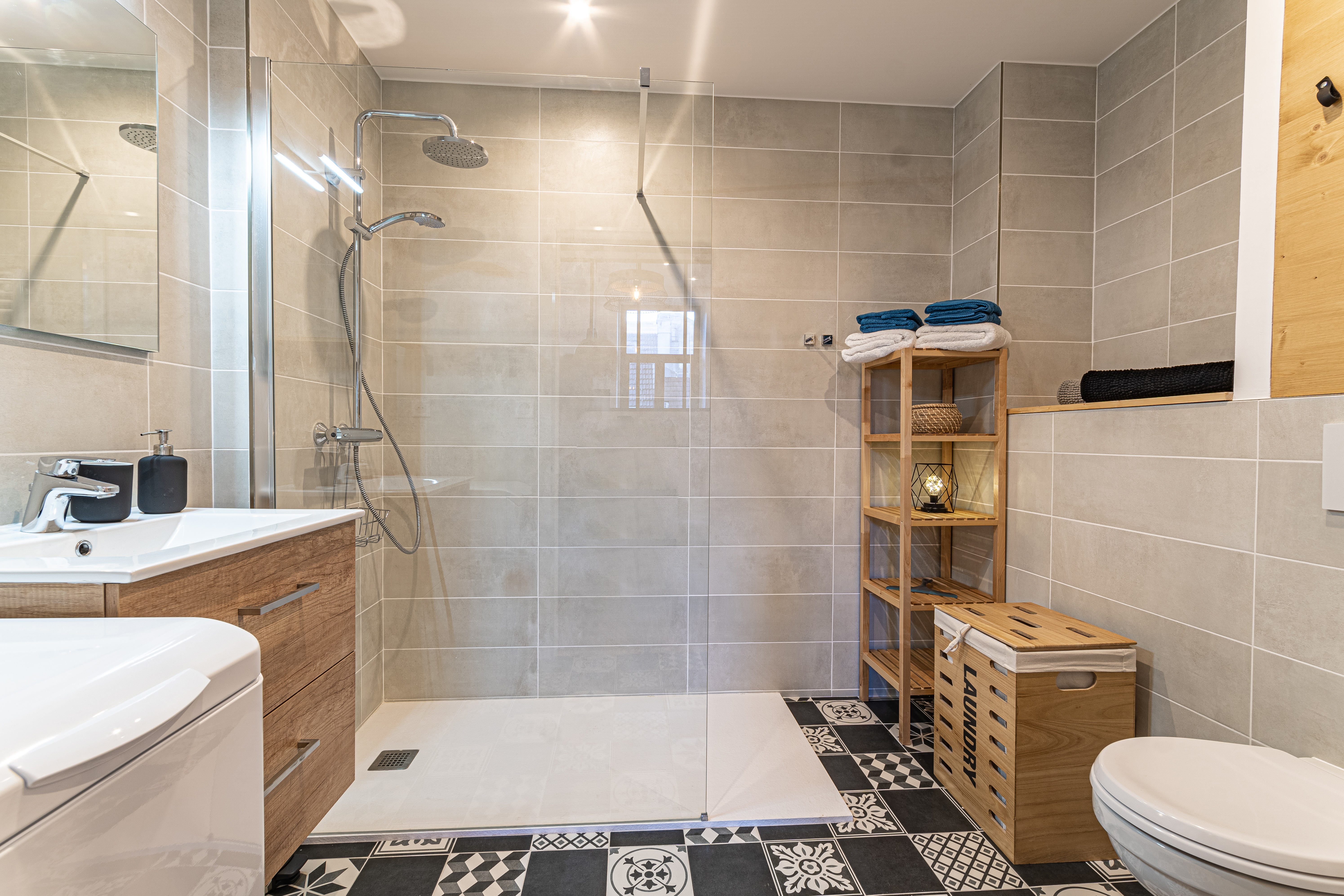 - SALLE D'EAU/WC (sol : carrelage / murs : peinture), douche à l'italienne avec paroi vitrée, vasque et meuble sous vasque, sèche cheveux, étagères, WC suspendu, lave-linge, panier à linge sale.
