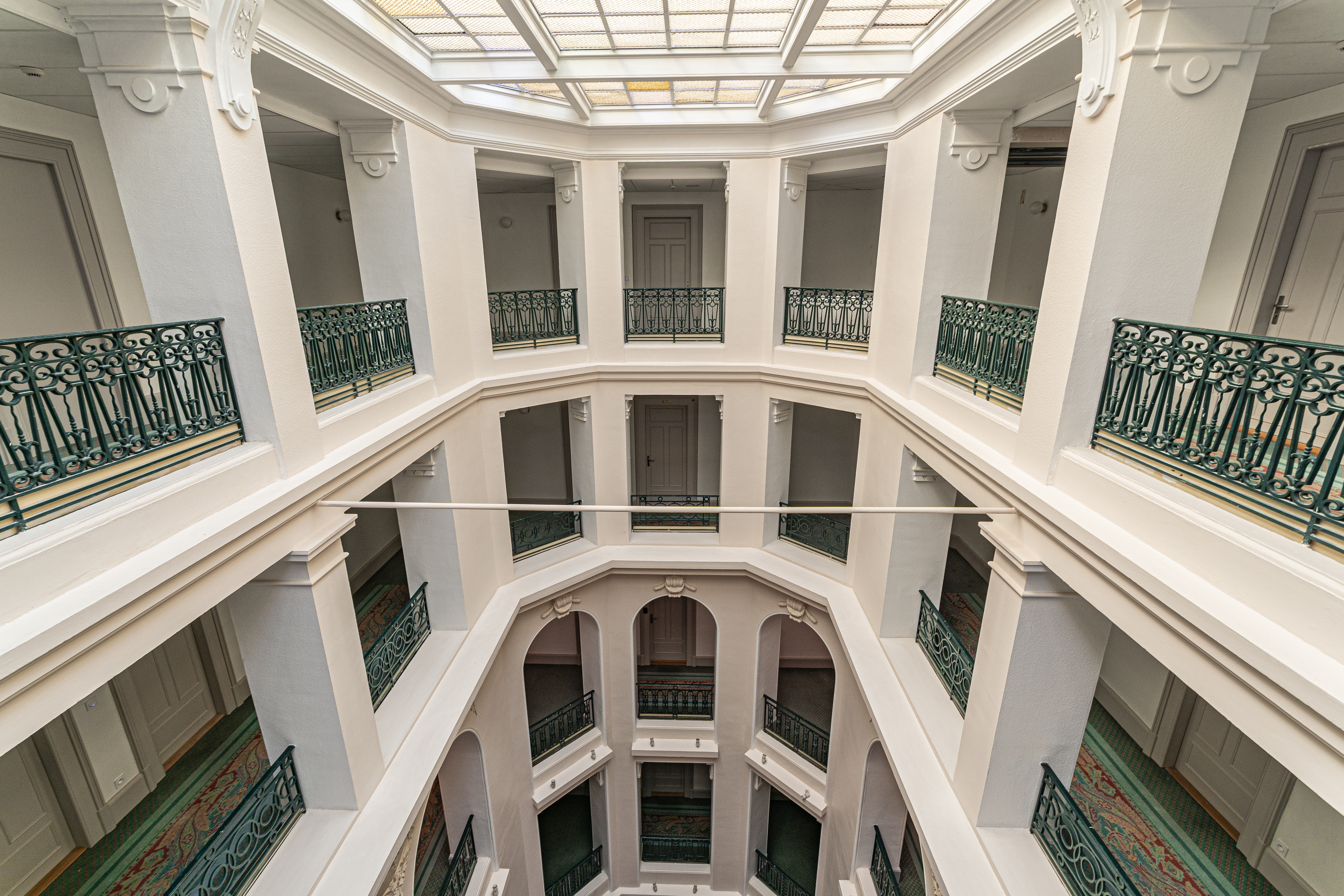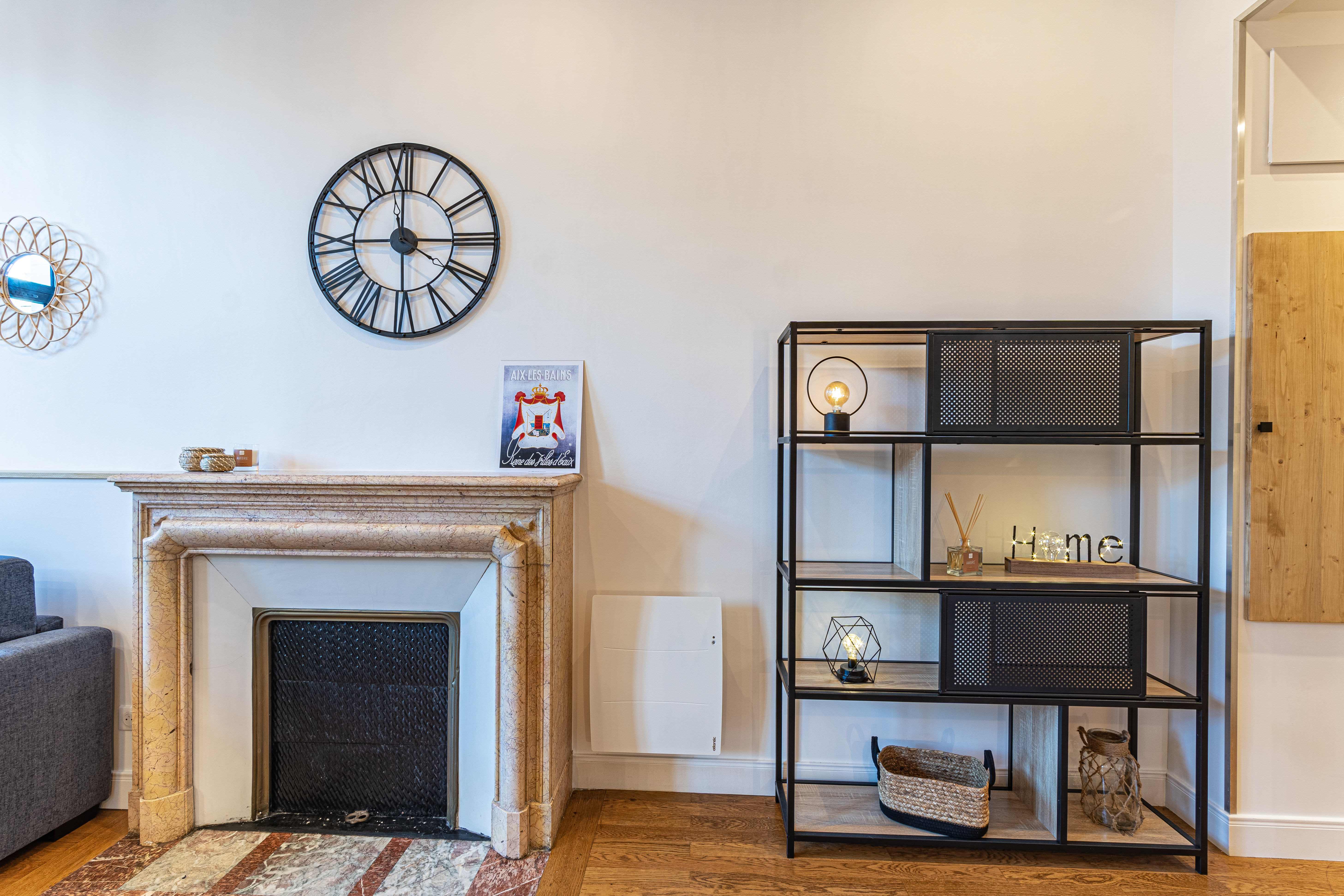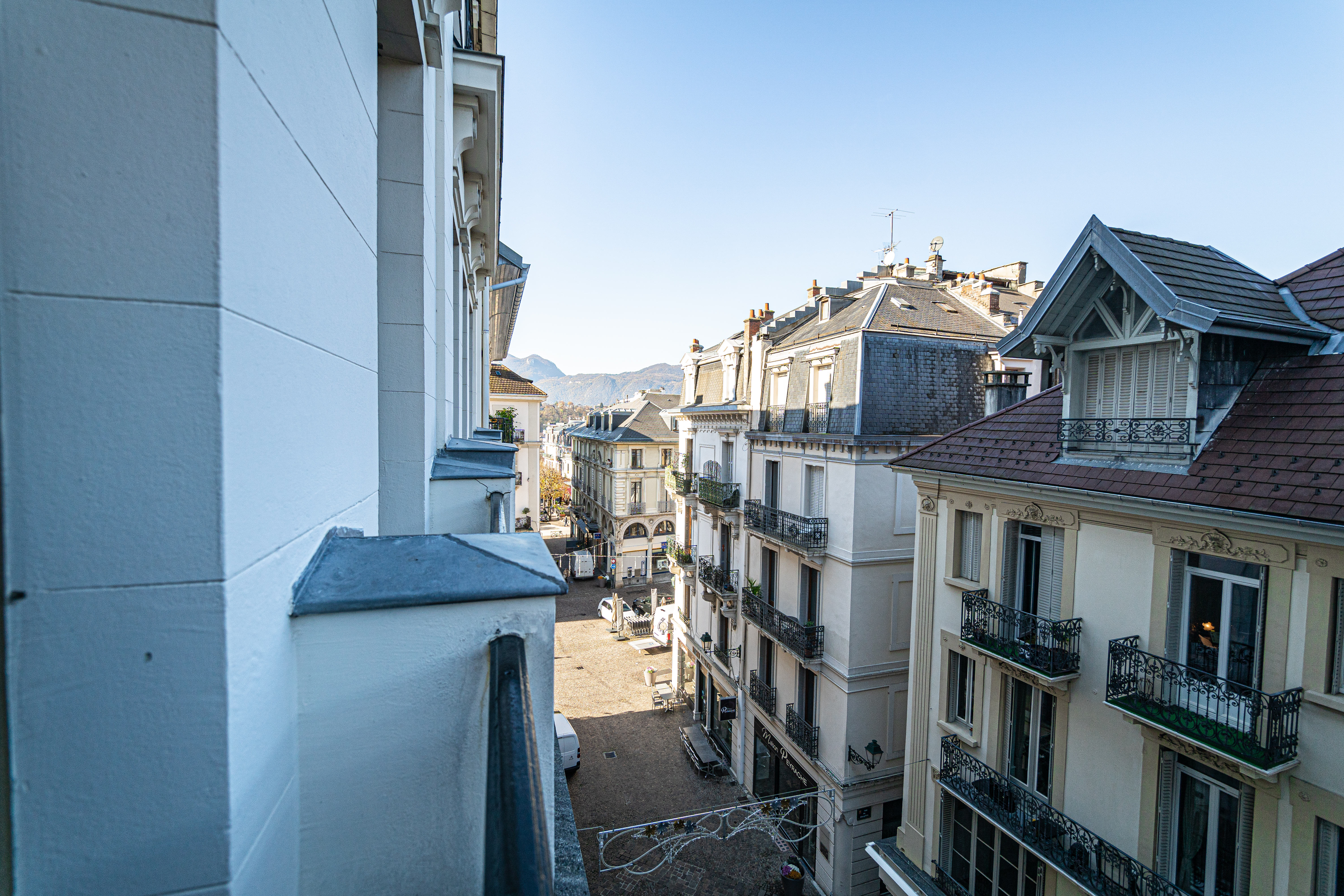 L'exposition est côté Nord de la résidence et donne sur le rue des Bains, rue pavée charmante, typique du quartier historique d'Aix-les-Bains. L'appartement est baigné de lumière par ses belles ouvertures toute hauteur.
