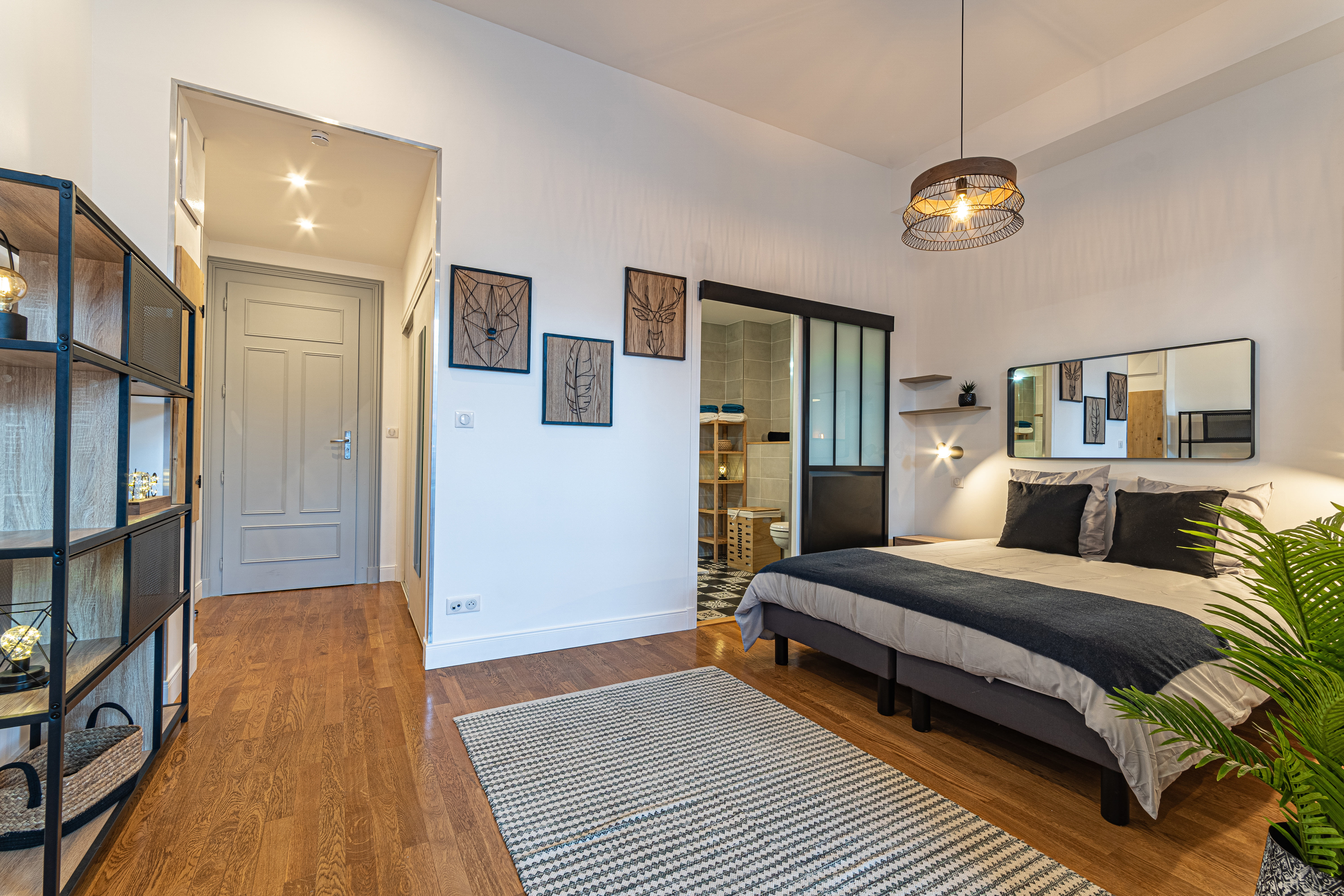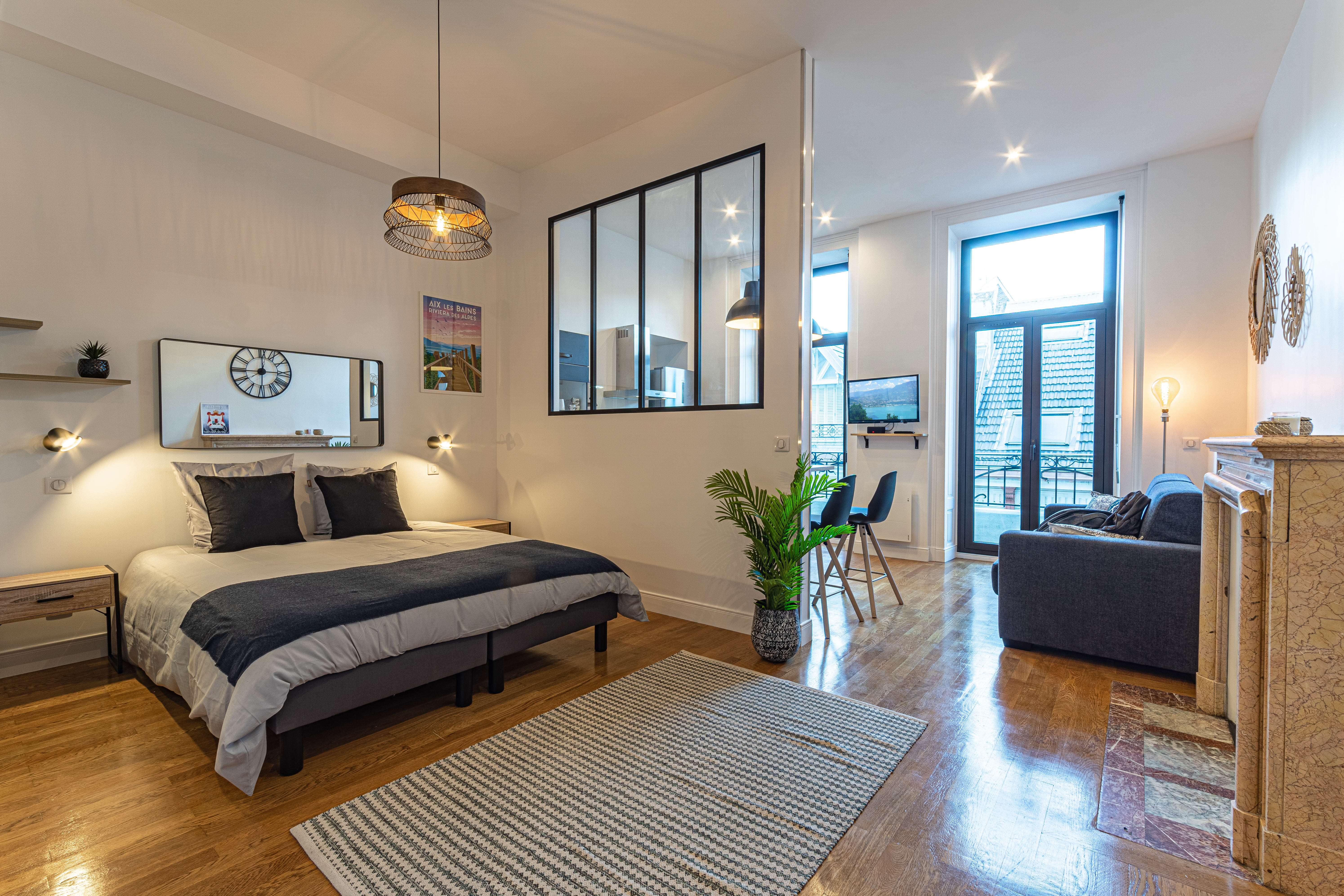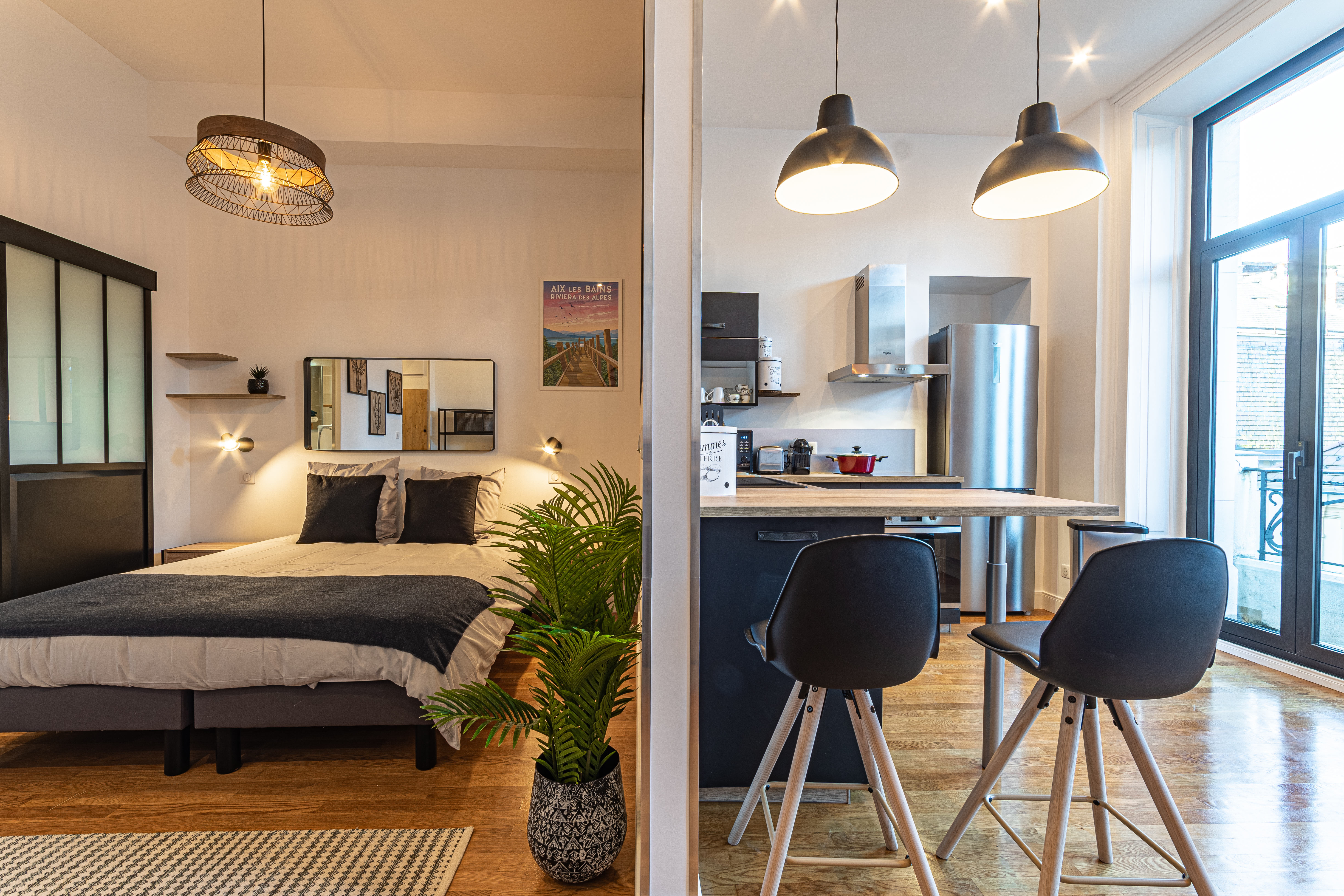 Ddécoré avec goût et raffinement, vous apprécierez votre séjour au c?ur du centre-ville historique et la qualité de vie Aixoise en profitant de toutes les commodités : 550 m de la gare, 100 m de l'arrêt de bus pour se rendre aux thermes Chevalley et surtout 150 m des commerces.