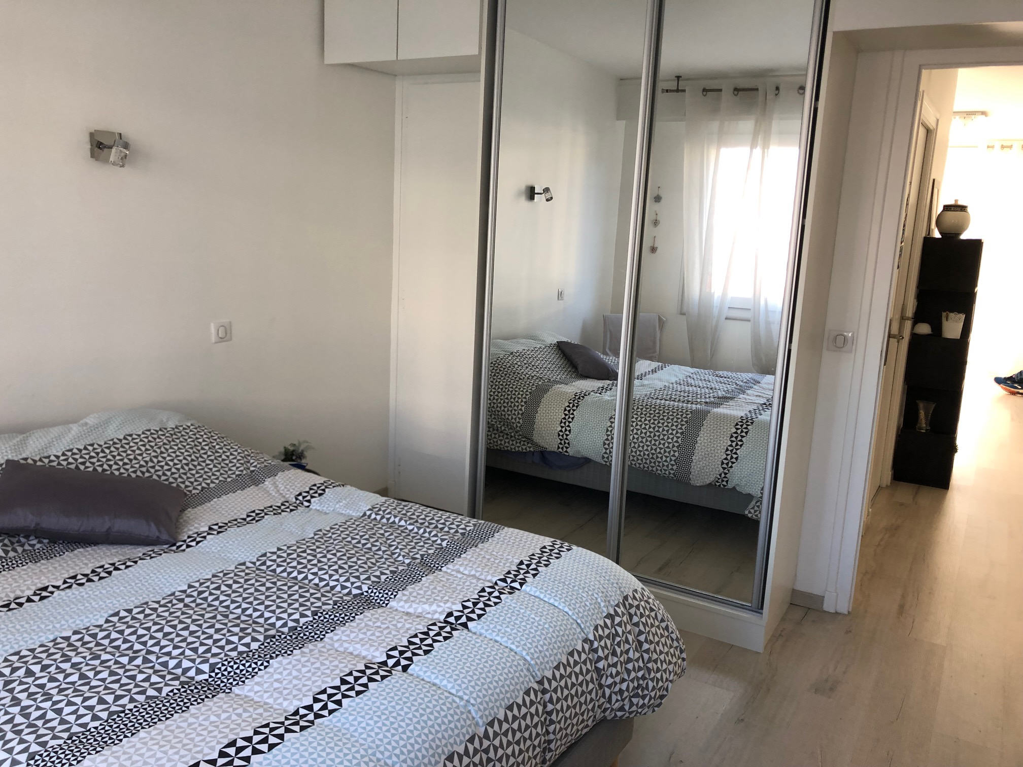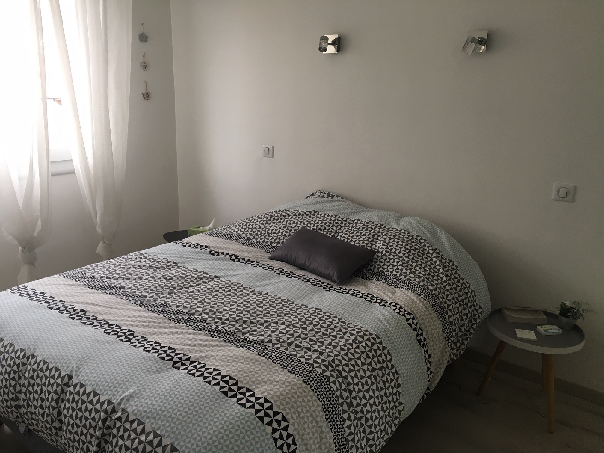 *CHAMBRE (Sol : parquet/Murs : peinture) : lit 140 x 190 cm, 1 couette, 2 oreillers, placard mural portes miroir coulissantes, 2 tables de chevet.