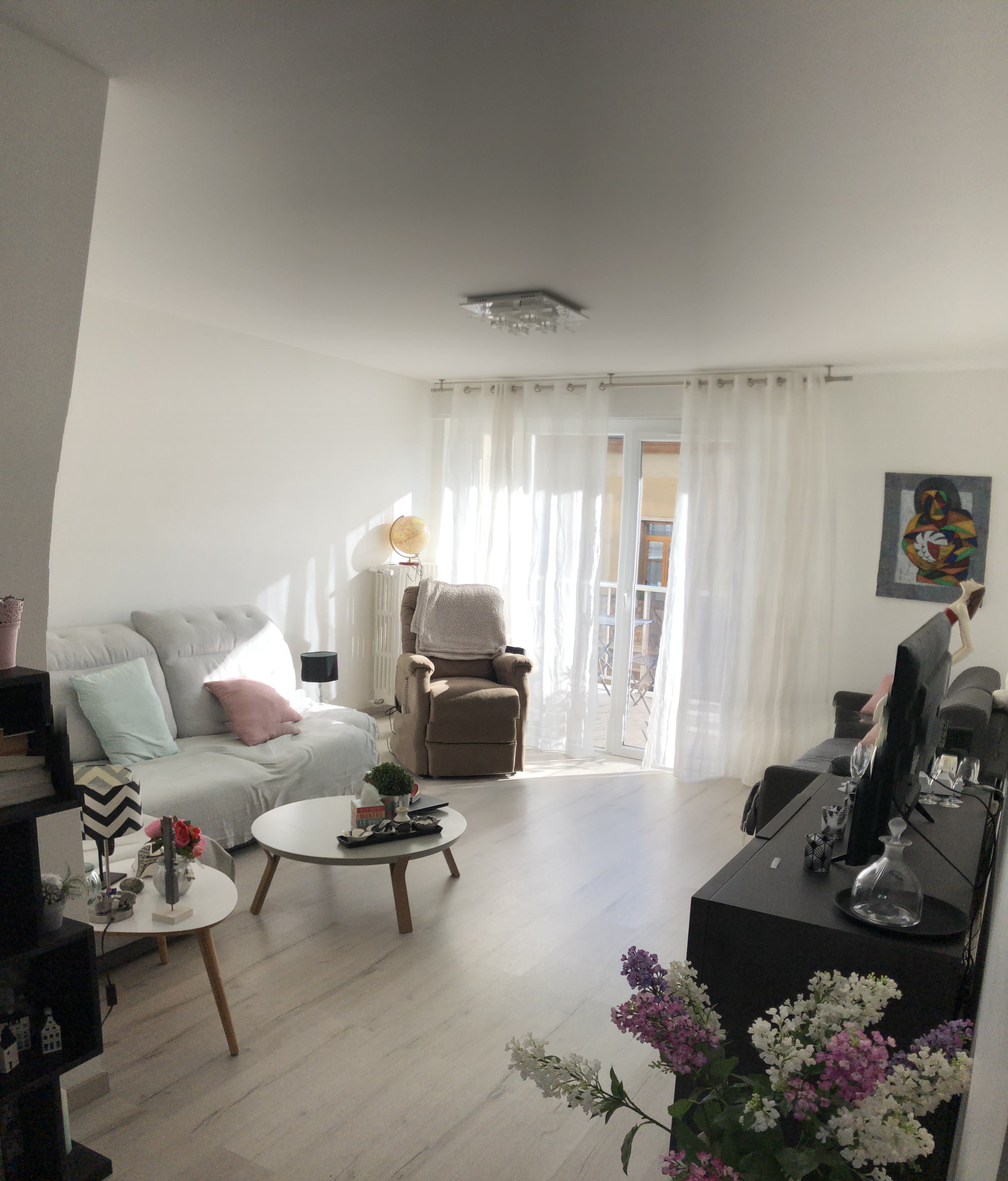 *SALON/SEJOUR (Sol : parquet/Murs : peinture) d'env. 25m² ouvert sur de grandes baies vitrées Sud, 2 tables basses rondes, canapé d'angle confortable, 1 fauteuil électrique, quelques coussins et plaids, TV/TNT écran plat, meuble TV type bahut (vaisselles et verres).