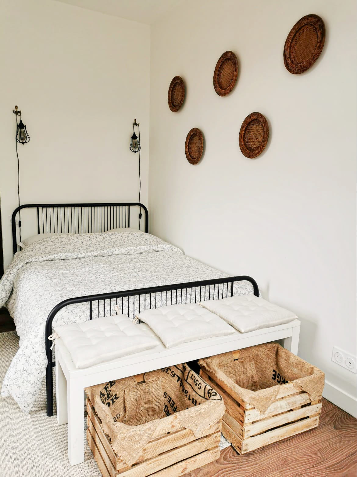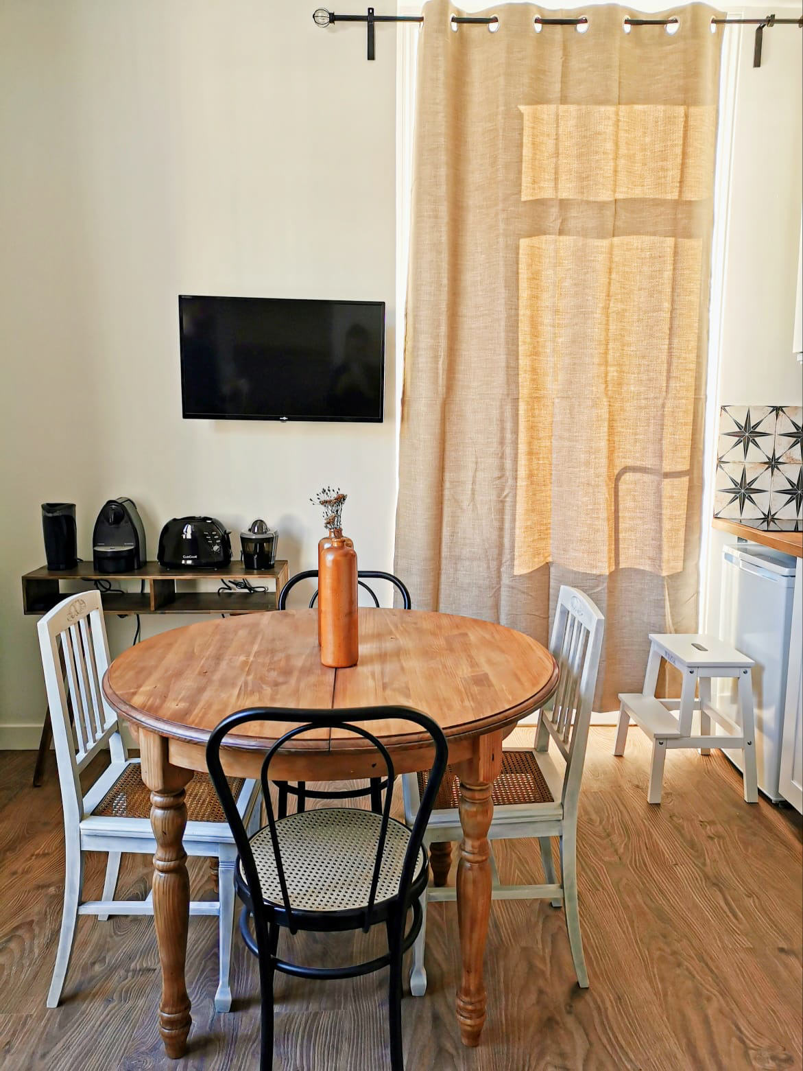 °COIN SEJOUR/COIN NUIT (Sol : parquet / Murs : peinture) : meuble console étroit, TV/TNT écran plat fixé au mur, table à manger avec 4 chaises, lit 140 cm x 190 cm (neuf et très confortable), oreillers et couette, placard mural avec penderie et étagère, banc avec caisse de rangements, rangements sous le lit.
