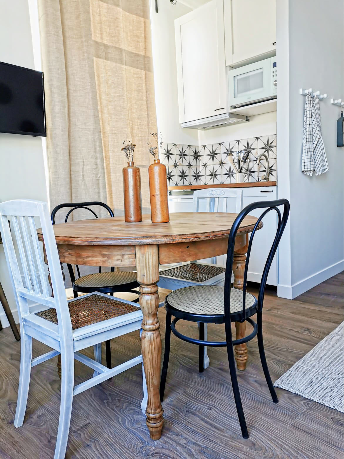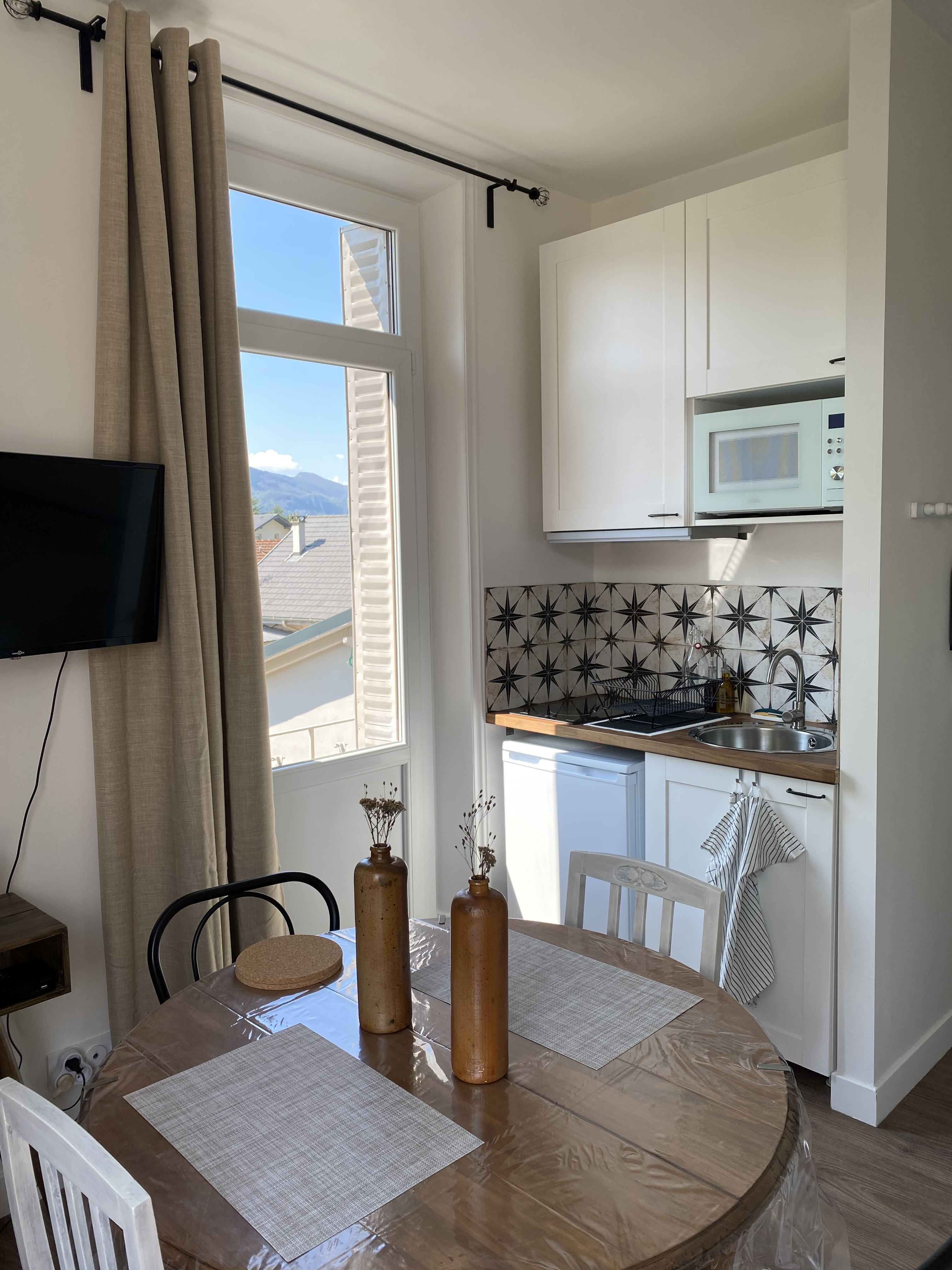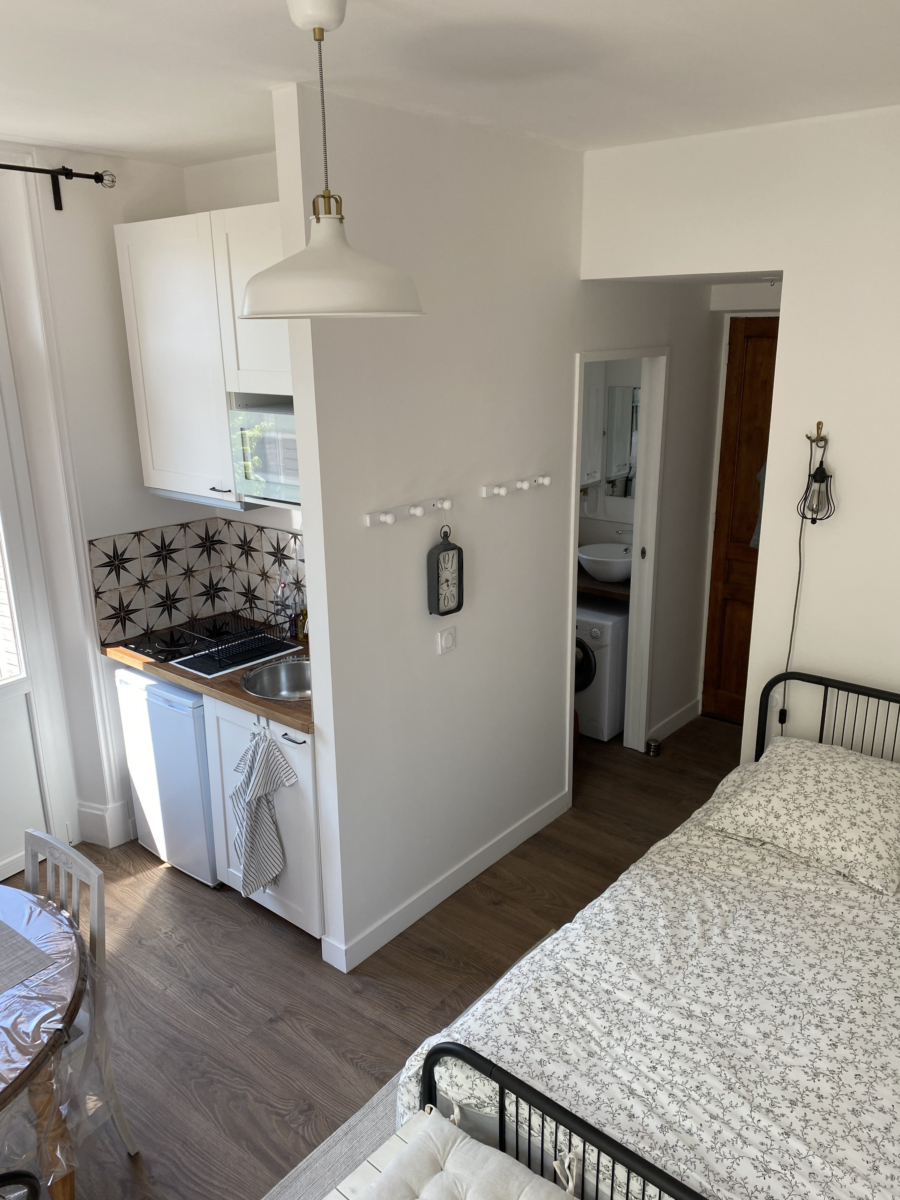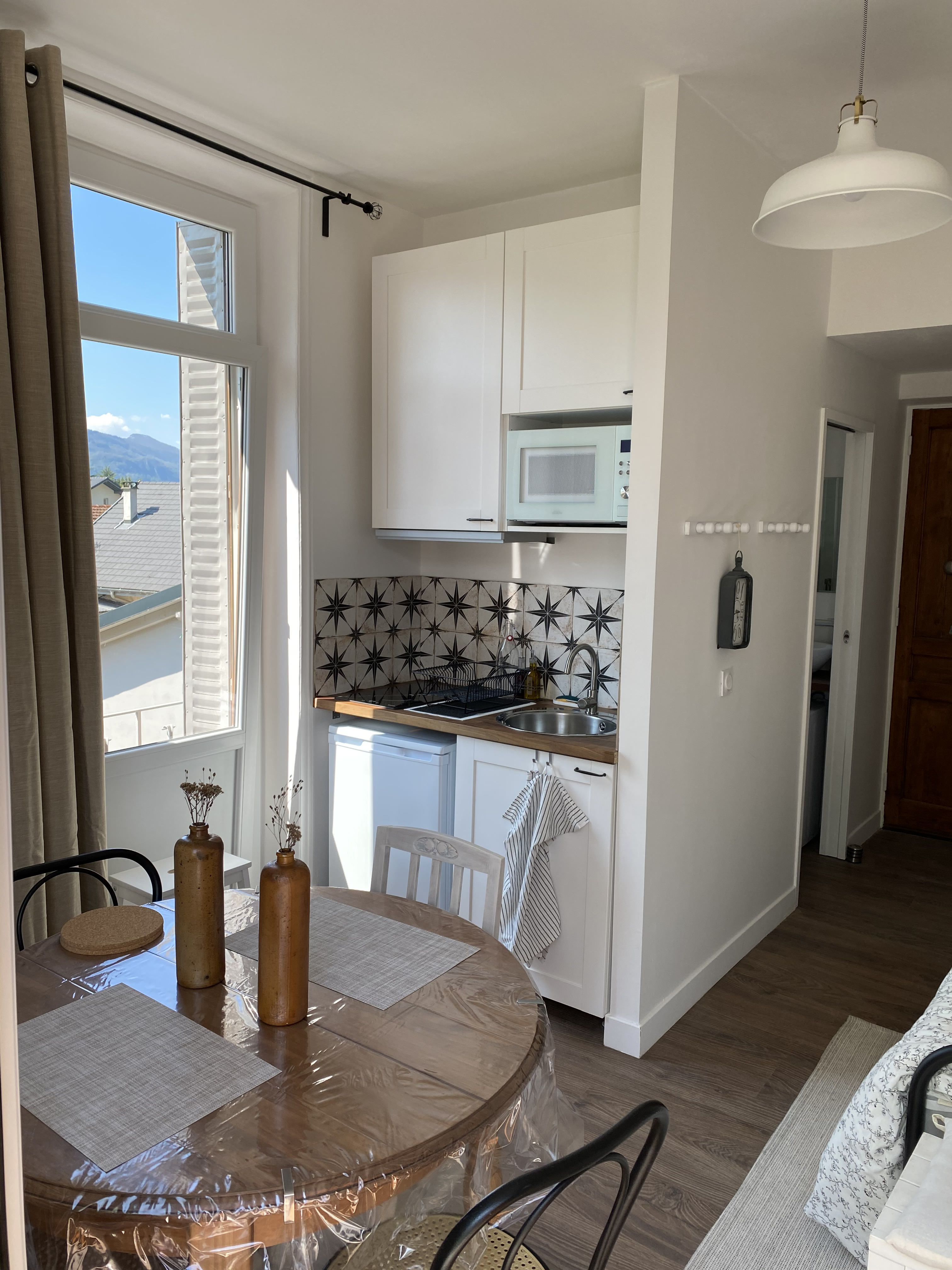 °CUISINE EQUIPEE (Sol : parquet/Murs : peinture et faïence) : éléments de cuisine haut et bas, plan de travail, réfrigérateur table-top, évier, égouttoir, plaque de cuisson induction (2 feux), hotte aspirante, micro-ondes, cafetière Nespresso (capsule classique), bouilloire, grille-pain, presse-agrumes, batterie complète vaisselles/casseroles.