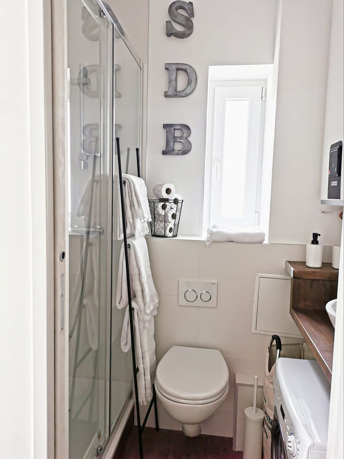 °SALLE D'EAU avec WC (Sol : carrelage/Murs : faïence et peinture) : vasque, miroir, douche à l'italienne spacieuse (120x80 cm), lave-linge, panier à linge, sèche-cheveux.