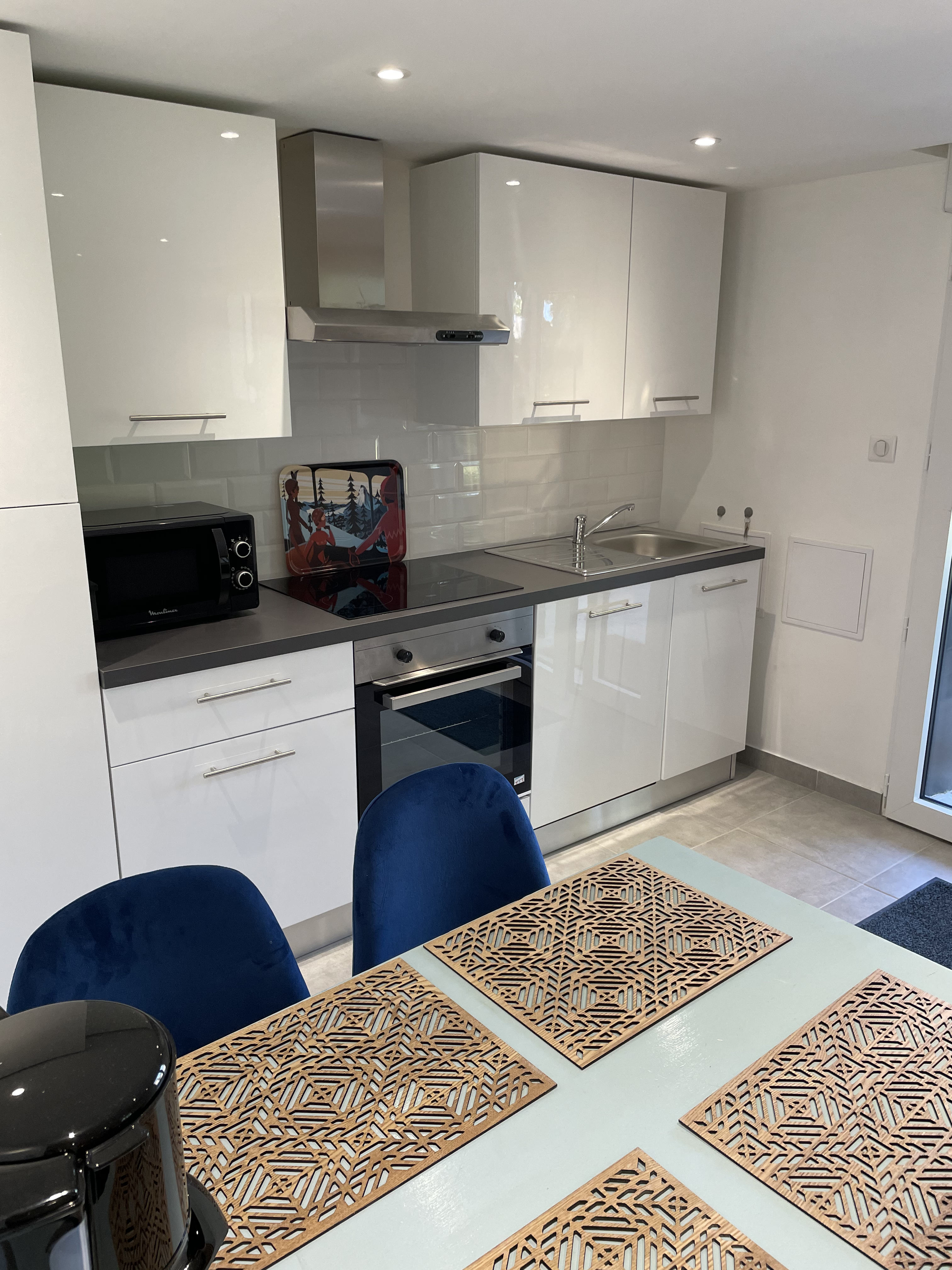 -CUISINE : meubles haut et bas, évier avec partie égouttoir, réfrigérateur avec compartiment congélateur, hotte, plaque de cuisson, four encastré, lave-vaisselle, cafetière filtre traditionnelle, bouilloire, grille-pain, table rectangulaire avec 4 chaises, vaisselle, ustensiles de cuisine et de cuisson.