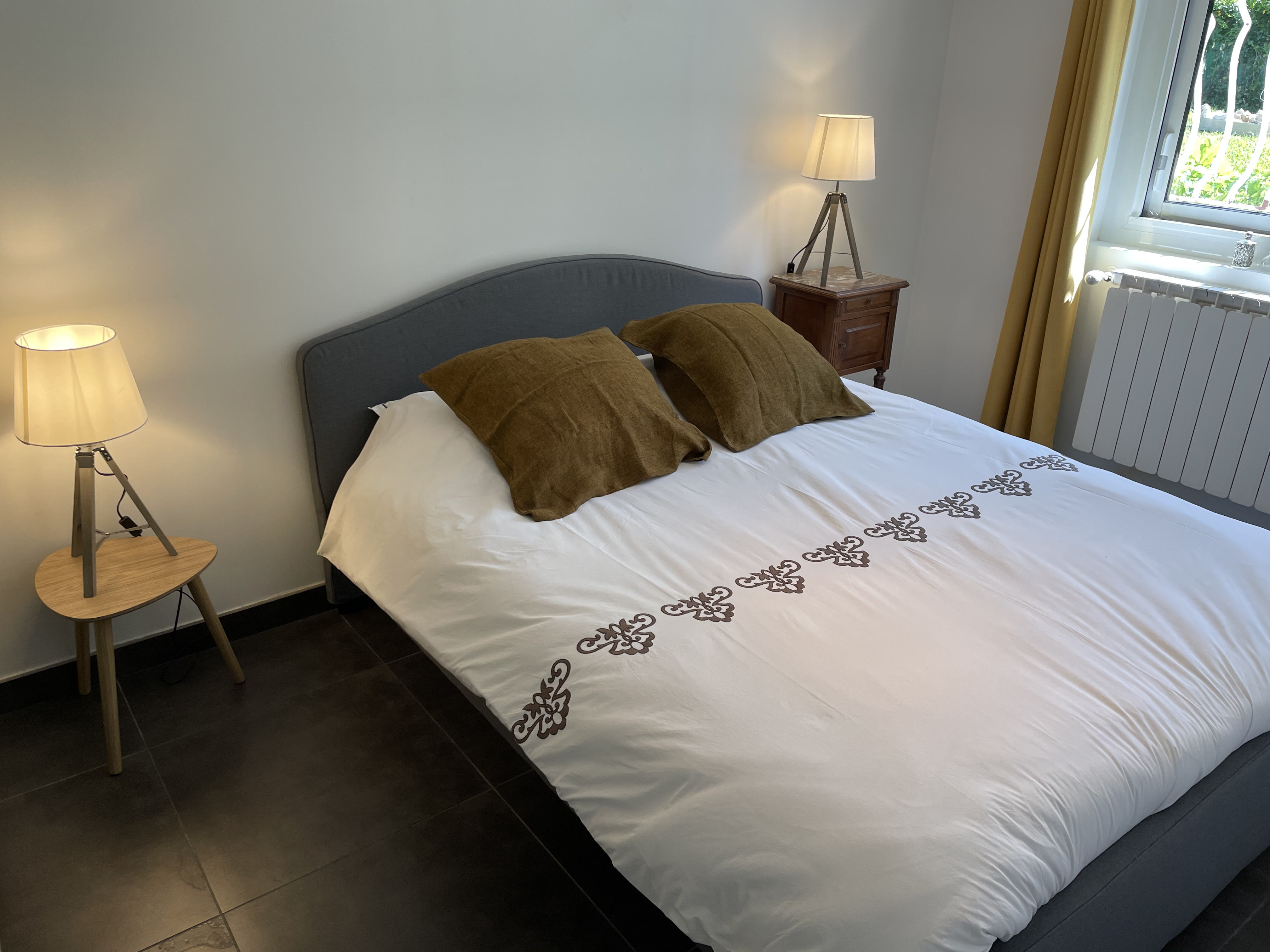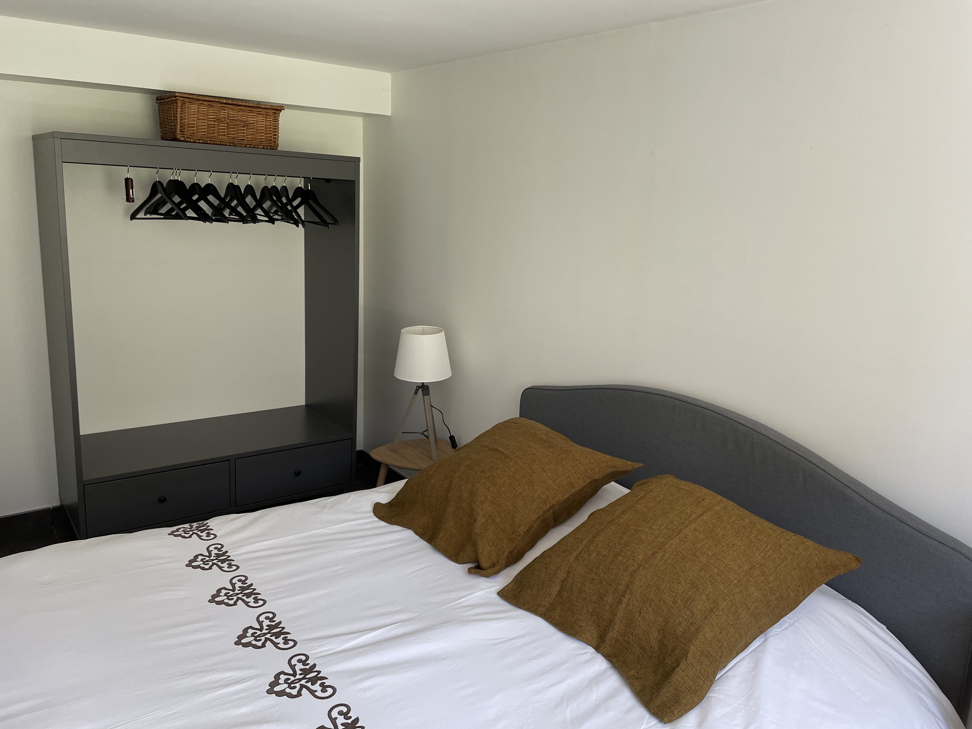 *CHAMBRE : lit 2 places 180 cm x 200 cm, 2 oreillers carrés, 1 couette, 2 chevets et lampes de chevet, placard à vêtement (lots de cintres).