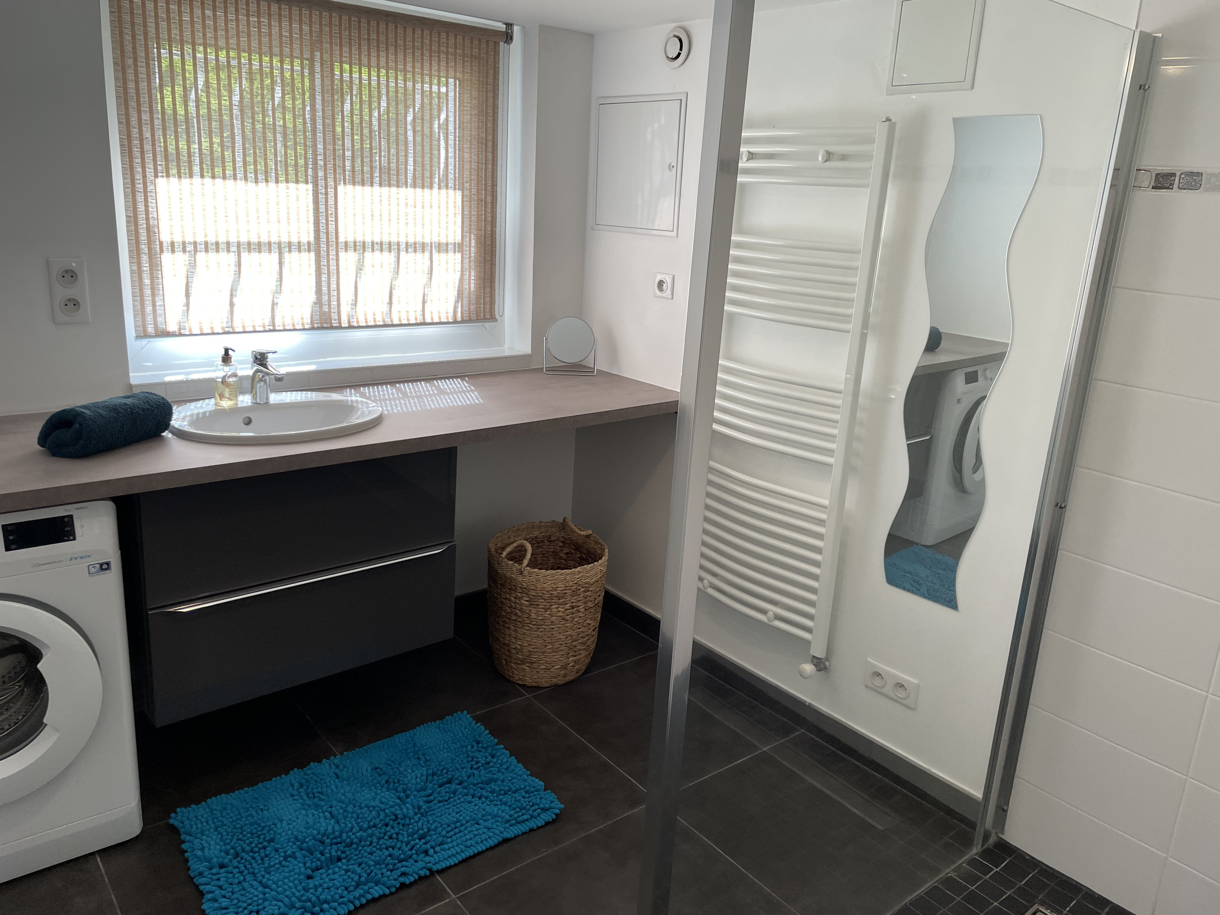 *SALLE D'EAU (Sol : carrelage / Murs : faïence et peinture) douche à l'italienne, vasque et meuble sous vasque, plan de travail de salle de bains, lave-linge.