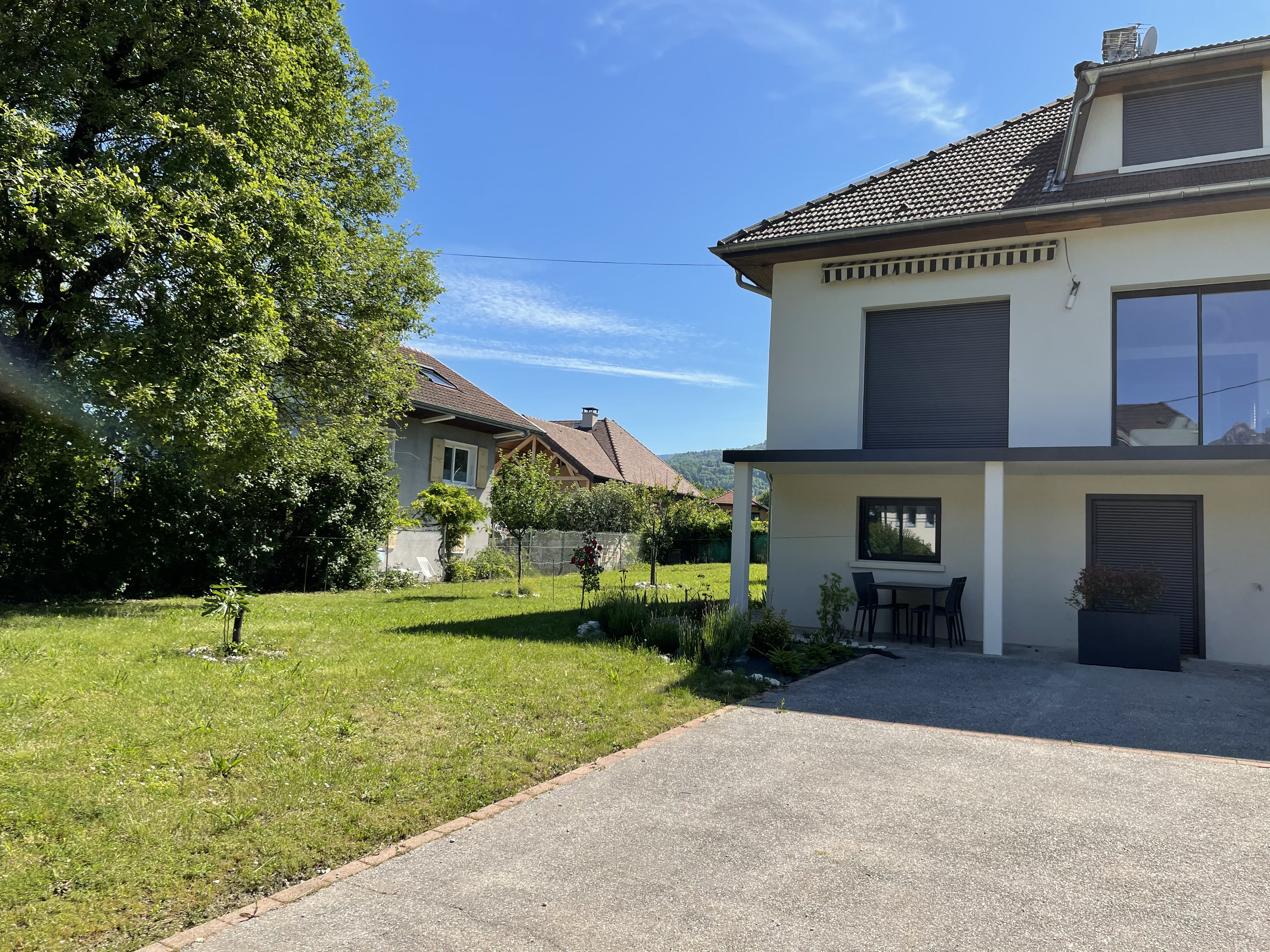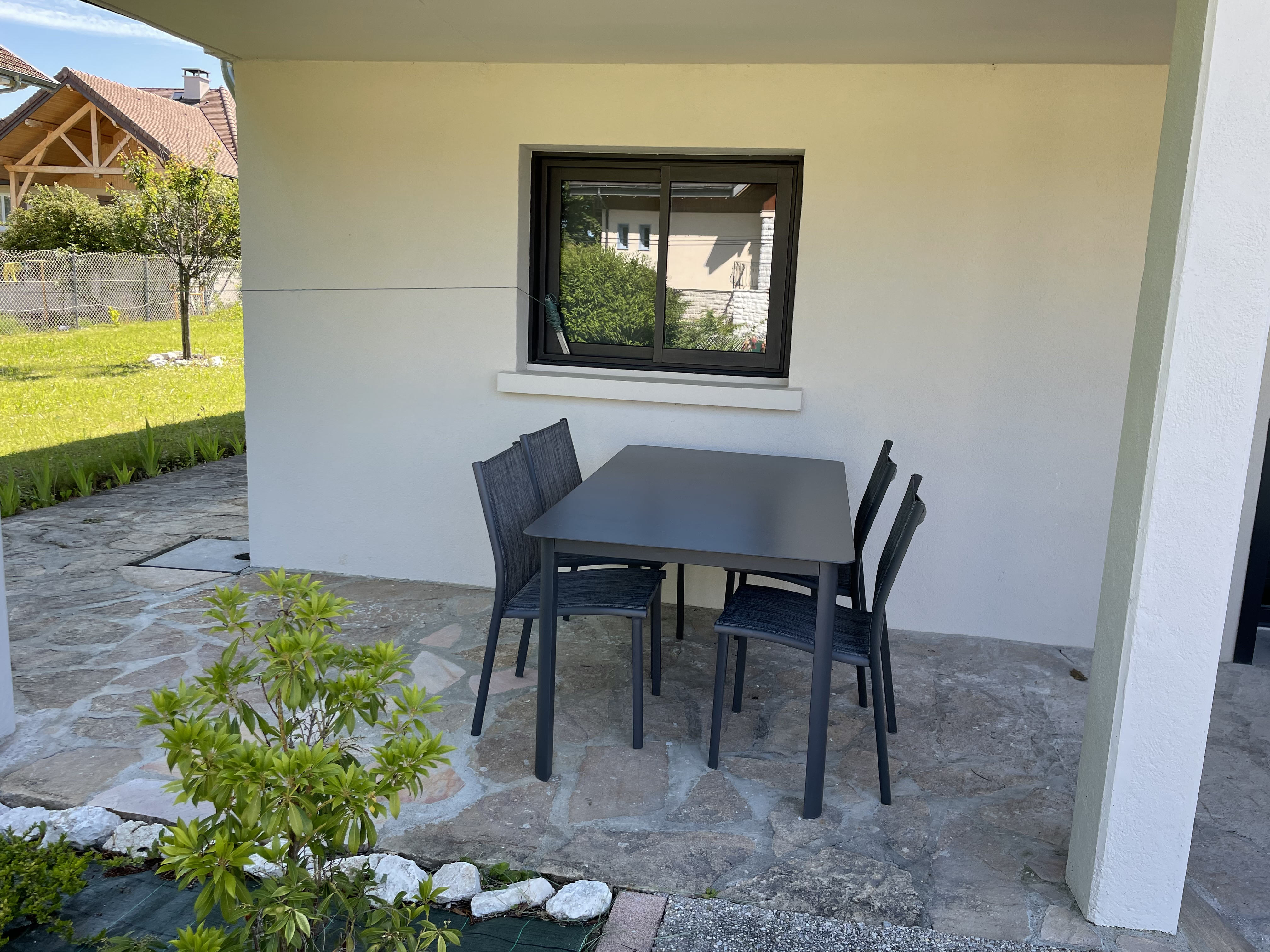 *TERRASSE Ouest (Sol : carrelage / Murs : façade) table et 4 chaises d'extérieur et accès à l'espace jardin.