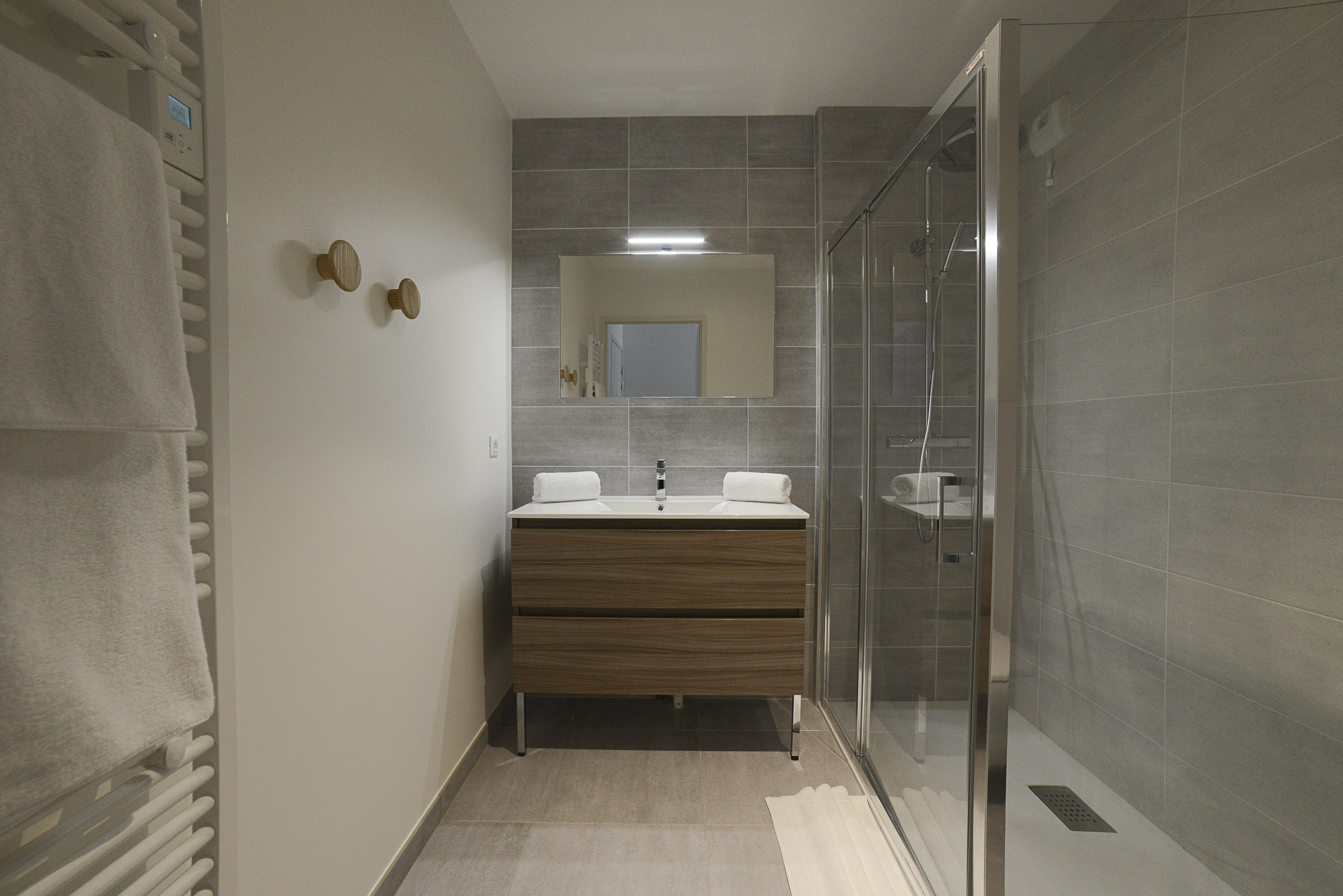 *SALLE D'EAU (Sol : carrelage / Murs : faïence et peinture) belle douche à l'italienne, lavabo grande vasque, sèche-cheveux, radiateur sèche-serviettes.