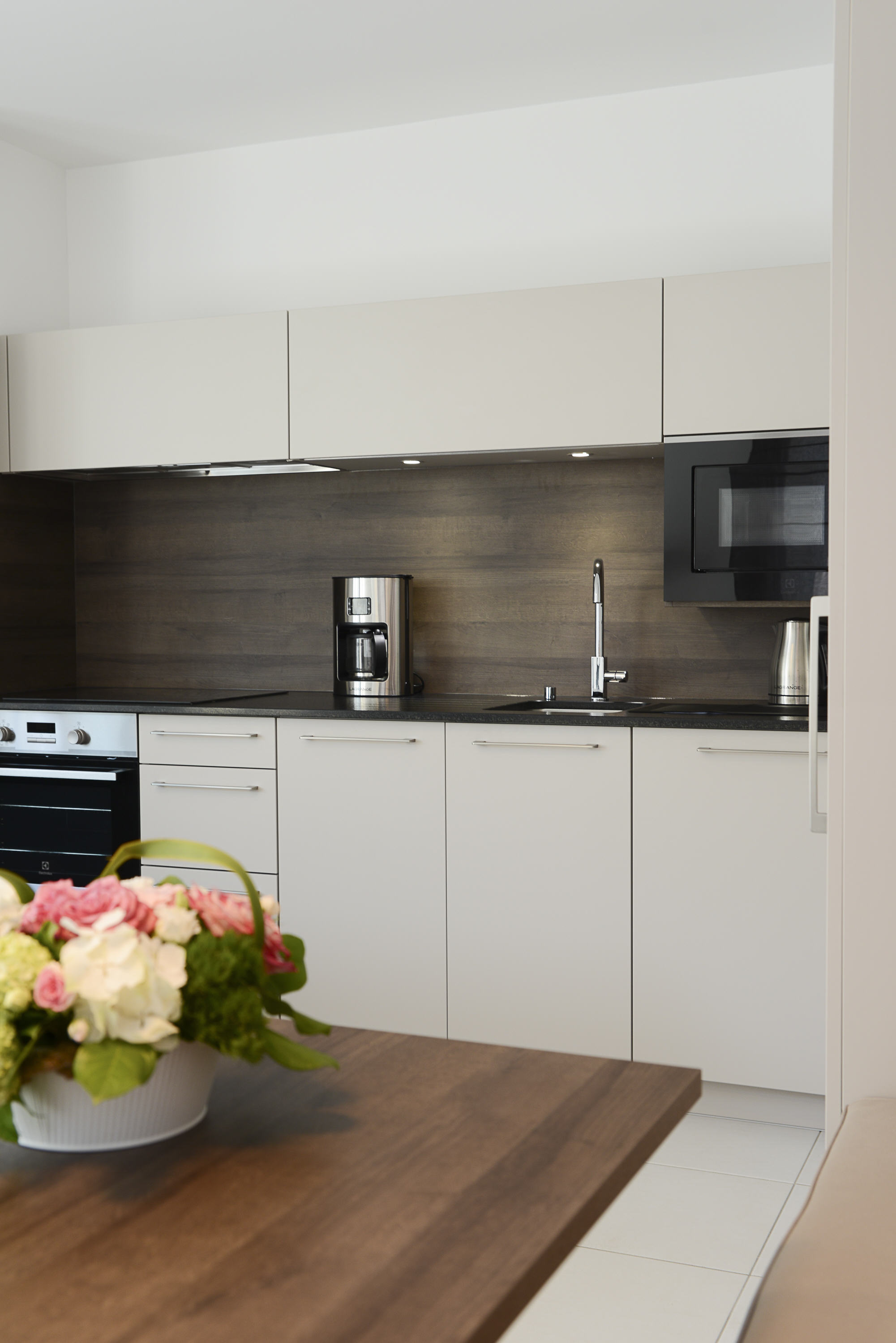-CUISINE (Sol : carrelage / Murs : crédence et peinture) : plaques de cuisson induction, hotte aspirante, four à nettoyage pyrolyse, four micro-ondes, lave-vaisselle, lave-linge, réfrigérateur avec congélateur, cafetière, bouilloire, grille-pain, appareil à raclette, étendage tancarville, fer et table à repasser, aspirateur, nécessaire de nettoyage.