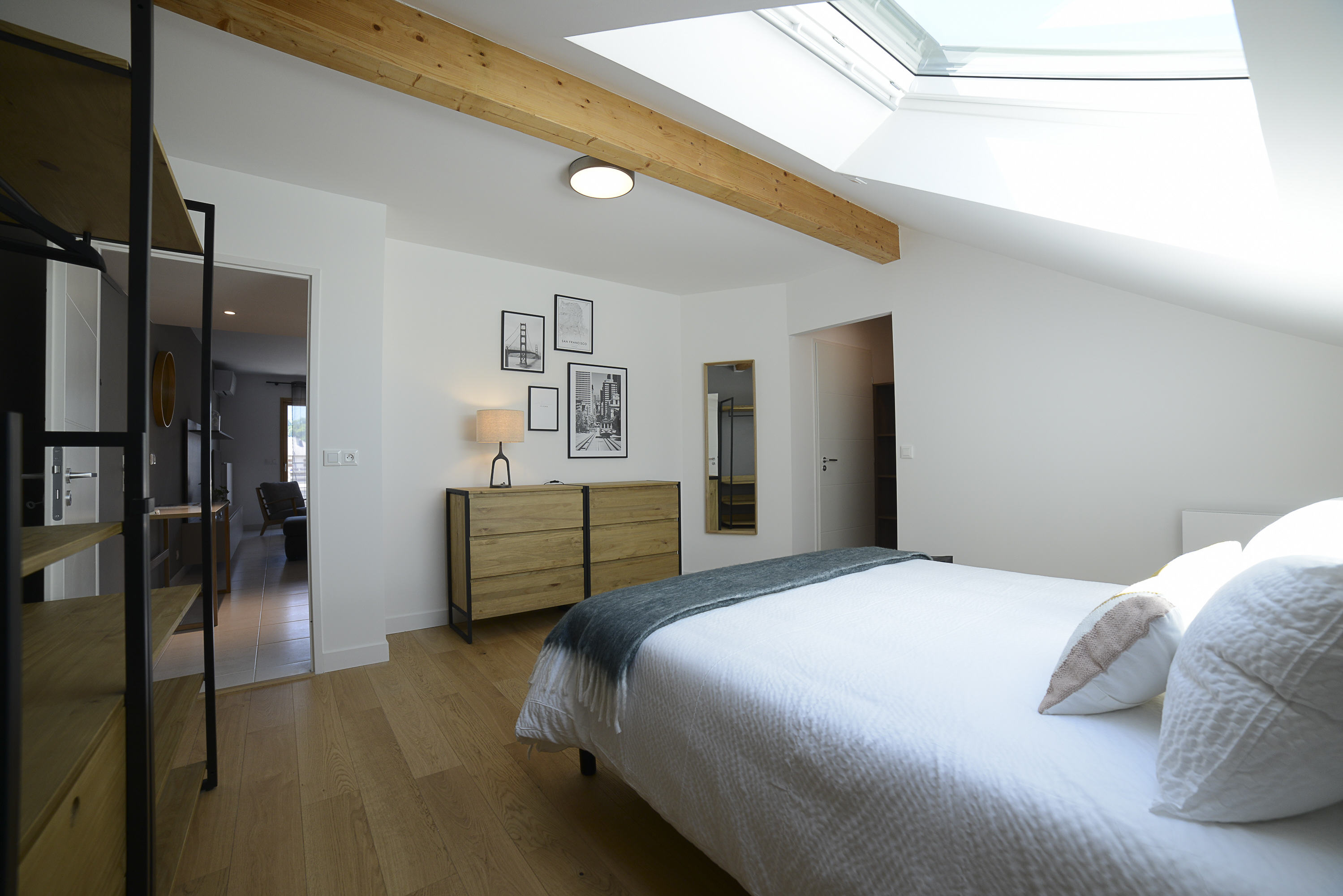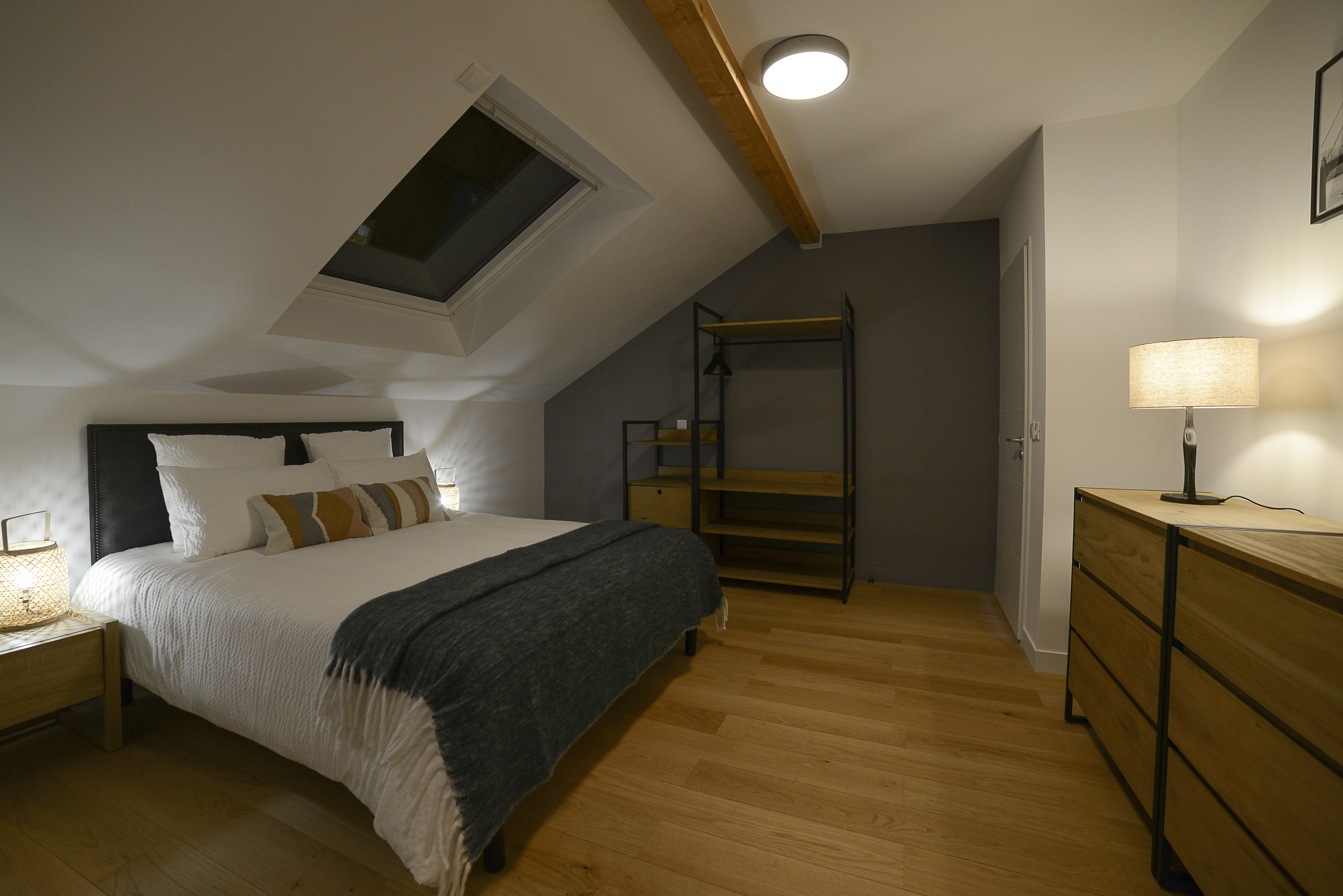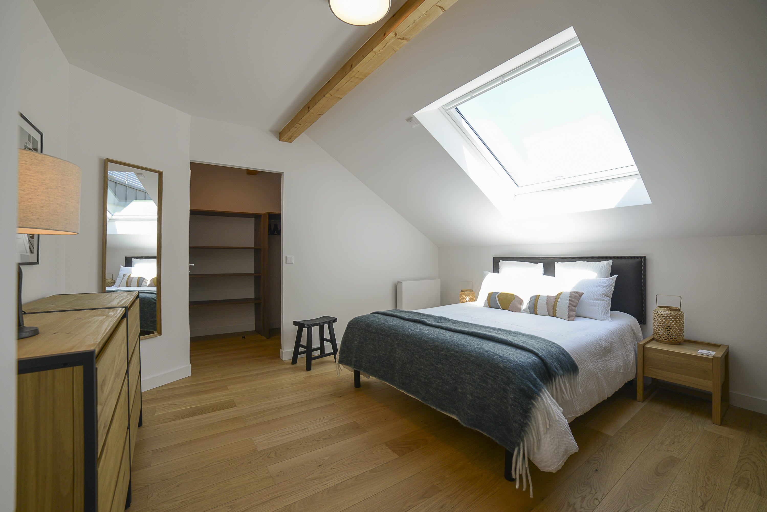 -CHAMBRE (Sol : carrelage / Murs : peinture) lit 160x200cm (literie neuve), tables de chevet, armoire avec étagères, tiroirs et penderie, fenêtre Vélux grand format, espace dressing.