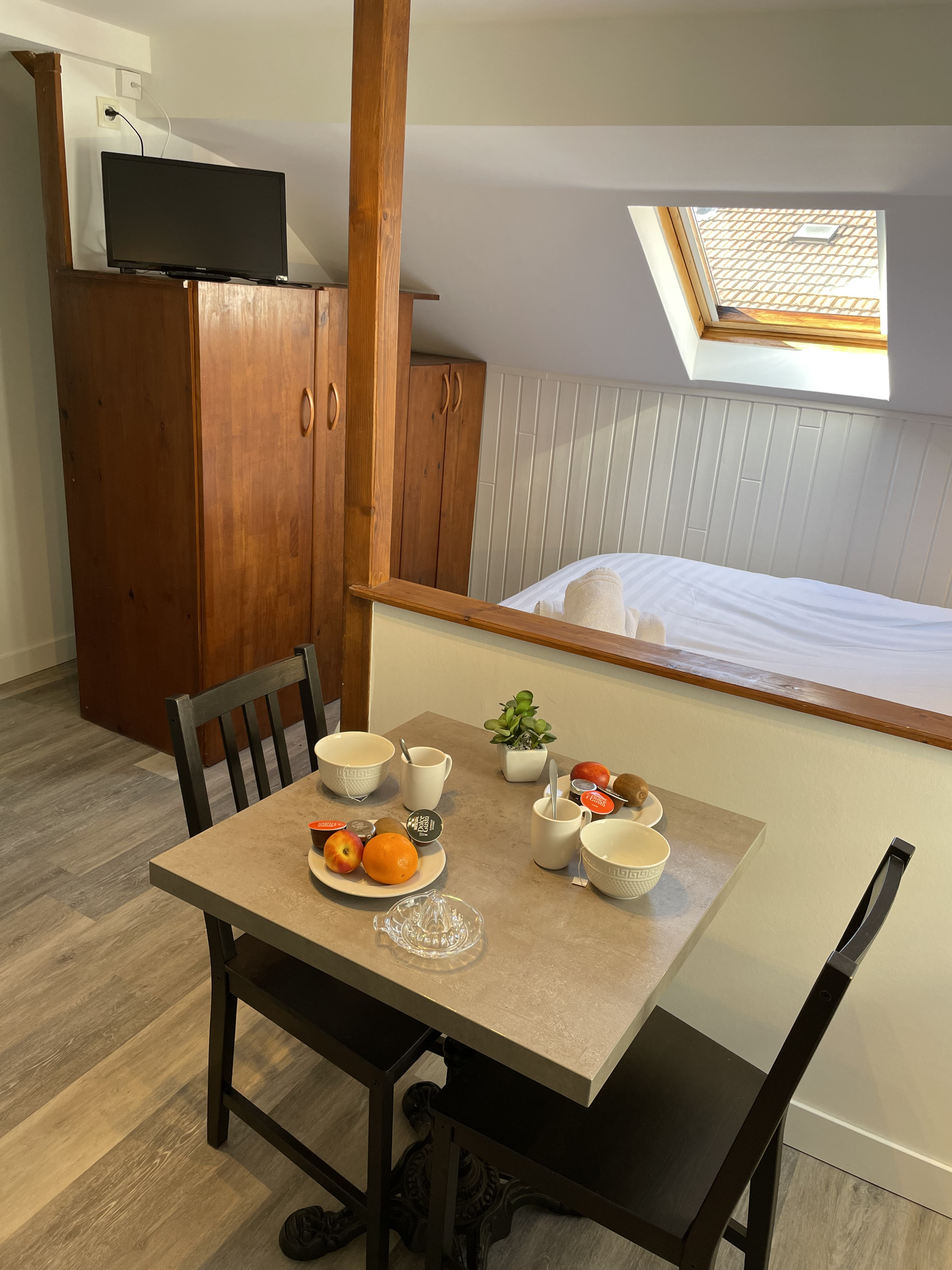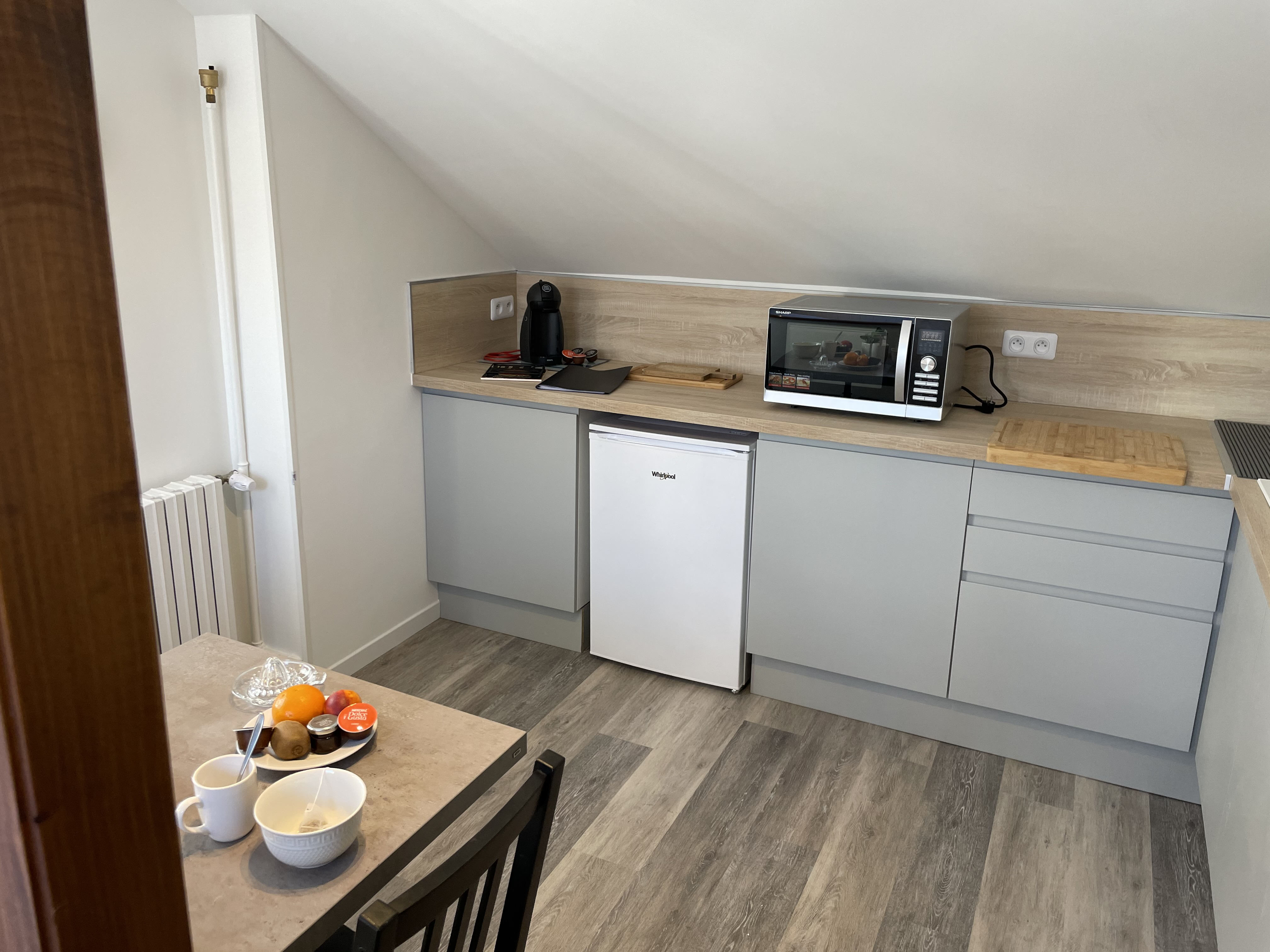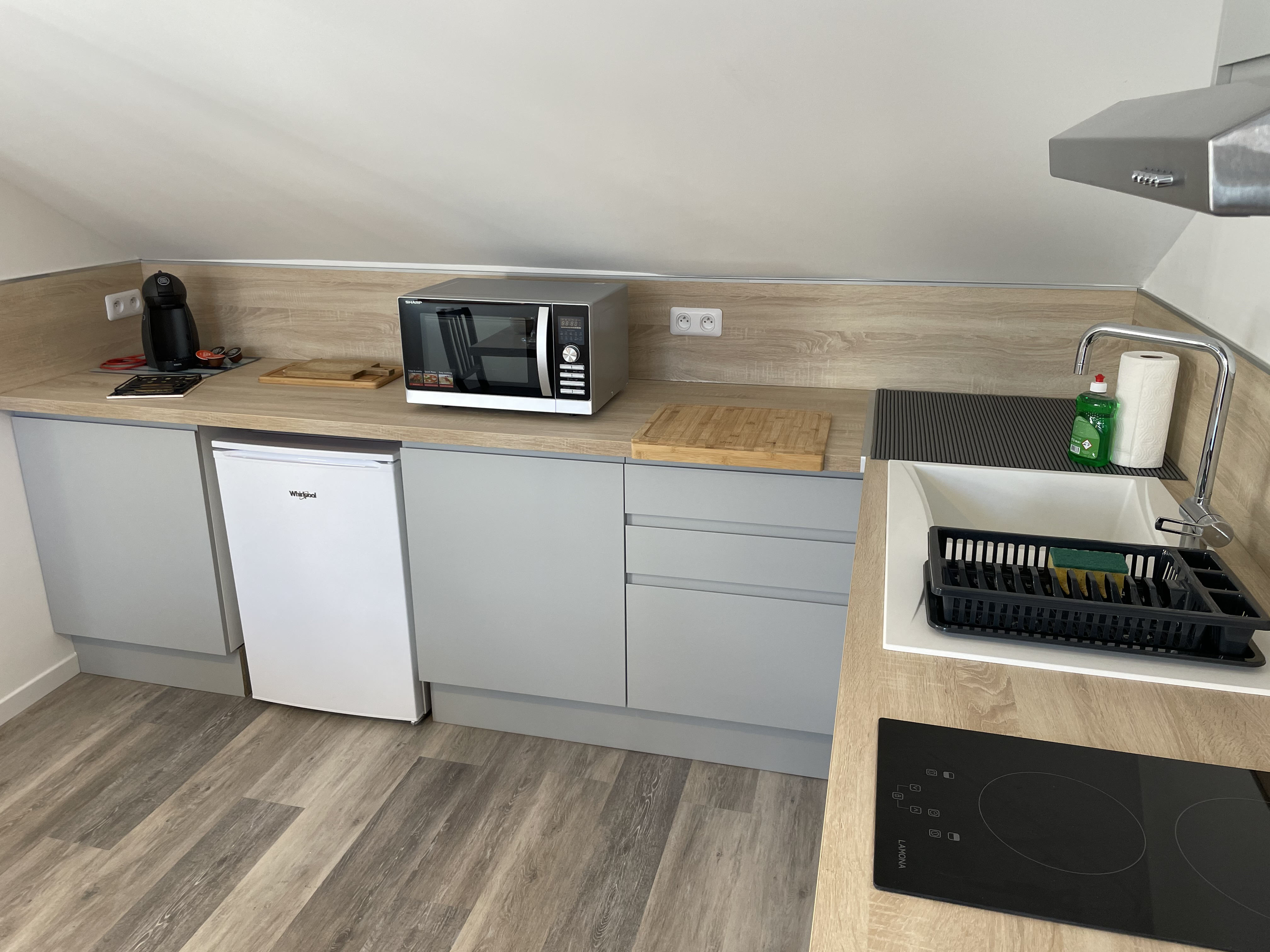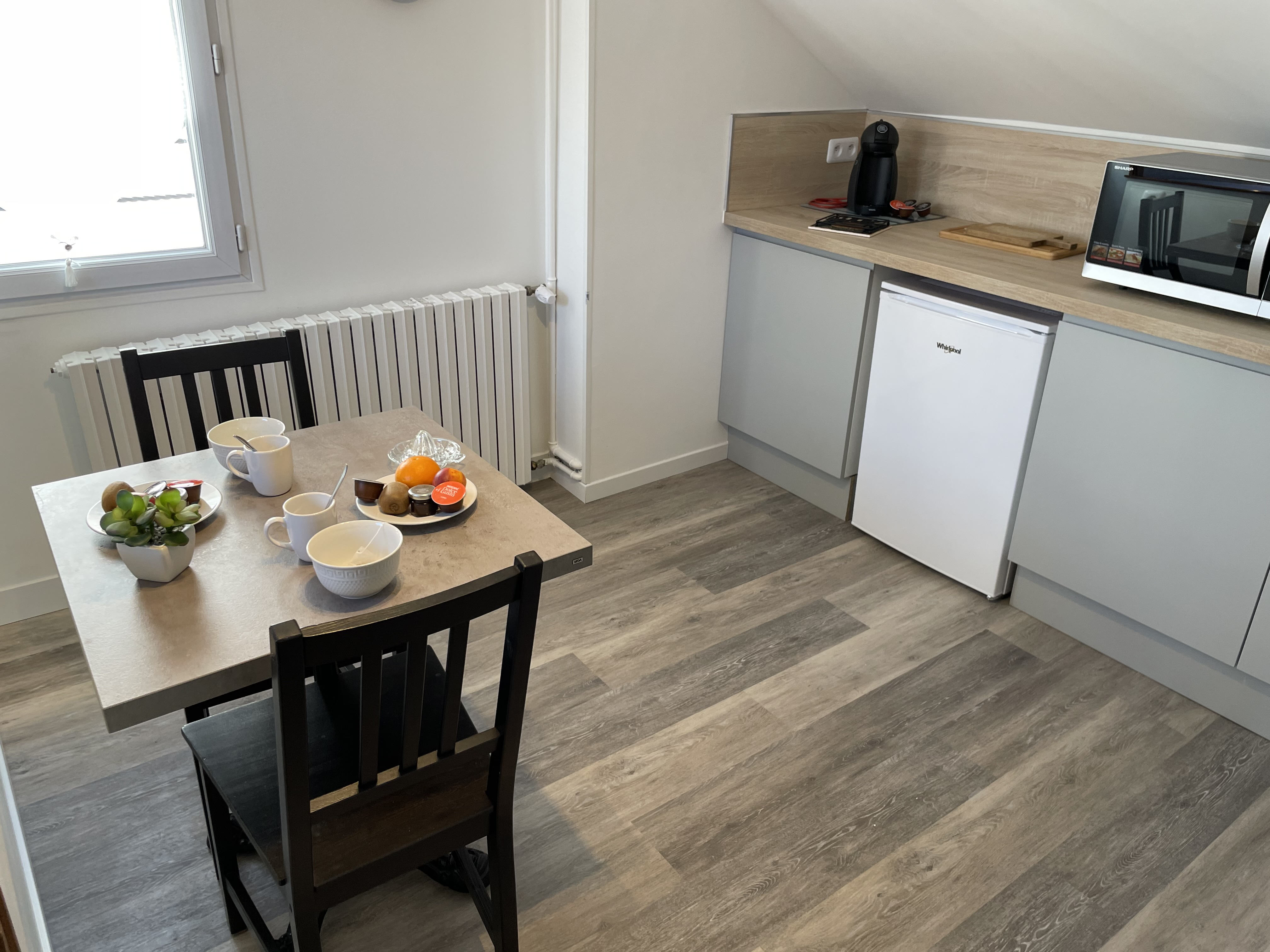 -COIN CUISINE EQUIPE (Sol : parquet / Murs : peinture et crédence) : éléments haut et bas, évier, égouttoir, plaque de cuisson vitrocéramique 2 feux, hotte aspirante, réfrigérateur table-top, four combiné micro-ondes, bouilloire, cafetière dolce gusto, grille-pain, vaisselles, ustensiles de cuisine et de cuisson, table et deux chaises, poubelle.