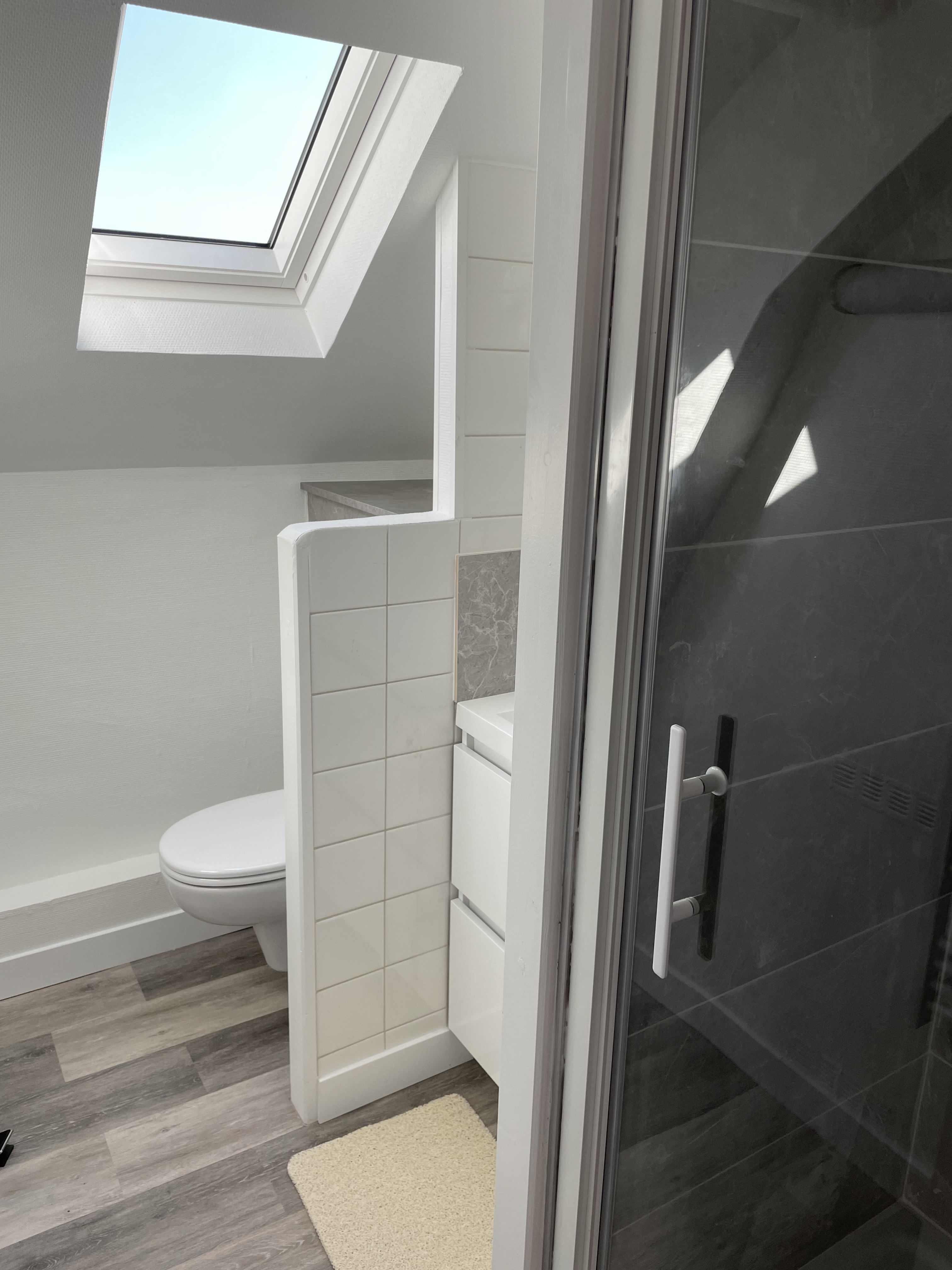 *SALLE D'EAU/WC (Sol : parquet / Murs : faïence et peinture) vasque, meuble sous vasque, miroir, radiateur sèche-serviettes, WC suspendu, poubelle de salle de bains, belle cabine de douche avec paroi vitrée.