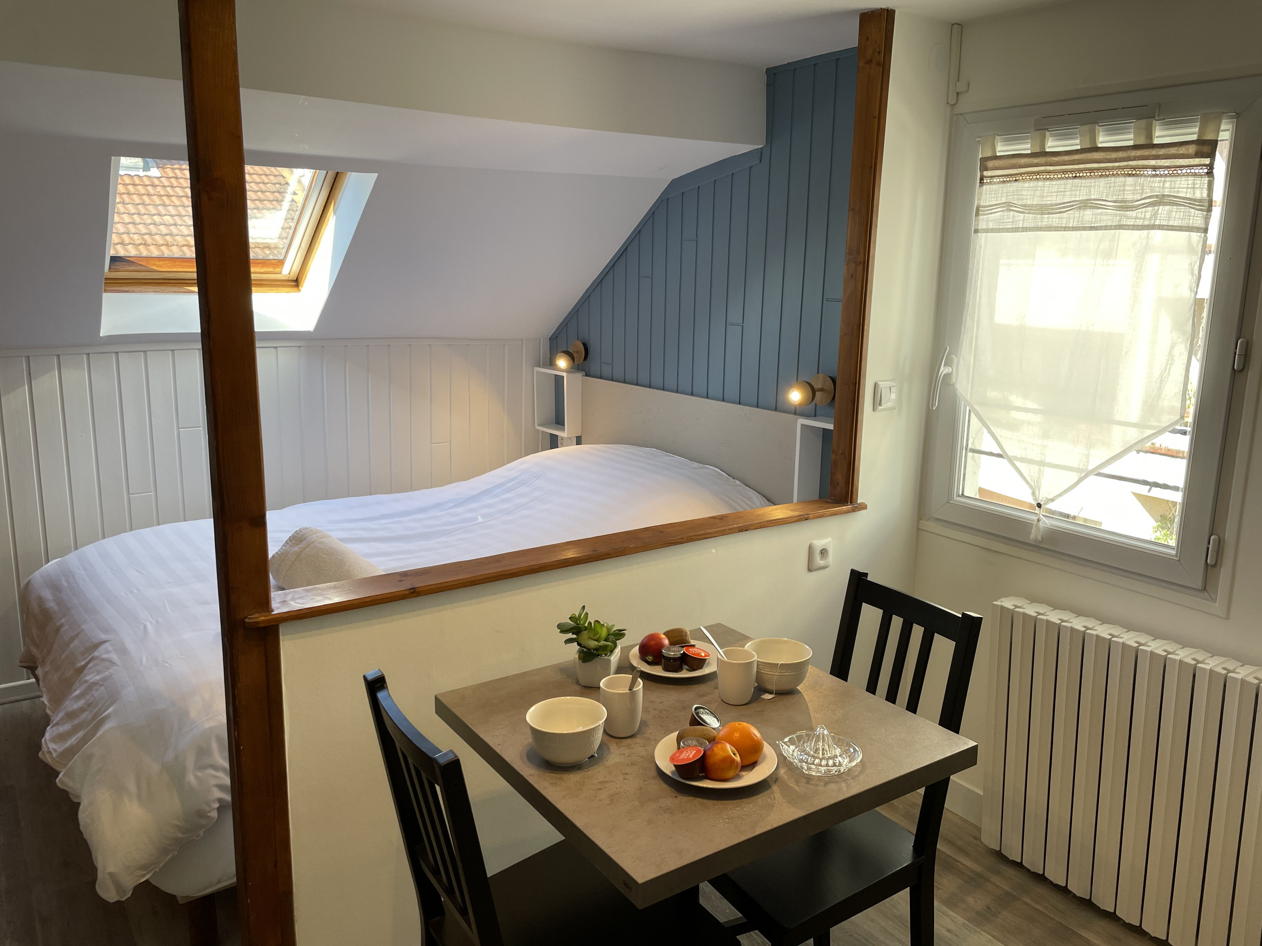 Dans une maison entièrement réhabilitée en 6 studios TOUT CONFORT, au 2ème et dernier étage sans ascenseur, coquet studio meublé et renové à neuf.