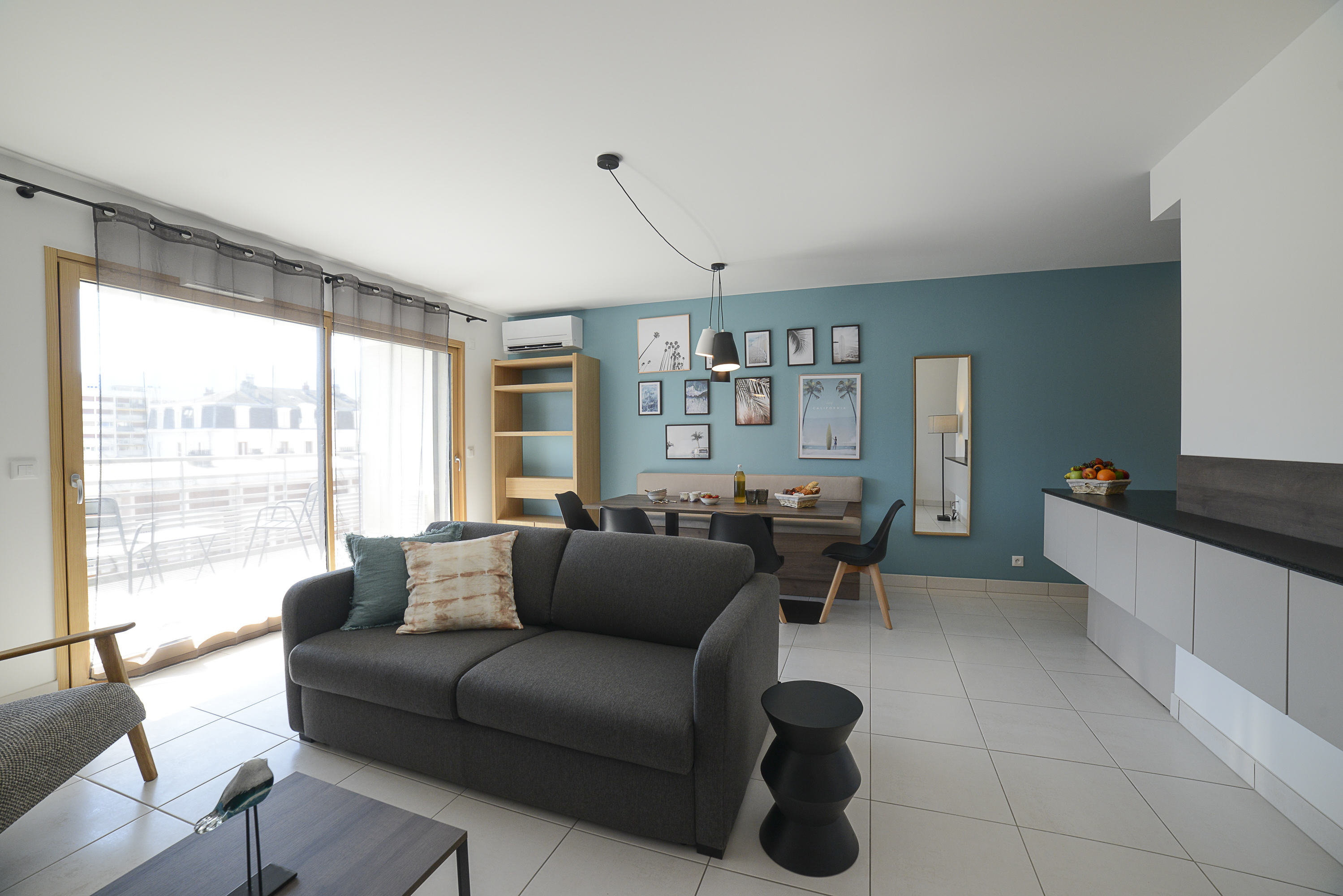 Au 4ème étage avec ascenseur de l'Exception, résidence de standing, neuve et sécurisée au coeur du centre-ville Aixois, lumineux appartement T3 climatisé de 70 m², prévu pour accueillir confortablement 1 à 6 personnes.