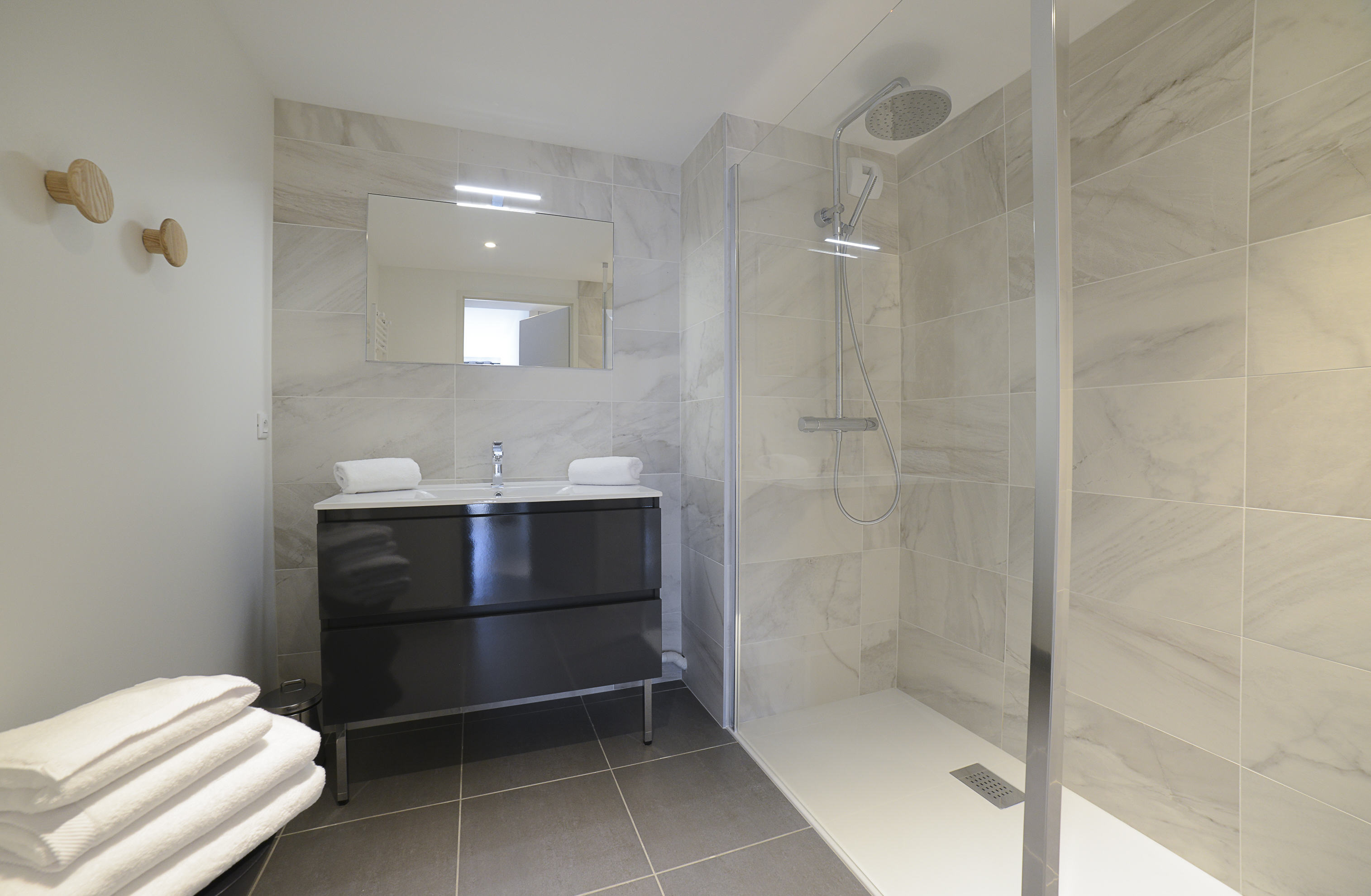 *SALLE D'EAU (Sol : carrelage / Murs : faïence et peinture) belle douche à l'italienne, lavabo grande vasque, sèche-cheveux, radiateur sèche-serviettes.