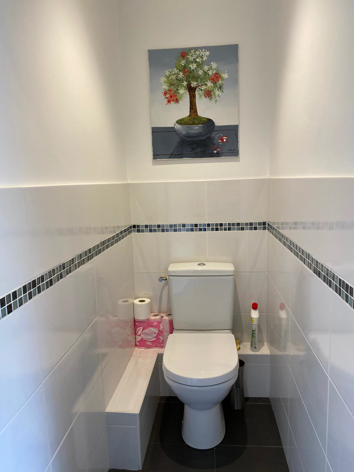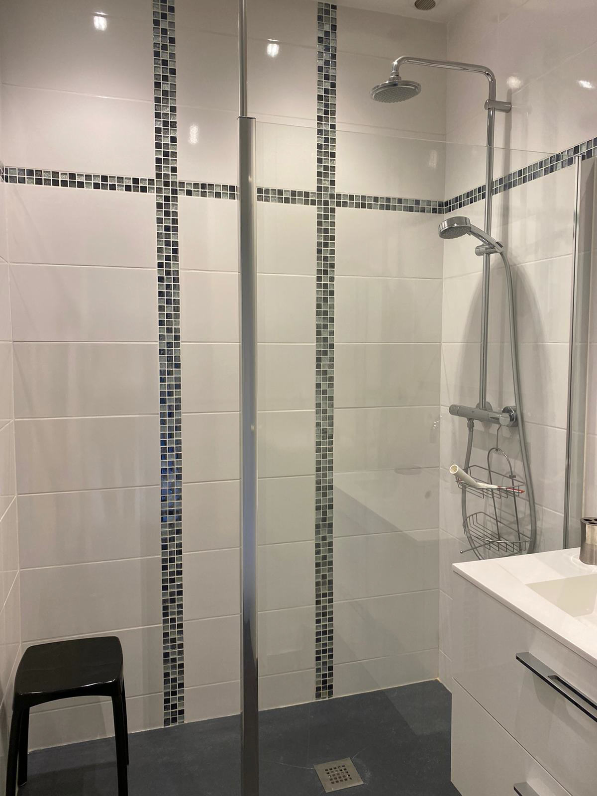 °SALLE D'EAU/WC (Sol : carrelage / Murs faïence) : lavabo, miroir, meuble sous vasque, cabine de douche, lave linge, sèche cheveux