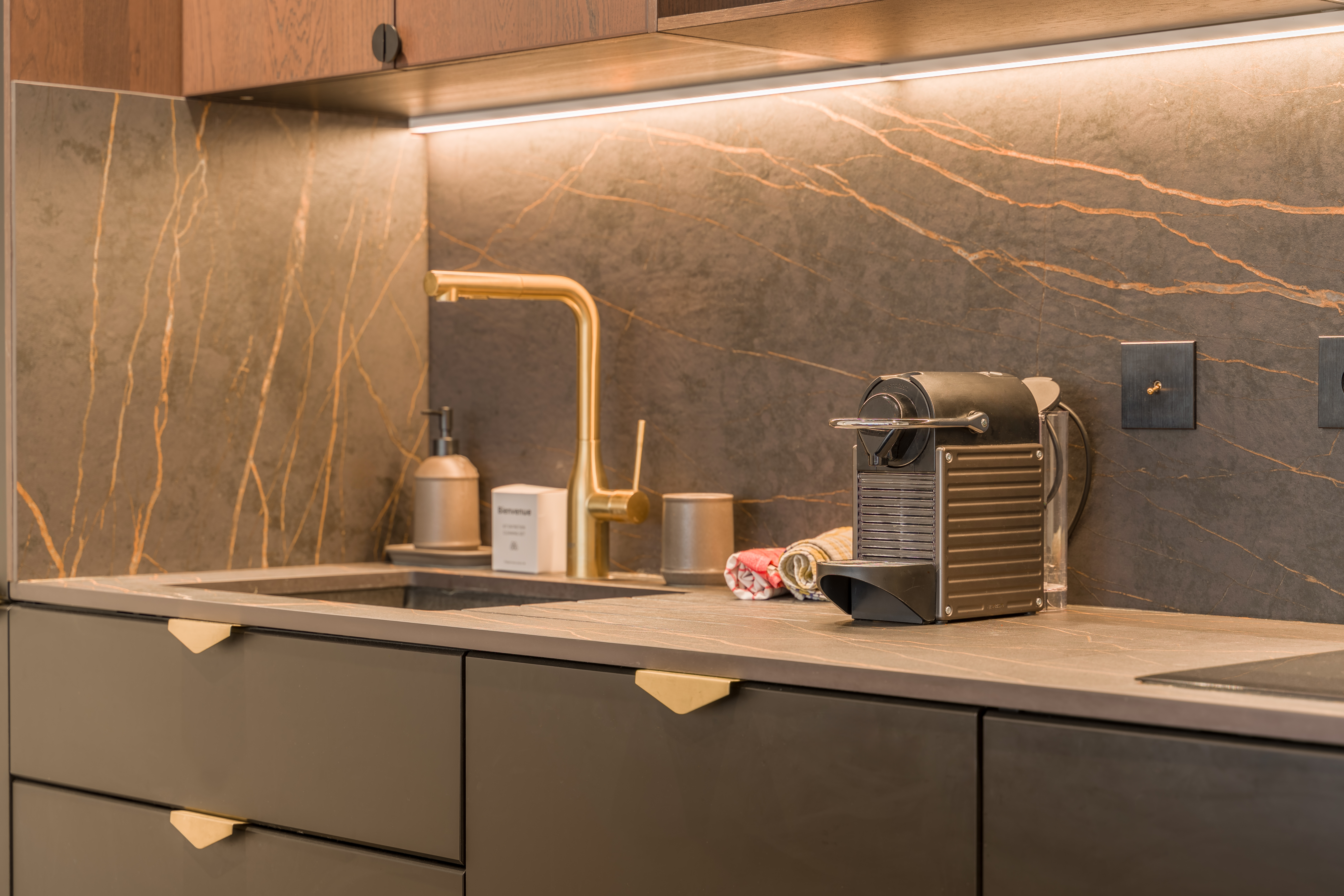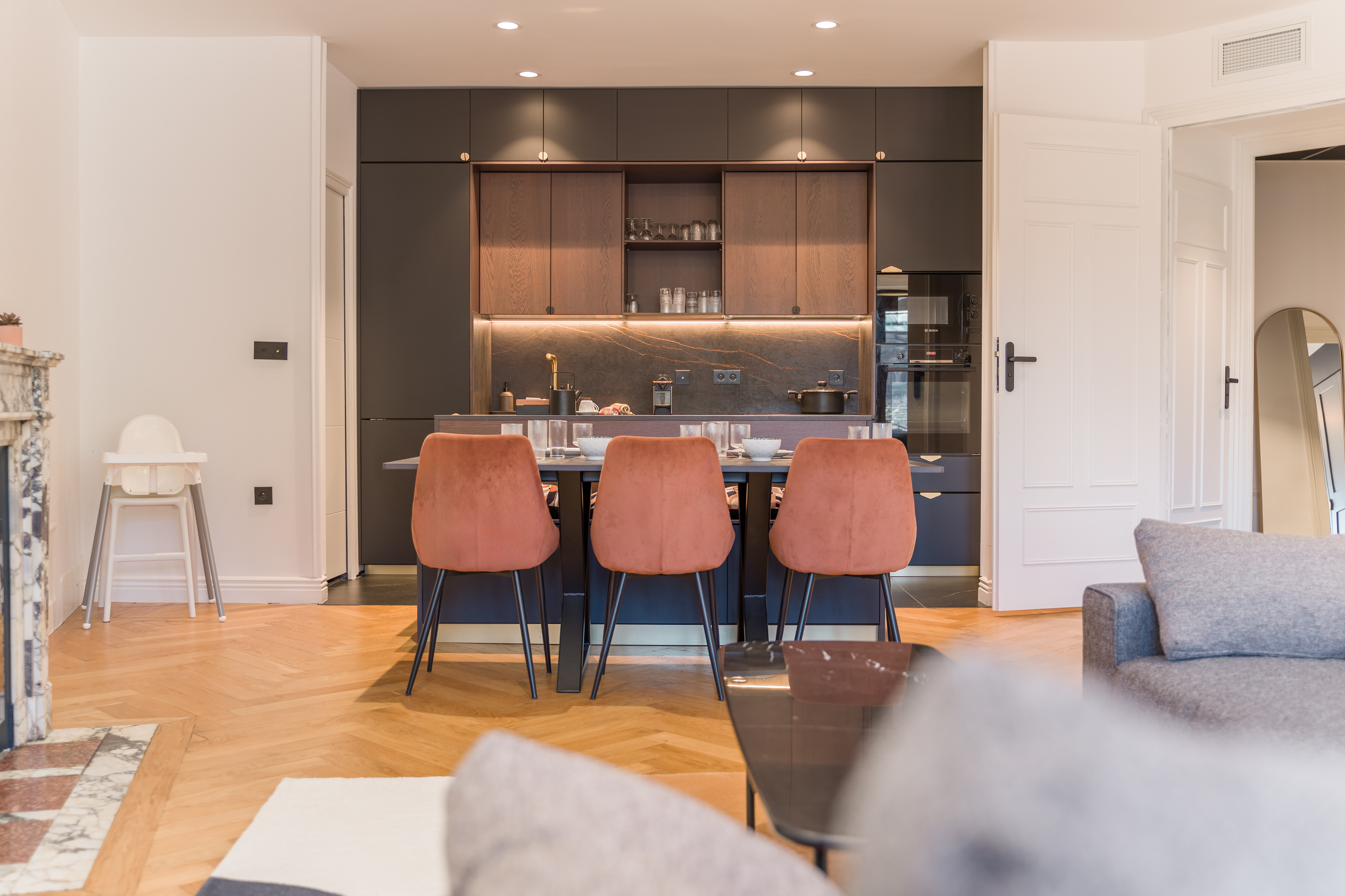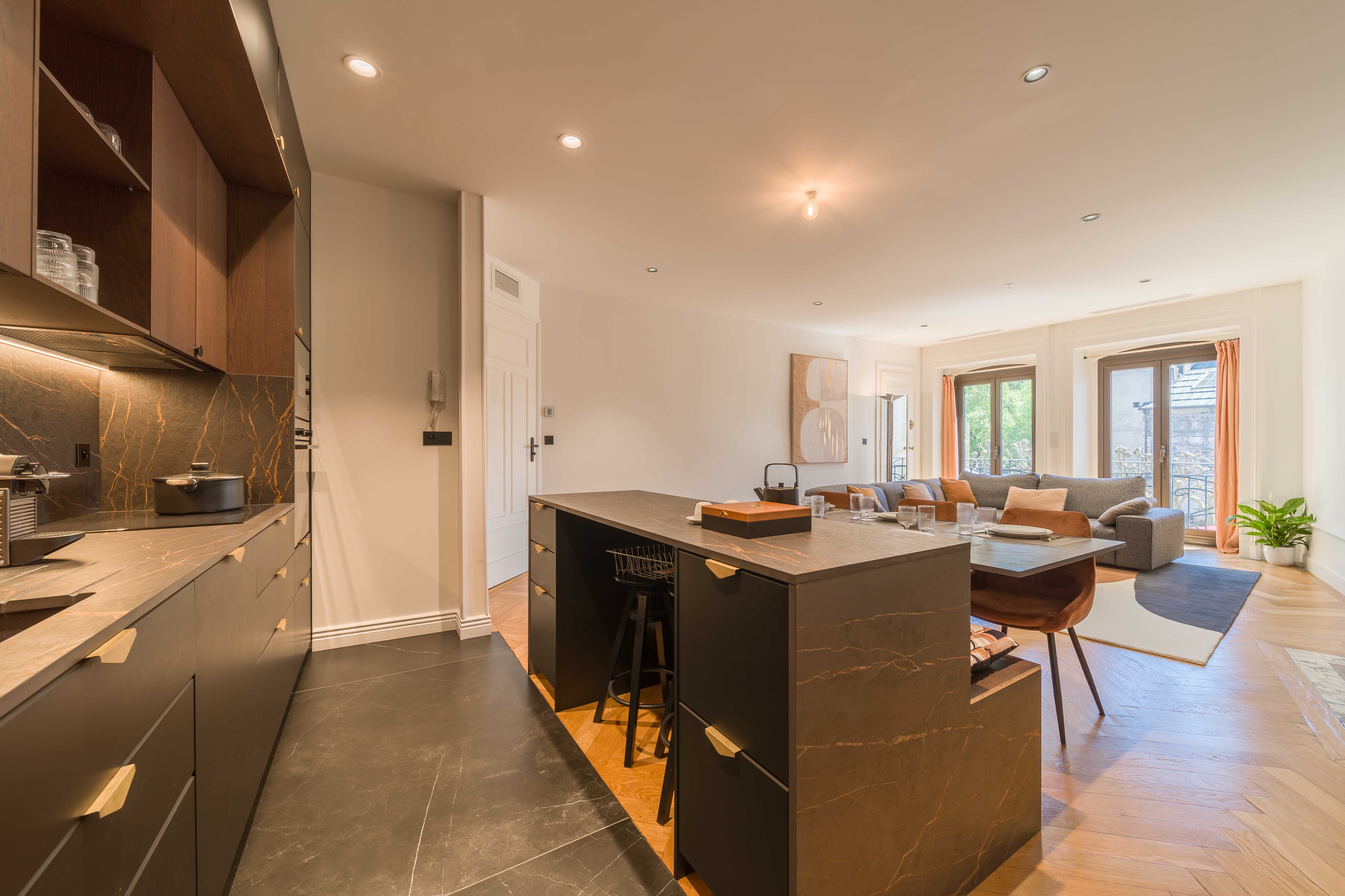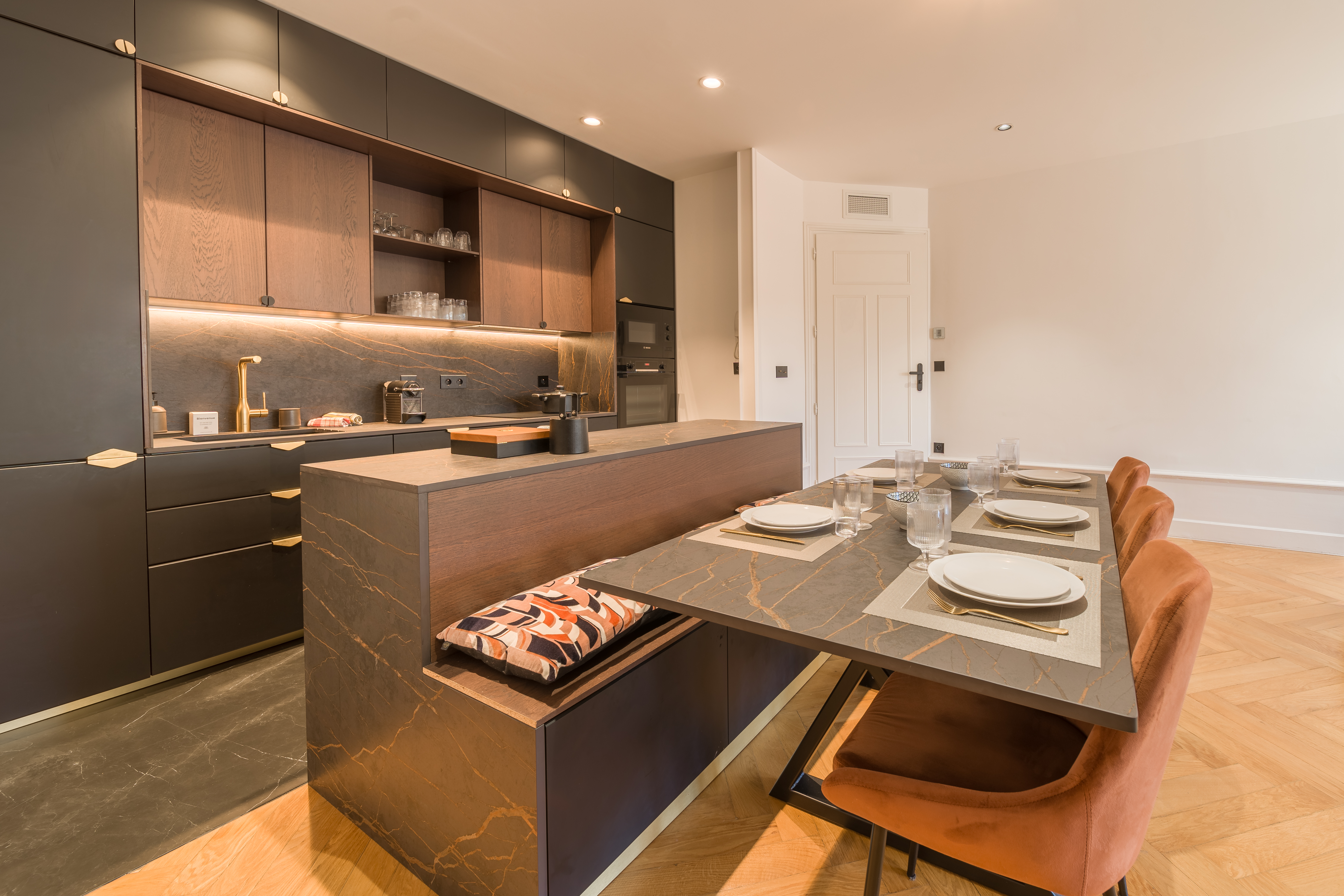 *Espace cuisine : éléments de cuisine haut et bas, lave-vaisselle, évier, micro-ondes, plaque de cuisson, hotte aspirante, four traditionnel, réfrigérateur/congélateur, bouilloire, cafetière Nespresso classique, grille-pain, vaisselles et ustensiles de cuisine et de cuisson, fer et table à repasser, aspirateur, nécessaire de nettoyage, lave-linge.