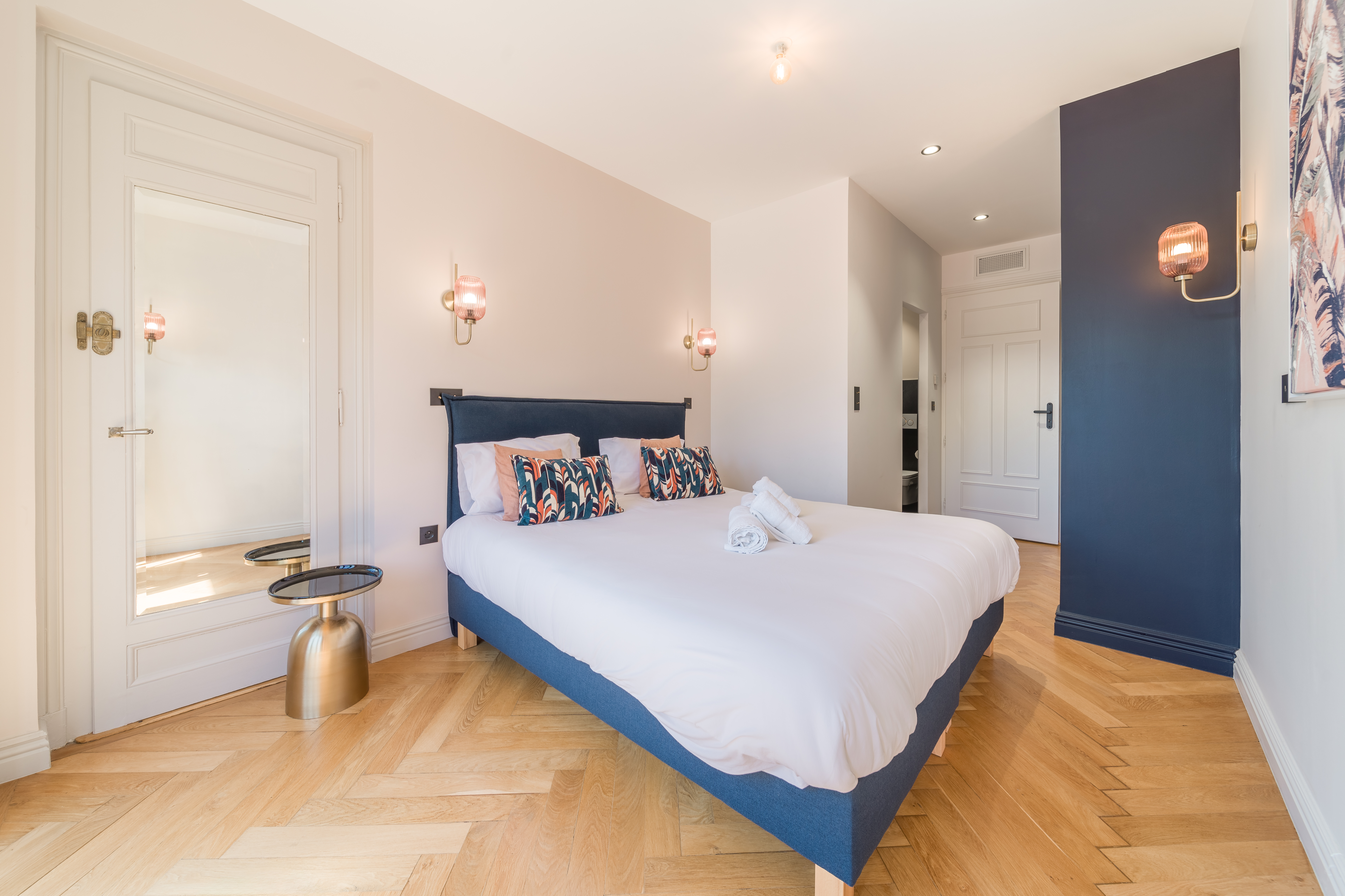 - MASTER ROOM (sol : carrelage/murs : peinture) : 2 lits 80x200 cm (ou 160x200 cm), oreillers et couette, 1 table et lampe de chevet, appliques murales, dressing, salle d'eau avec douche, vasque et meuble sous vasque, miroir, WC suspendu.
