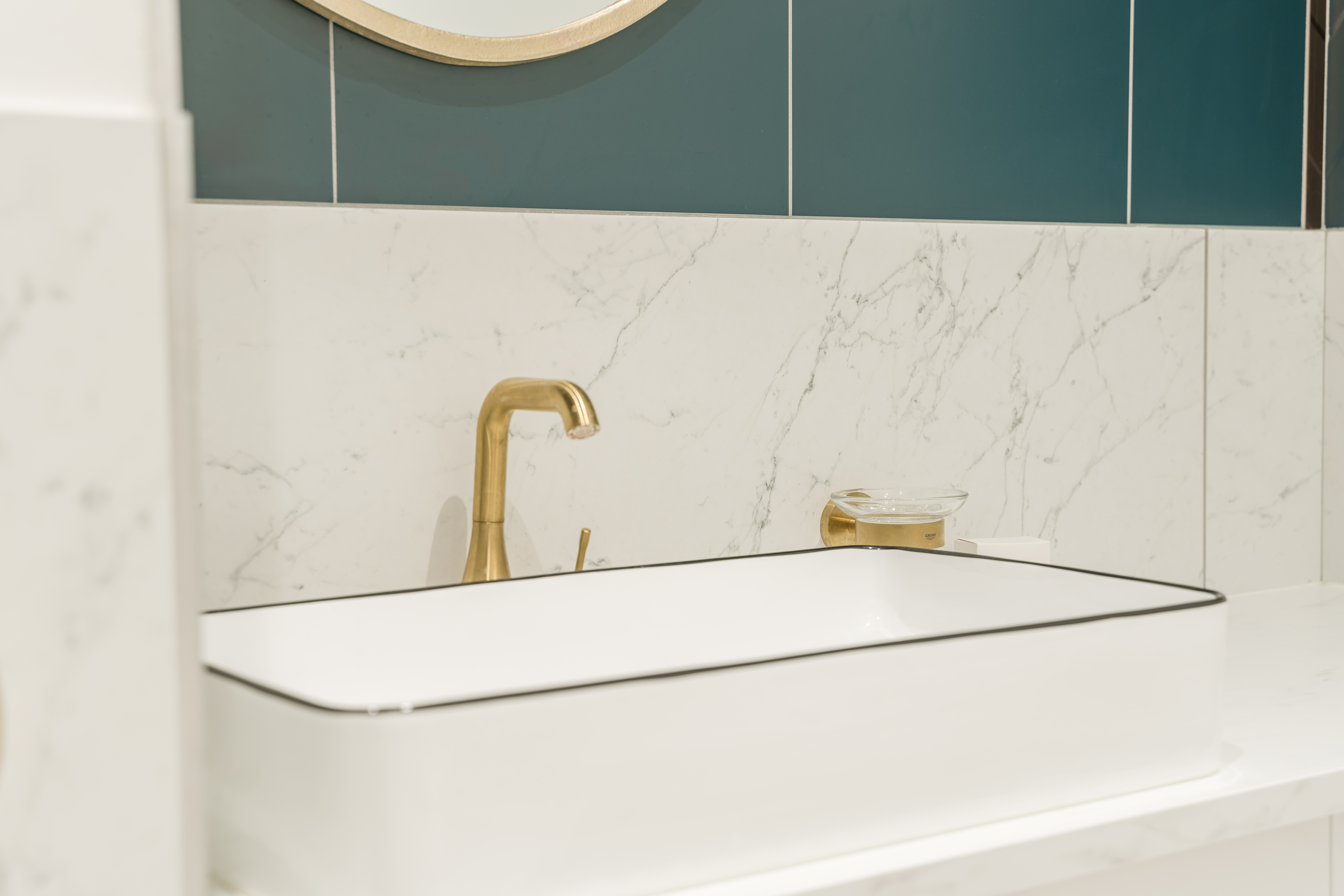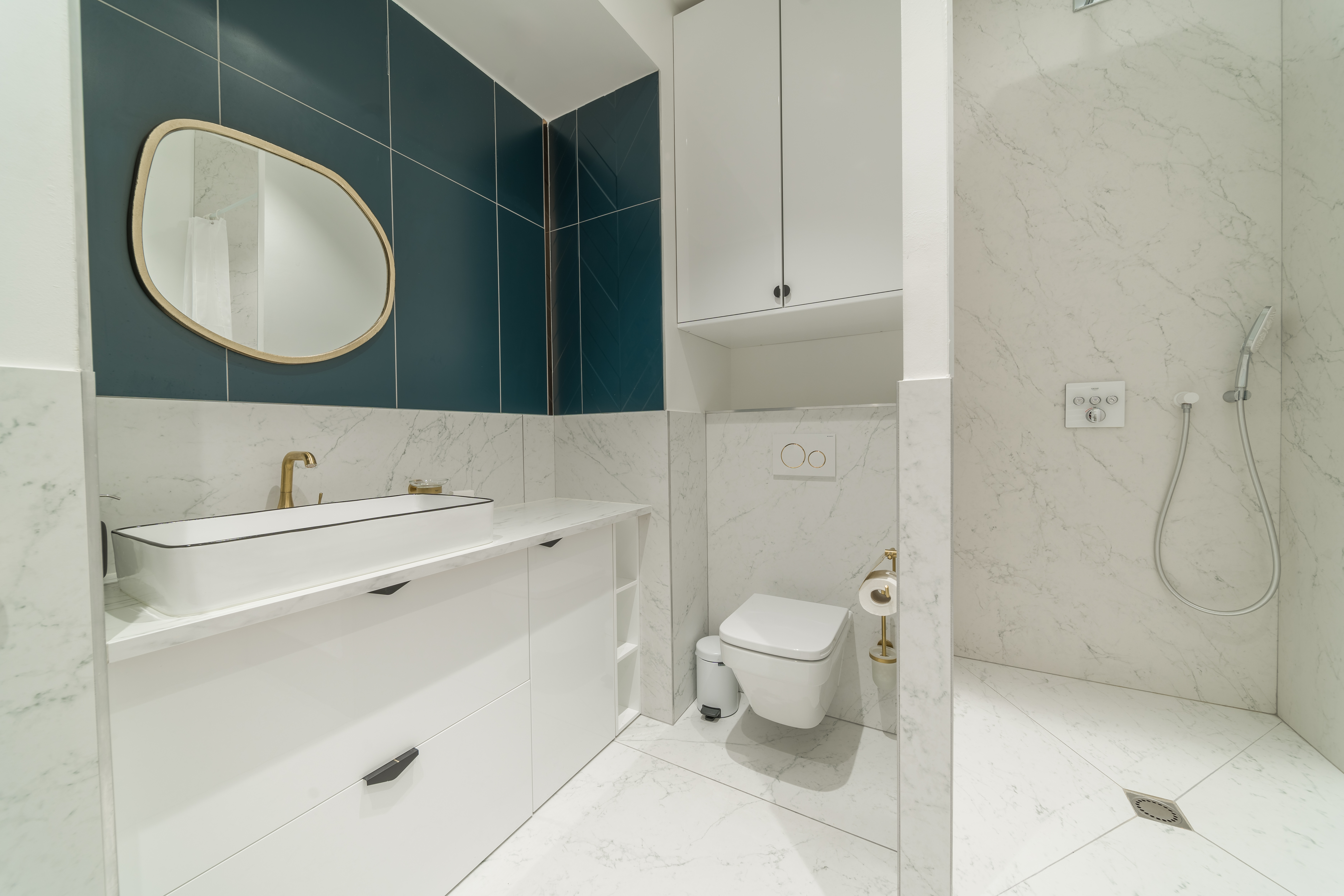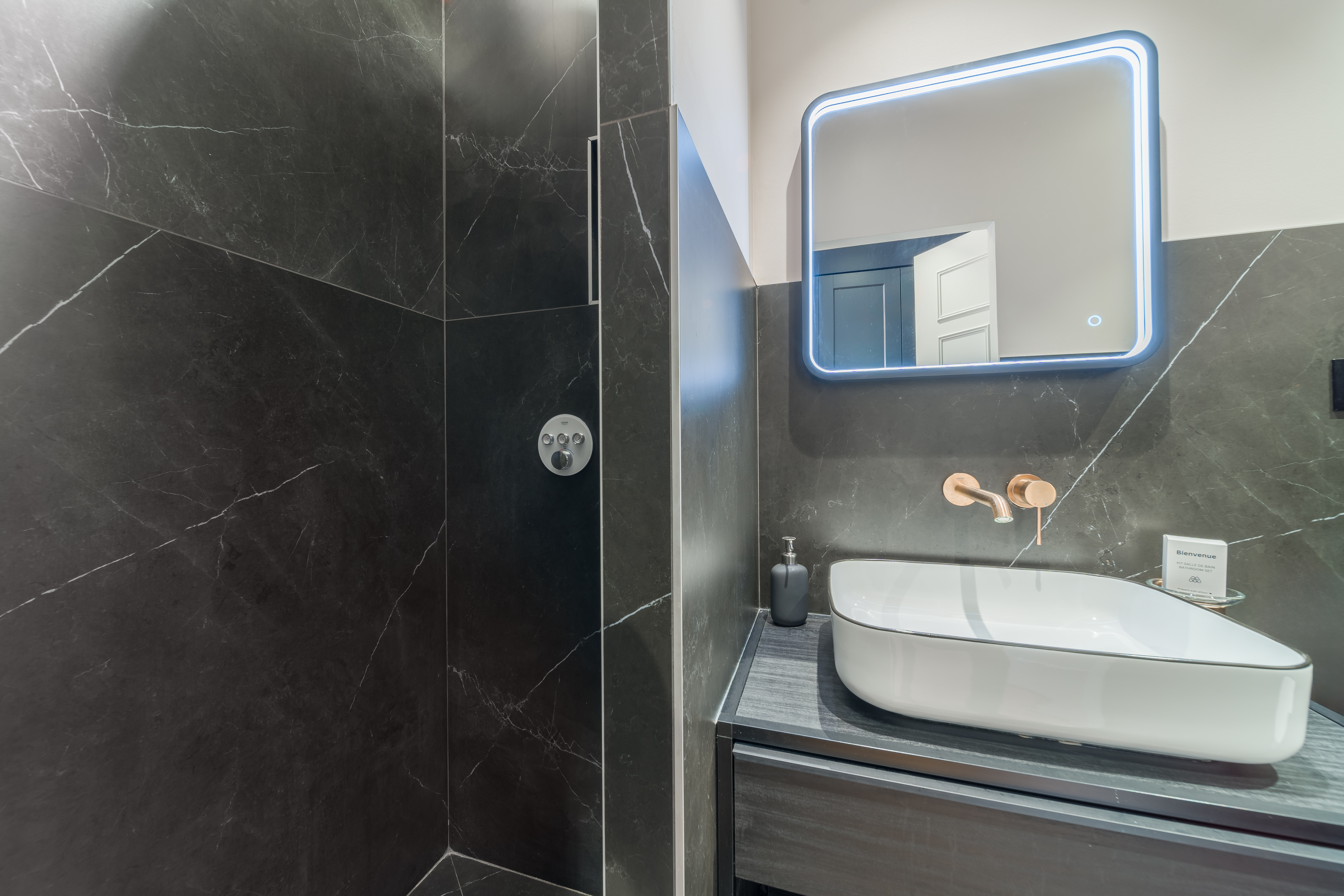 - SALLE D'EAU/WC (sol : carrelage/murs : carrelage et peinture) : douche, vasque et meuble sous vasque, sèche-cheveux, rangement, WC suspendu.
